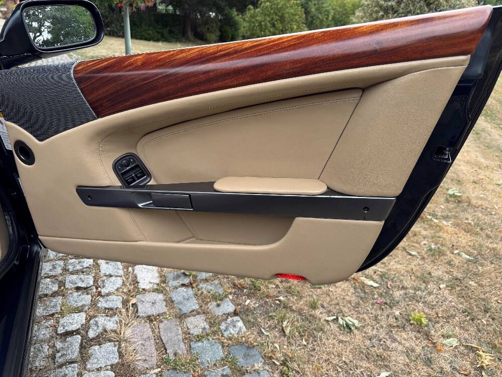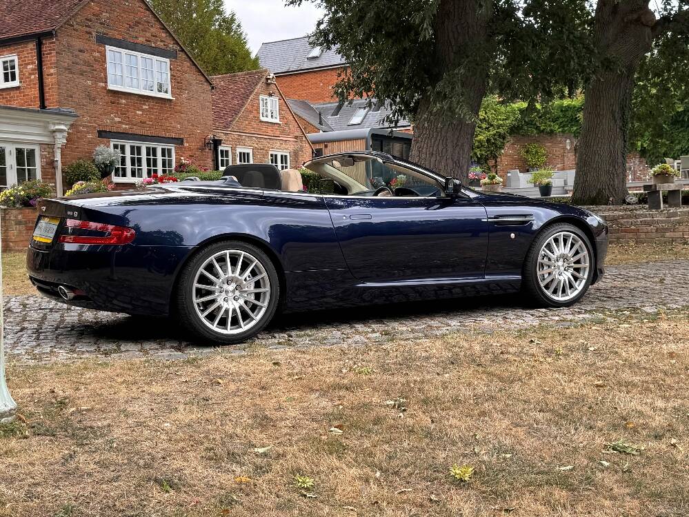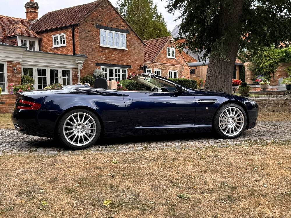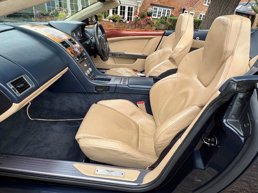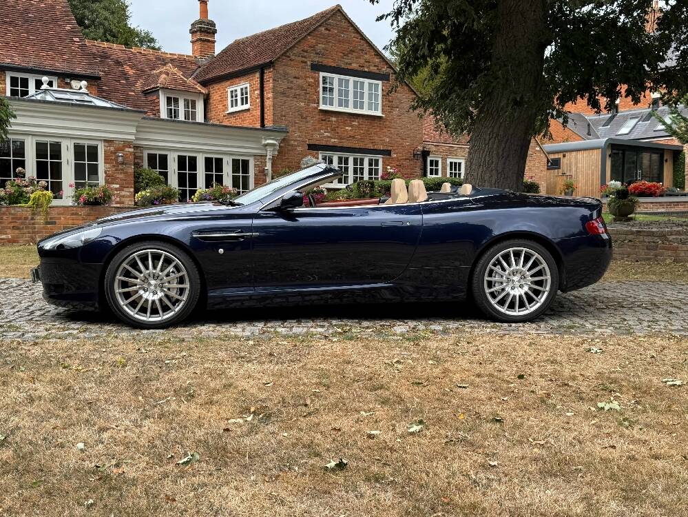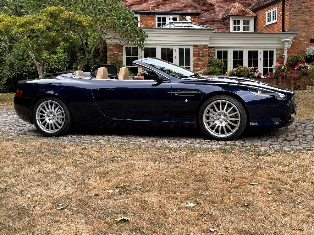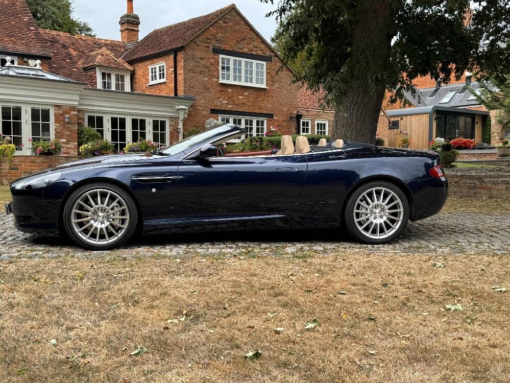 2006 Aston Marin DB9 Volante, finished in Midnight blue with contrasting Sandstorm hide interior with best quality dark blue Wilton carpet throughout. In addition, it has Walnut veneers to the centre console and door cappings, all of which are in lovely condition.. This is a beautiful, well-kept and well serviced example that has had only 3 previous keepers in 19 years. The mileage covered is just over 36,000, which is “Just Run-in” for the V12 5.9 litre Aston Engine and therefore still performing perfectly. The mileage is backed up by the DVLA MOT records, together with a stamped-up service book containing 15 service stamps and a number of corresponding service invoices. Fitted with the more desirable, paddle-shift automatic transmission making this car extremely easy to drive. It has the benefit of 19” multi spoke, sports alloy wheels shod with the correct Bridgestone Potenza speed rated tyres, all of which are in excellent condition. In addition, it has heated electric seats with lumbar support, Powerfold mirrors, fitted wind deflector, an indoor car cover, a battery charger, and an electric tyre inflator. This superb DB9, now represents exceptional value for money for one in this condition at only £31,950. It comes with a 6 month warranty for added peace of mind.