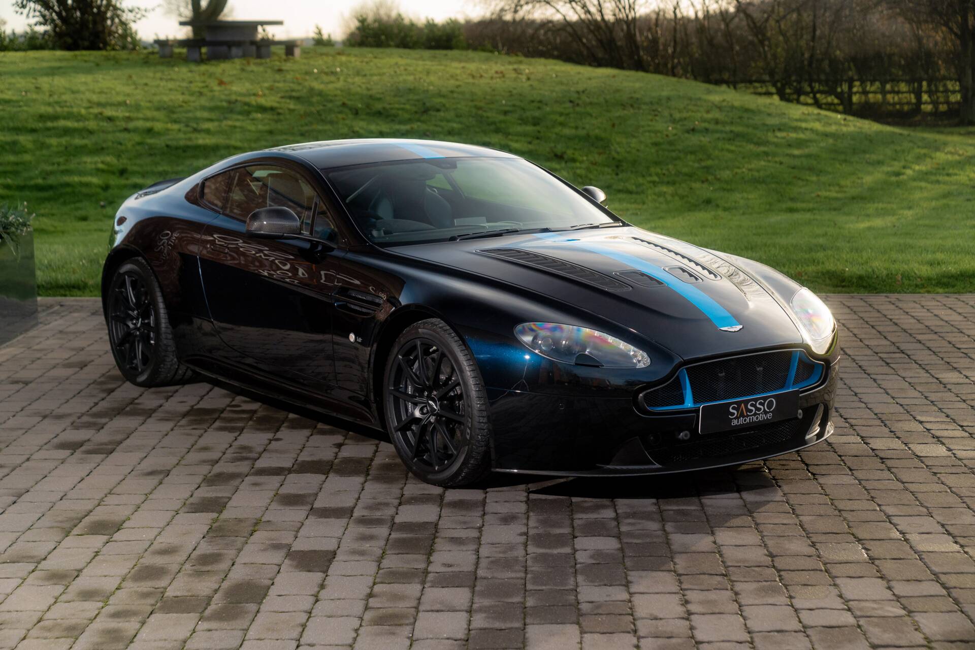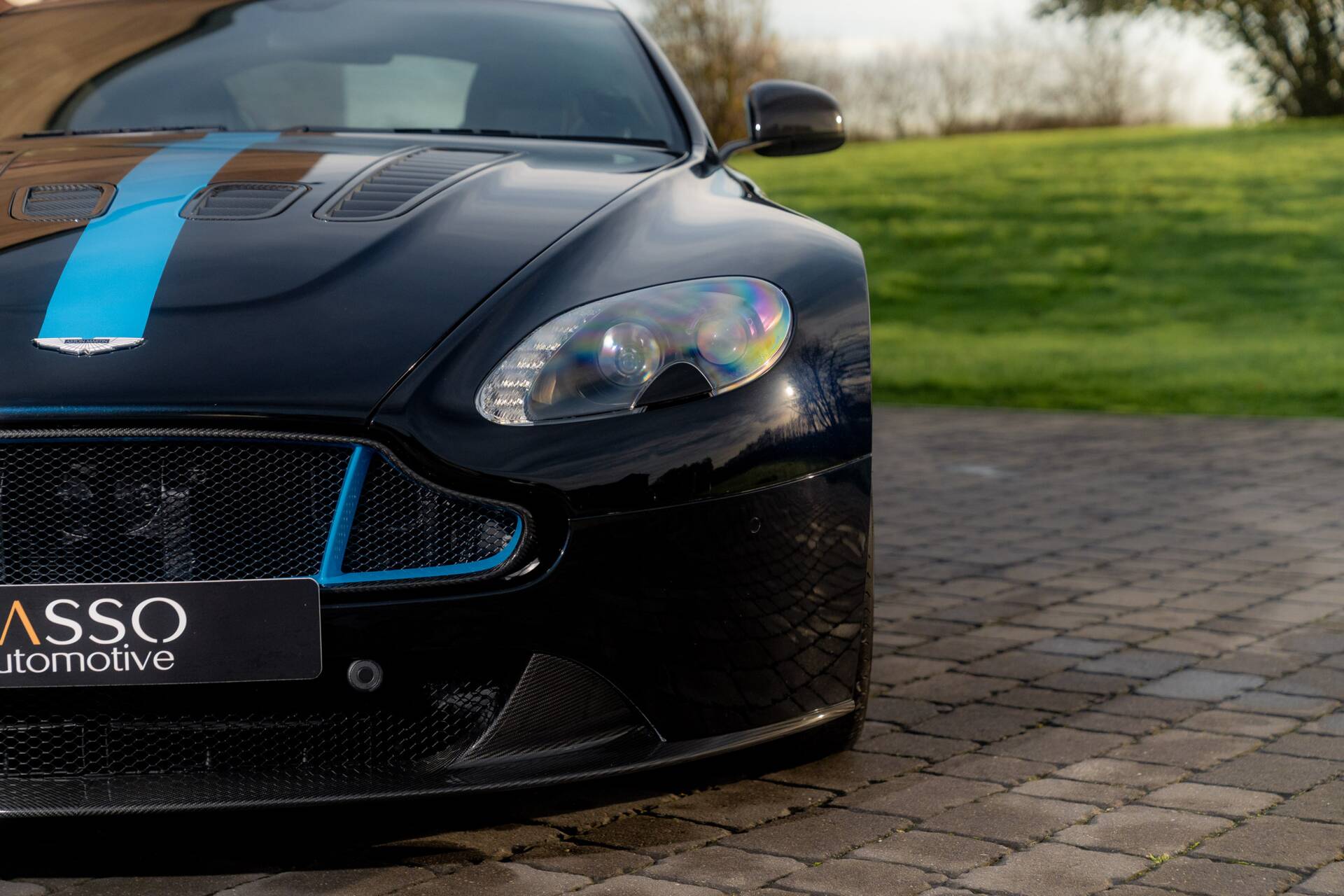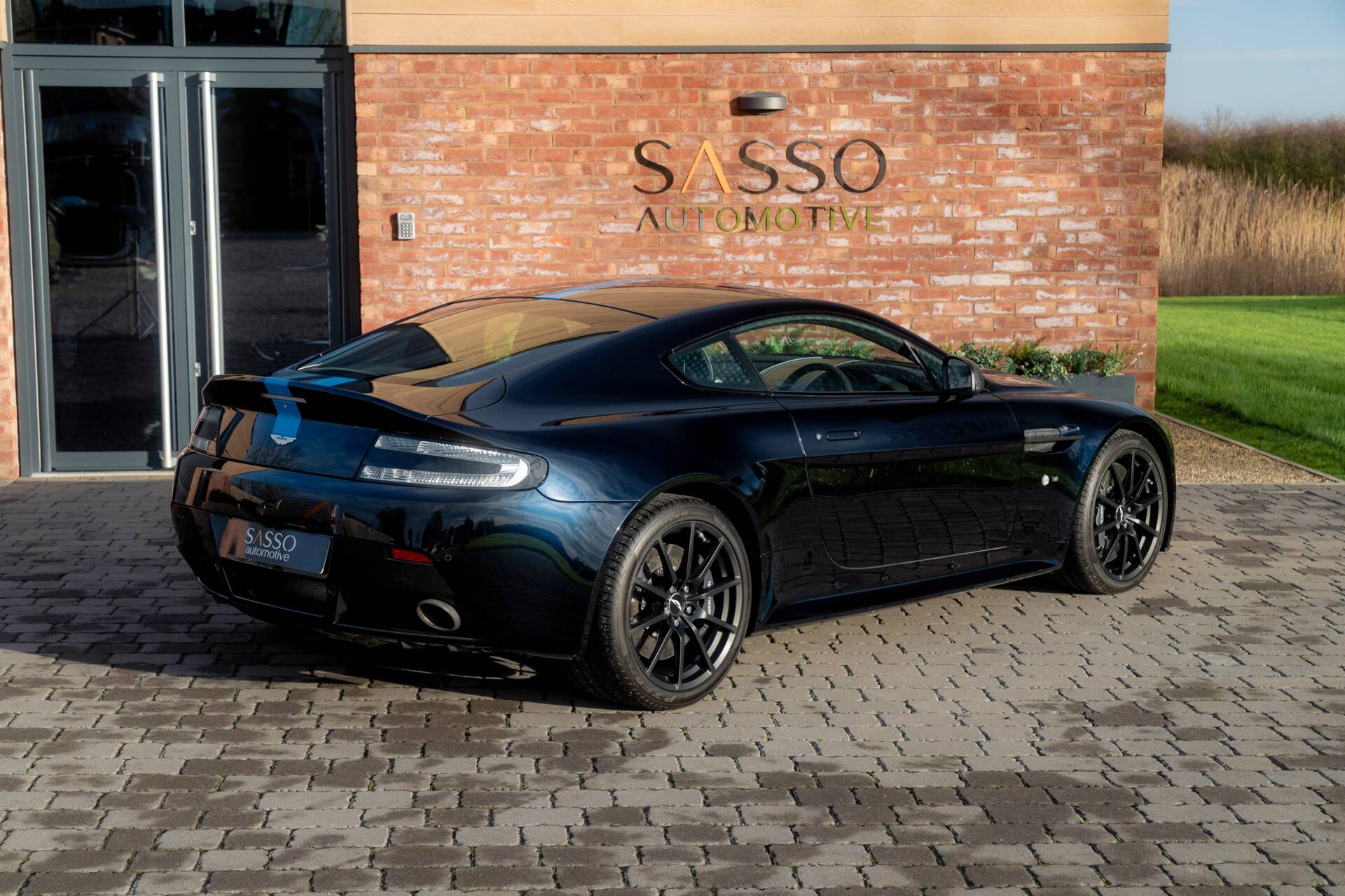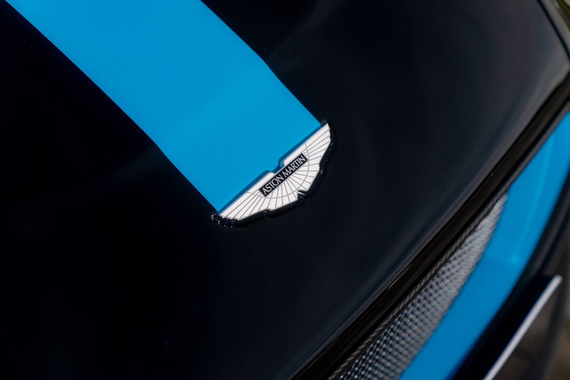 At Sasso Automotive, we are delighted to offer this exceptional, ultra low-mileage Aston Martin V12 Vantage AMR, finished in the striking Ultramarine Black with a factory painted racing stripe. Ultramarine Black is a deep, saturated blue black that shifts beautifully with the light appearing almost black in the shade, yet revealing shimmering metallic blue highlights in sunlight. This dynamic, atmospheric finish is one of Aston Martin’s sought after Q series colours, chosen for its refined presence and dramatic visual depth.