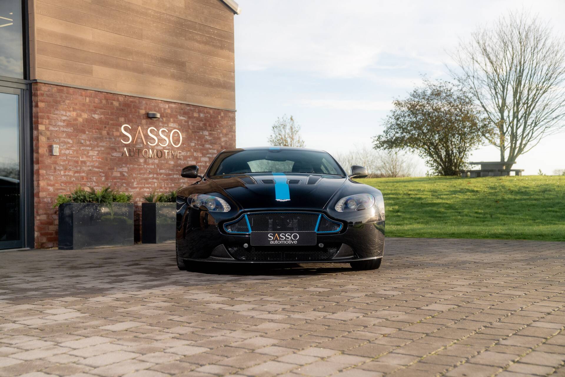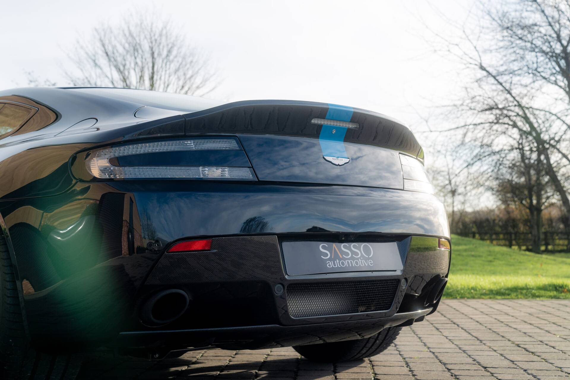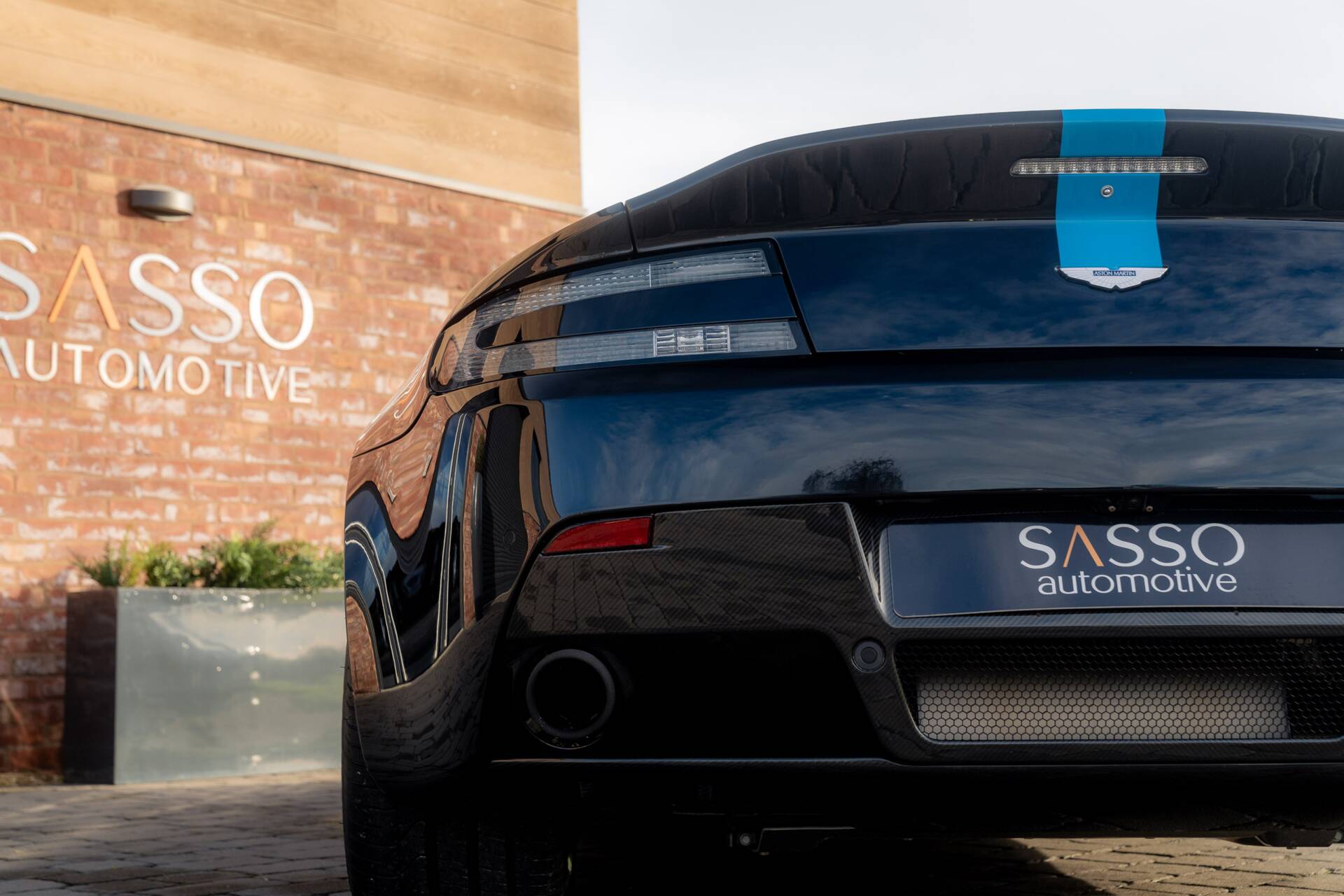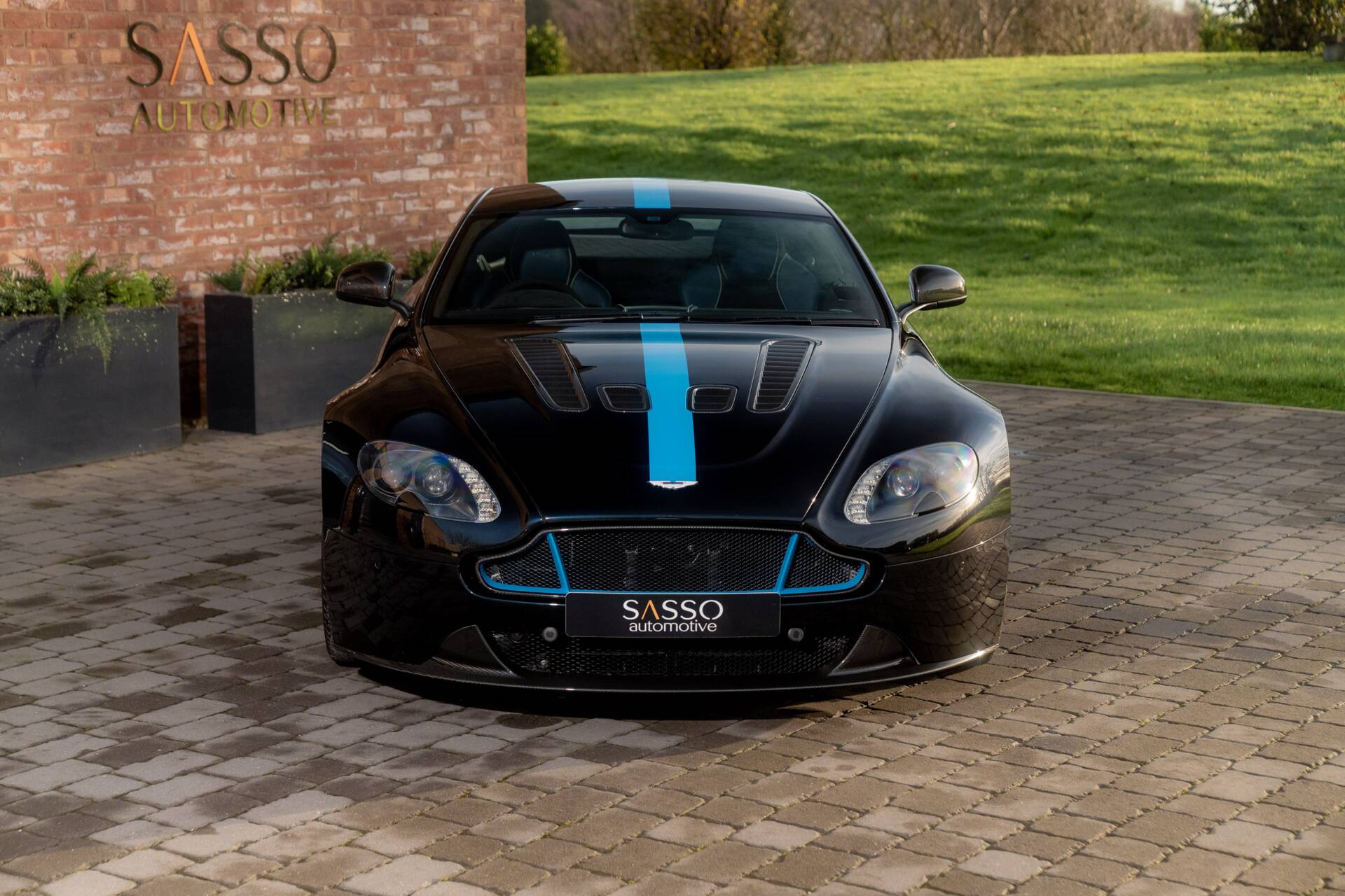 At Sasso Automotive, we are delighted to offer this exceptional, ultra low-mileage Aston Martin V12 Vantage AMR, finished in the striking Ultramarine Black with a factory painted racing stripe. Ultramarine Black is a deep, saturated blue black that shifts beautifully with the light appearing almost black in the shade, yet revealing shimmering metallic blue highlights in sunlight. This dynamic, atmospheric finish is one of Aston Martin’s sought after Q series colours, chosen for its refined presence and dramatic visual depth.