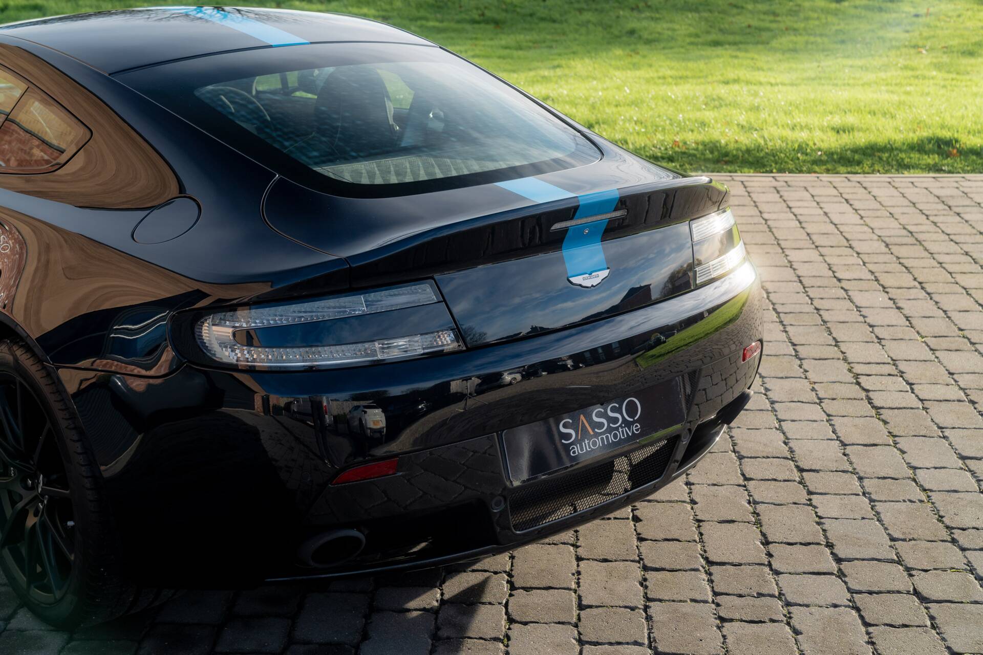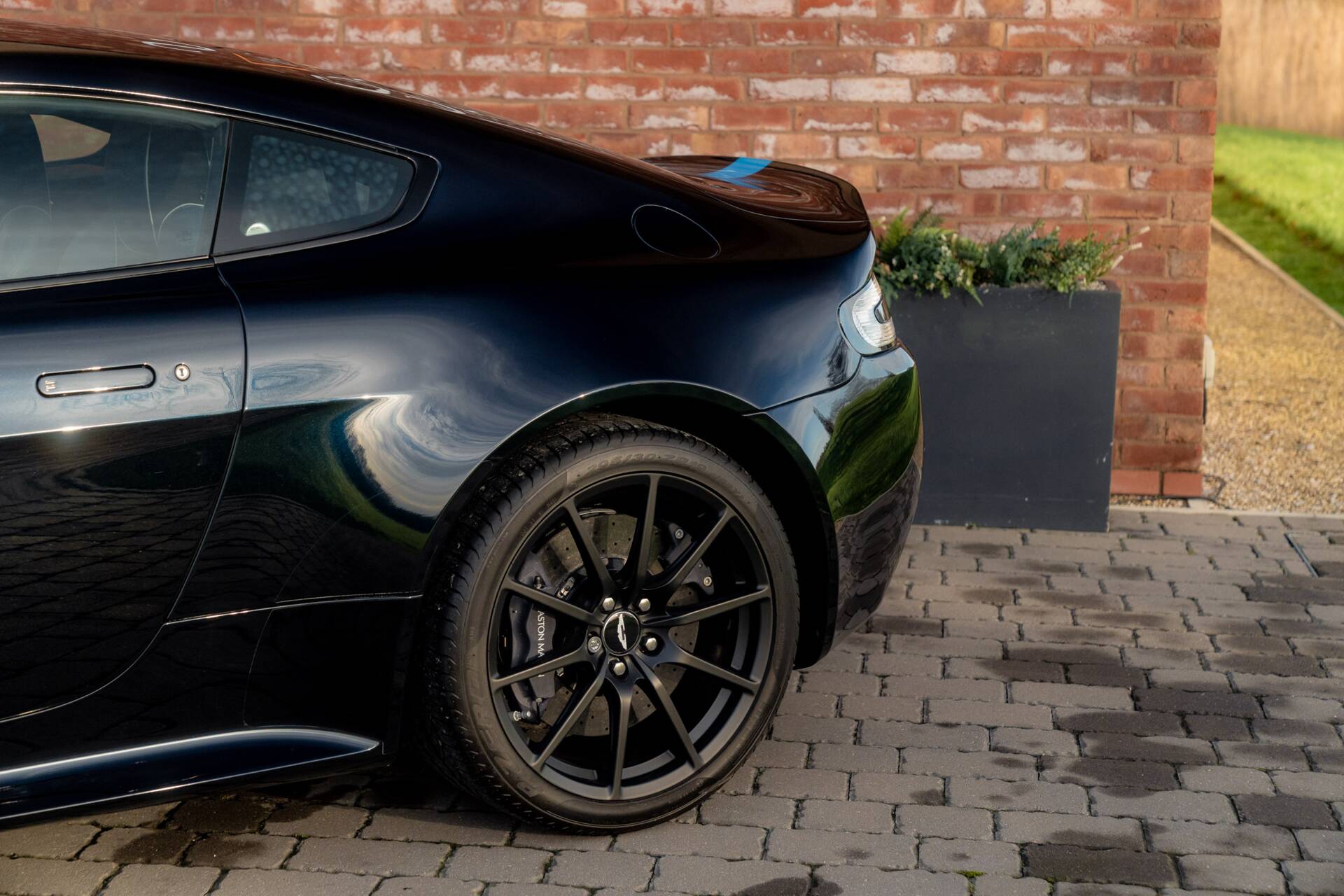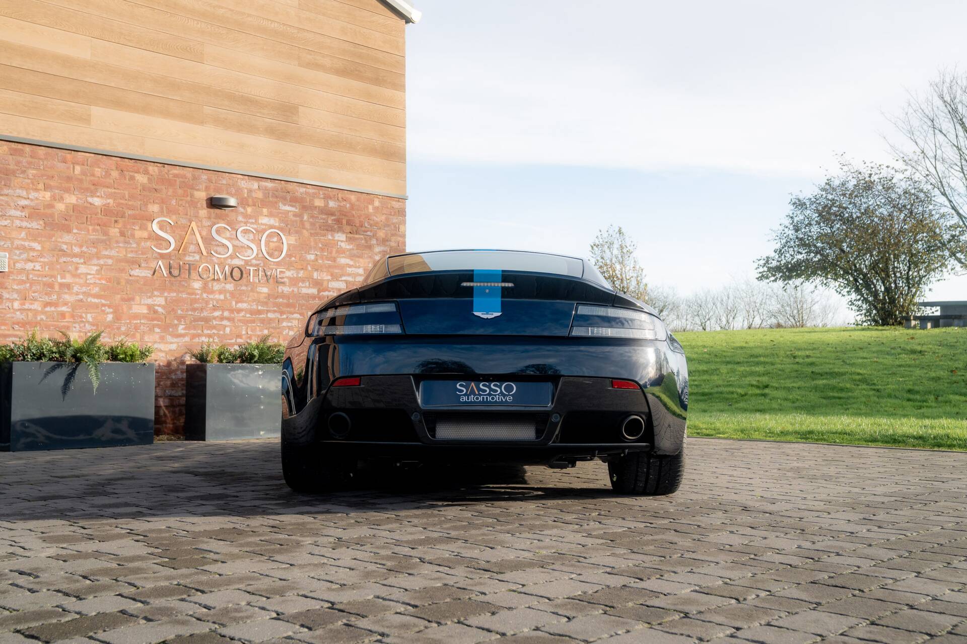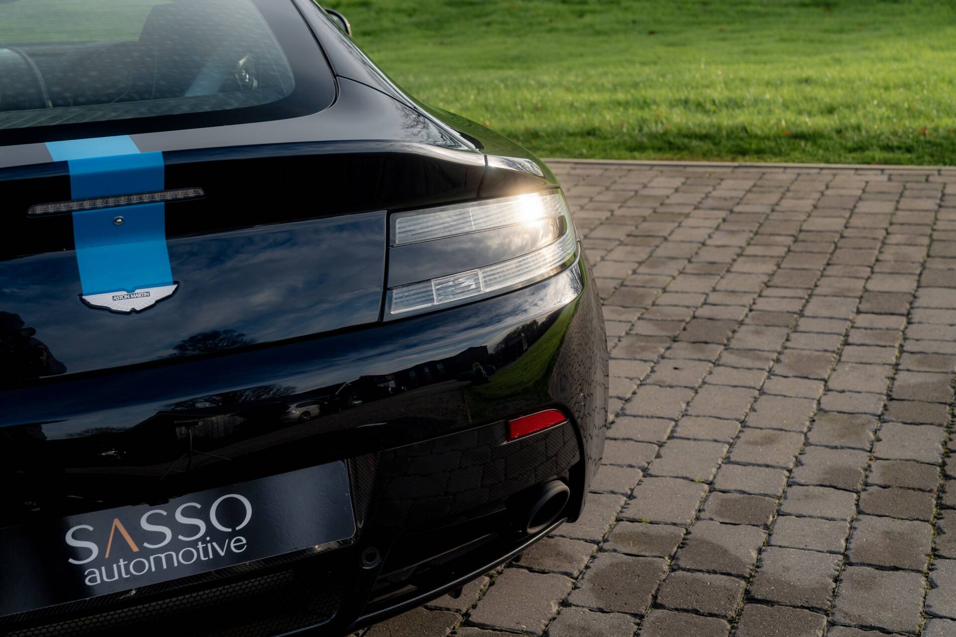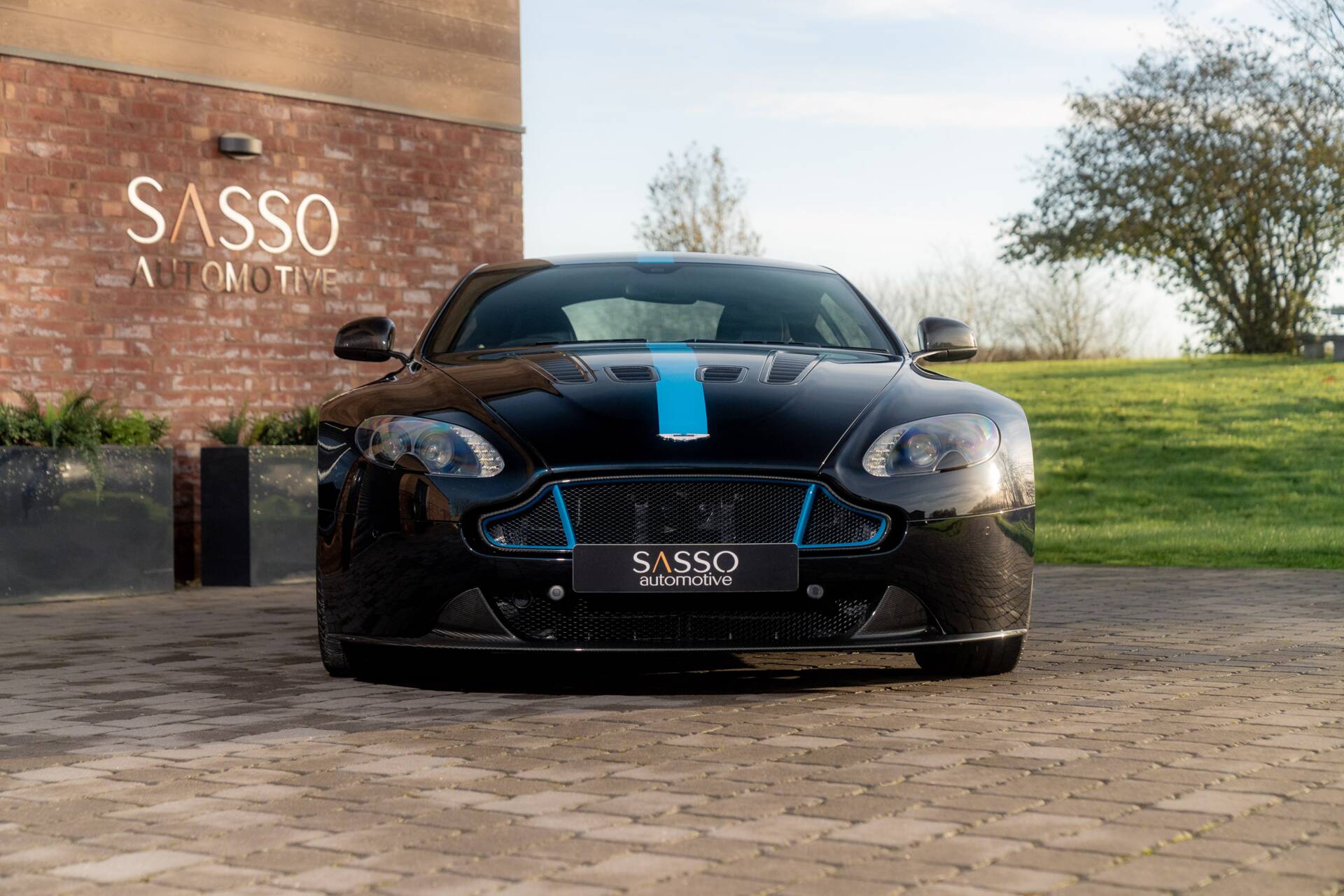 At Sasso Automotive, we are delighted to offer this exceptional, ultra low-mileage Aston Martin V12 Vantage AMR, finished in the striking Ultramarine Black with a factory painted racing stripe. Ultramarine Black is a deep, saturated blue black that shifts beautifully with the light appearing almost black in the shade, yet revealing shimmering metallic blue highlights in sunlight. This dynamic, atmospheric finish is one of Aston Martin’s sought after Q series colours, chosen for its refined presence and dramatic visual depth.