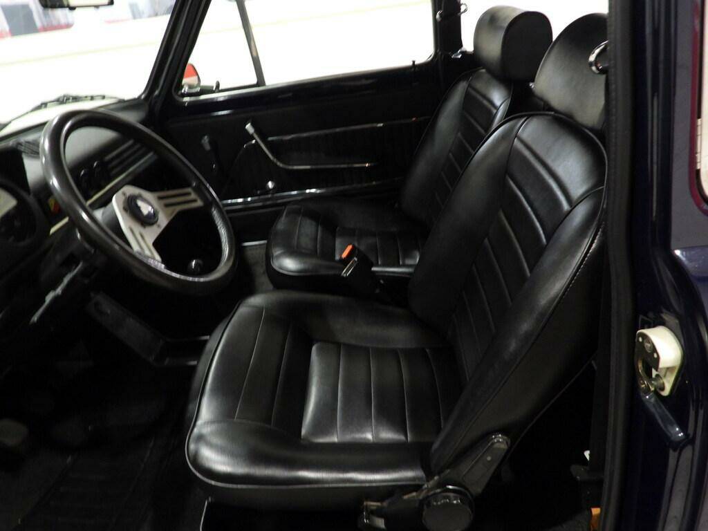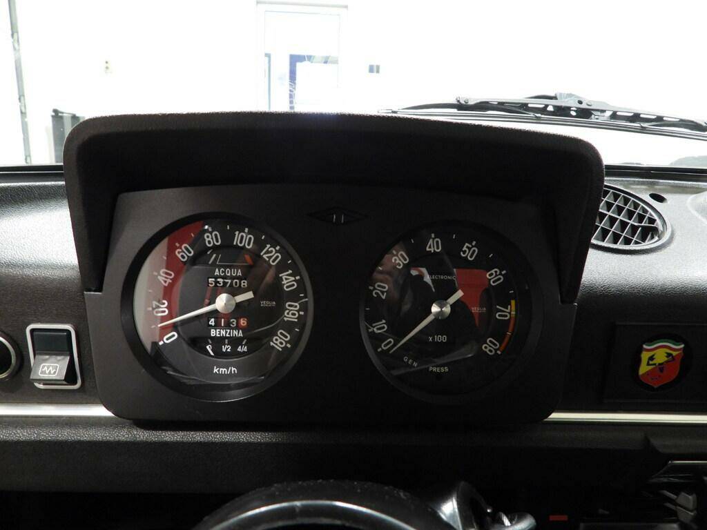 Black Sky seats and panels, Original Autobianchi Abarth 2-spoke steering wheel with leather rim, Double exterior mirrors, ABARTH/CROMODORA alloy wheels with 155/70 R13 tires, Heated rear window, Chrome exhaust tip