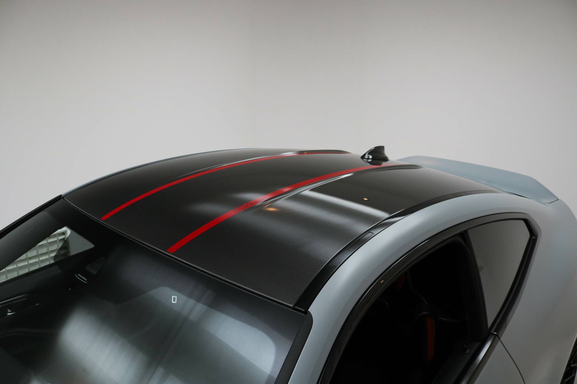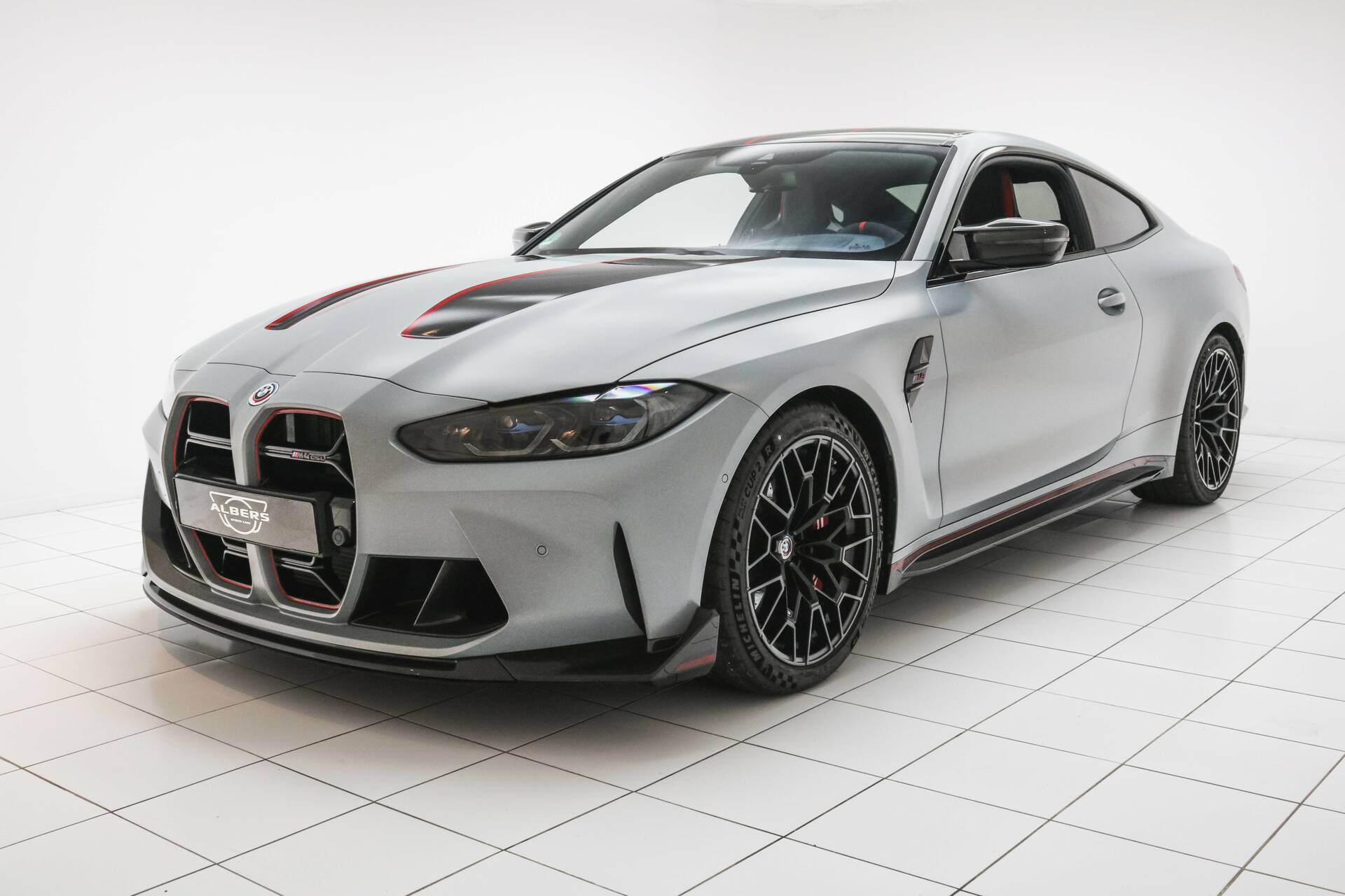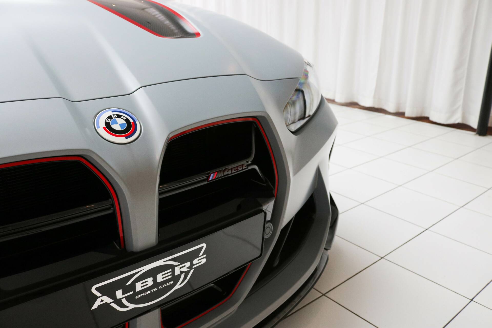 Lackiert in der exklusiven Farbe Frozen Brooklyn Grey Metallic, eine moderne und besonders markante Wahl für den CSL. Die Karosserie befindet sich im Neuzustand und ist mit dem kompletten M Carbon Exterieurpaket ausgestattet, einschließlich sichtbarer Carbon-Akzente, die den kompromisslosen Charakter des CSL betonen. Das Fahrzeug steht auf 19-Zoll-Felgen vorne und 20-Zoll-Felgen hinten, perfekt passend zum aggressiven und funktionalen Design.