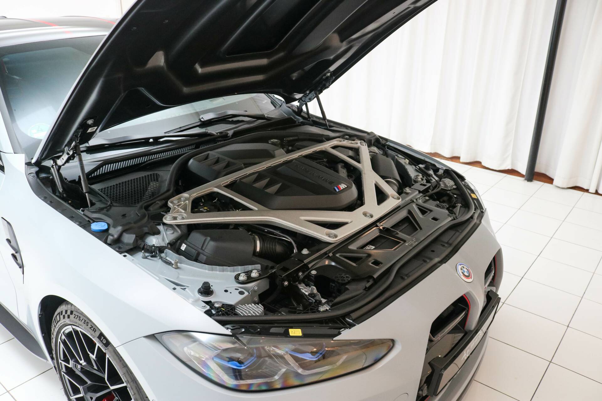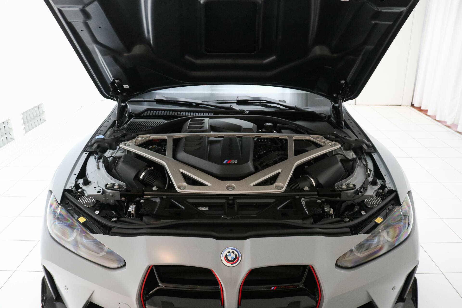 Unter der Haube arbeitet der hochdrehende 3,0-Liter-Reihen-Sechszylinder S58 Biturbo mit 550 PS und 650 Nm Drehmoment. Dank umfangreicher Leichtbau-Maßnahmen, u.a. intensive Nutzung von Carbon und Verzicht auf Komfortelemente, wiegt der CSL rund 100 kg weniger als der reguläre M4 Competition. Die Kraftübertragung erfolgt über das 8-Gang M Steptronic-Getriebe auf die Hinterräder und sorgt für ein direktes Fahrerlebnis. Serienmäßig: M Drivers Package, M Carbon Keramikbremsen und CSL-spezifisches Fahrwerk für beeindruckende Performance und exzellentes Handling.