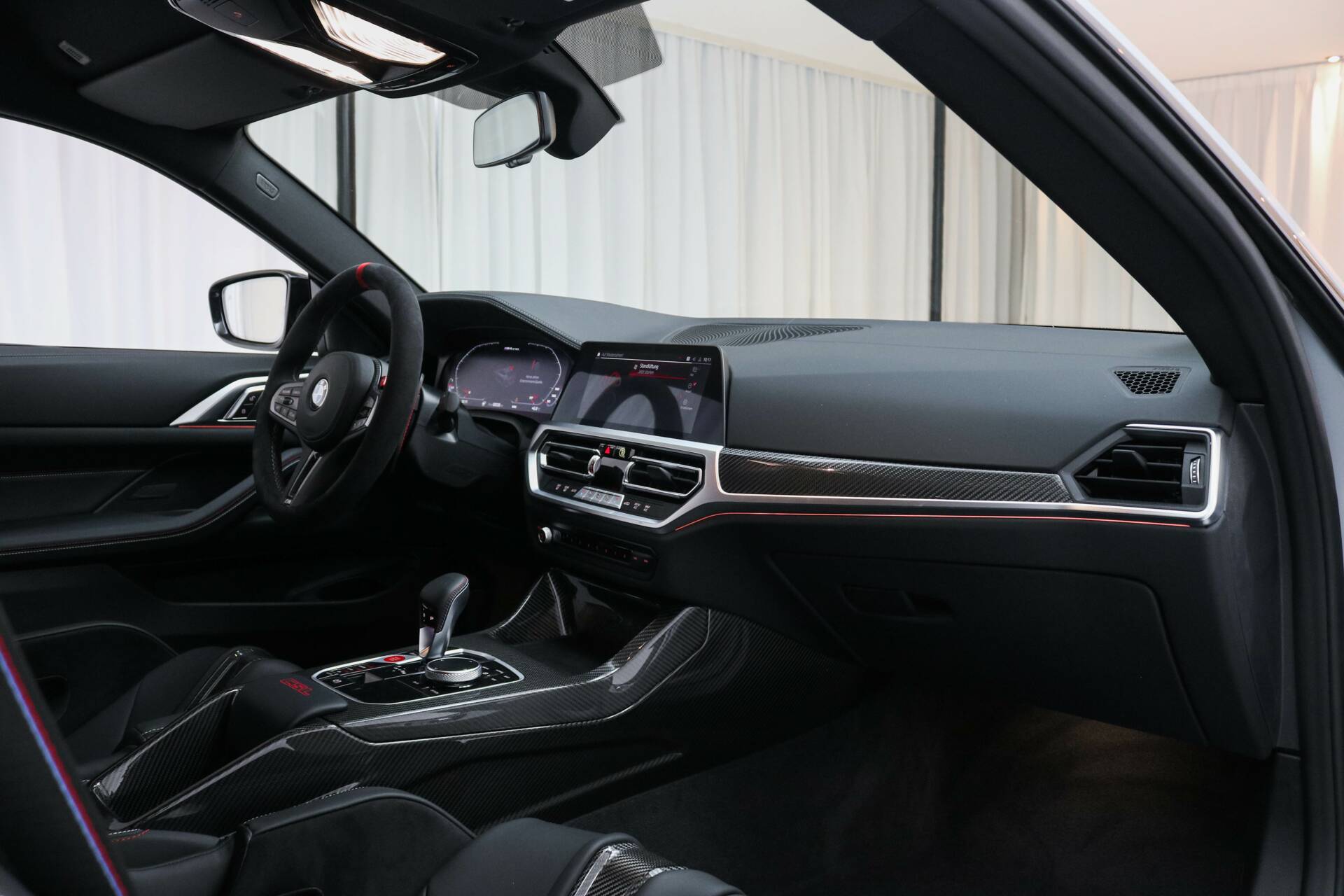 Das Interieur folgt vollständig dem Leichtbaukonzept des CSL: schwarz Leder/Alcantara mit M Carbon Schalensitzen für optimalen Halt. Carbon-Akzente durchziehen das Cockpit, kombiniert mit M Alcantara Lenkrad und Head-up-Display. Alles strahlt Motorsport und Exklusivität aus, mit Materialien und Verarbeitung auf Topniveau der G82-Generation.