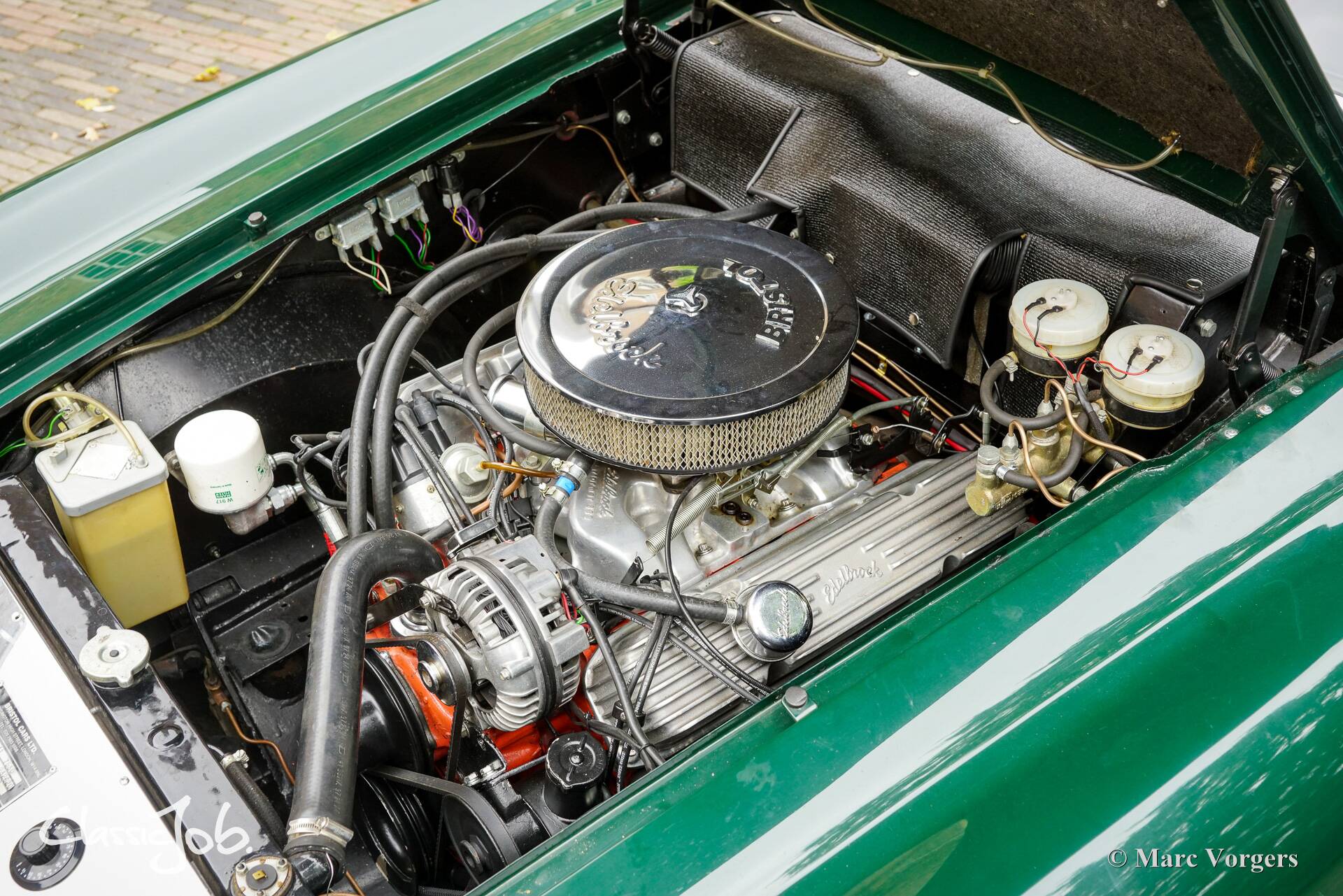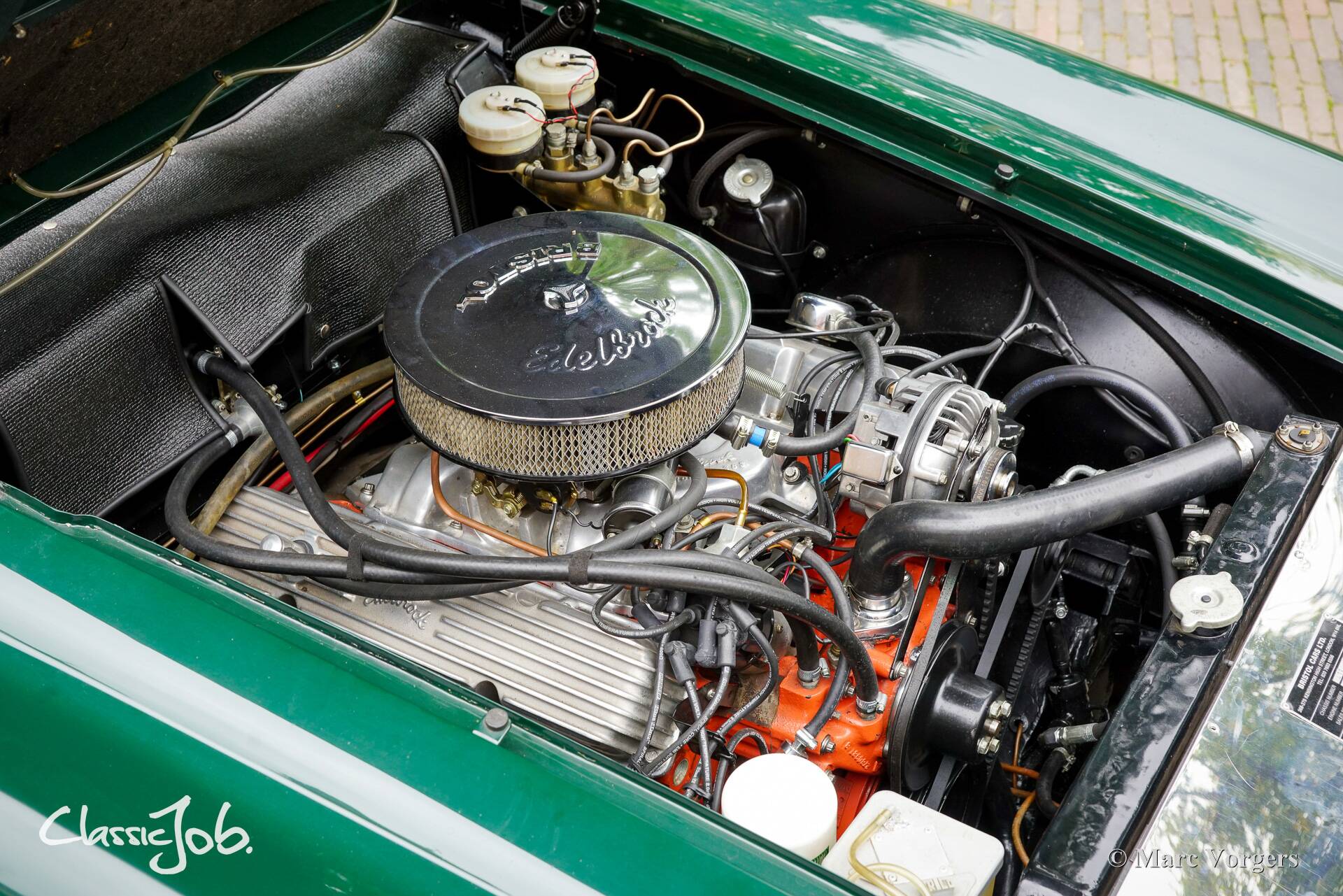 Bristol 411, bouwjaar 1970. Chassisnummer 411 7530, motornummer D383 232620. Carrosseriekleur Dark British Racing Green gecombineerd met een roodlederen interieur afgewerkt met rood wollen tapijt. Deze superzeldzame Bristol 411 werd in 2022 door de huidige eigenaar in het Verenigd Koninkrijk gekocht. Vervolgens werd de auto gerestaureerd en waar nodig gereviseerd, omgebouwd naar een links gestuurde besturing en up-to-date gebracht door Bridge Classic Cars & Restorations in Woodbridge, VK. De werkzaamheden werden uitgevoerd in de periode van maart tot en met oktober 2022. De ombouw van rechts gestuurd naar links gestuurd omvatte het uitbouwen van de motor, nieuwe bedrading, nieuwe bevestigingsbeugels voor de besturing, een nieuw stuurhuis, een nieuwe stuurbekrachtigingspomp, een complete links gestuurde make-over van het dashboard, de pedalenbak, het schutbord, de vloerbedekking, enzovoort. Delen van het chassis, de accubak en de vloer werden gerepareerd/gerestaureerd en opnieuw gespoten/gecoat. De motor werd volledig nagekeken, de remmen werden gereviseerd, het koelsysteem en de slangen werden vernieuwd en er werden Europese koplampen gemonteerd. Het totale investeringsbedrag bedroeg 30.000 pond (€ 35.000). Op 16 mei 2023 werd deze exclusieve Bristol 411 in Nederland geregistreerd. Als vliegtuigbouwer begon Bristol vlak na de Tweede Wereldoorlog met de productie van auto's. Het eerste model, de 400, werd in 1946 gepresenteerd. Bristol verkocht alleen aan een zeer selecte klantenkring. Exclusiviteit was eigenlijk altijd Bristols handelsmerk: ze produceerden nooit auto's in grote aantallen, maar gaven de voorkeur aan vakmanschap en individualiteit boven volume. De Bristol 411 werd geproduceerd tussen 1969 en 1976, en er werden slechts 287 exemplaren gebouwd in vijf series. Die extreem beperkte productie is een deel van wat de 411 vandaag de dag zo begeerlijk maakt. De auto werd met de hand gebouwd in een beperkte oplage, was luxueus en uitgerust met een grote Chrysler V8-motor. Dit exemplaar is voorzien van de Chrysler B-serie 6,3-liter V8 met een vermogen van 340 pk en een maximumkoppel van 576 Nm! Het vermogen wordt via een Chrysler Torqueflite 3-traps automatische transmissie naar de achterwielen overgebracht, wat zorgde voor een acceleratie van 0 naar 100 km/u in slechts 7 seconden en een topsnelheid van 230 km/u! Deze klassieke ‘supercar’ verkeert in een zeer goede staat en de auto rijdt zeer goed. Deze Bristol 411 kan worden gebruikt tijdens merk-/klassiekerclubdagen en -uitjes, weekendtrips en als een uniek stuk Brits erfgoed in een autocollectie. Deze auto is alleen op afspraak beschikbaar voor bezichtiging en een testrit.