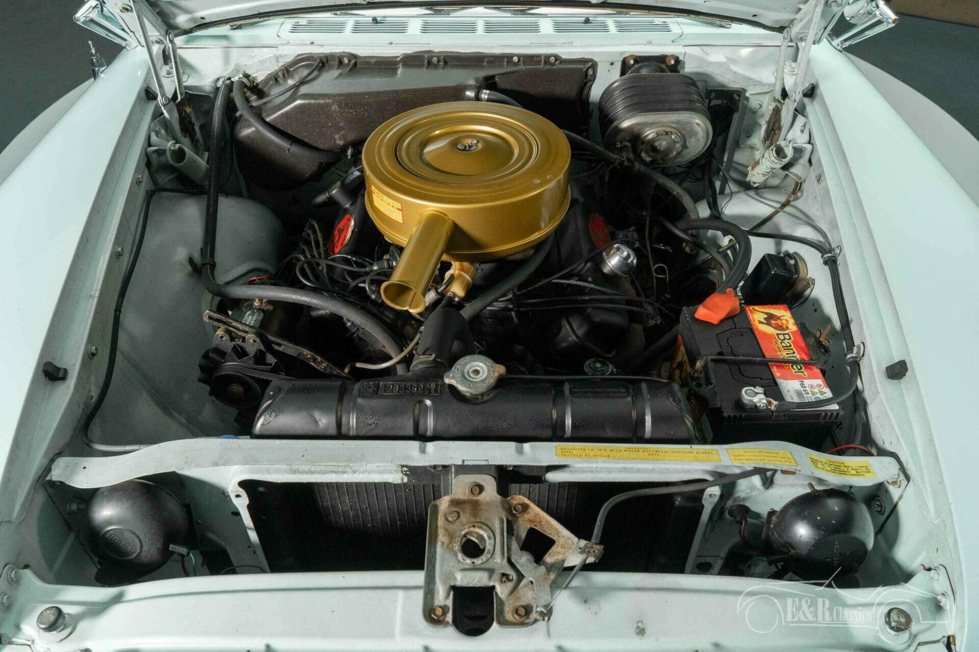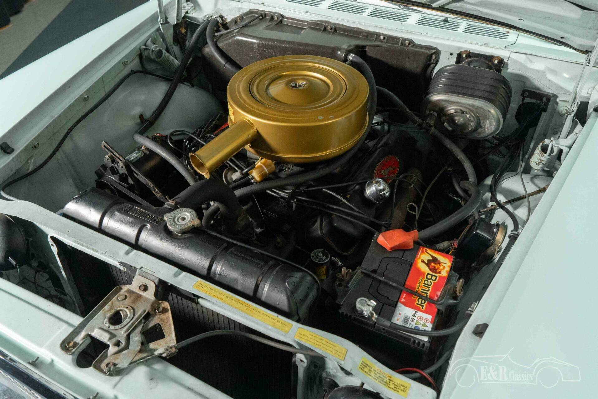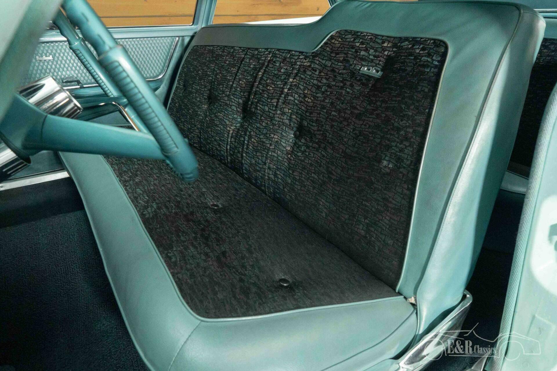 Het uiterlijk van deze Windsor is ronduit indrukwekkend: het two-tone lakwerk in Seaspray blauw met zwart dak geeft de auto een chique, tijdloze uitstraling. De grote achtervinnen, kenmerkend voor dit bouwjaar, benadrukken het dramatische jaren ’60-design en maken van deze auto een absolute blikvanger. De klassieke white wall banden in combinatie met originele wieldoppen versterken de vintage look. Binnenin wacht een prachtig bewaard gebleven turquoise interieur met brede banken, veel chroom en een dashboard dat doet denken aan een Amerikaanse jukebox. De kleuren van binnen en buiten vloeien naadloos in elkaar over, wat zorgt voor een harmonieuze en karaktervolle presentatie van deze Amerikaanse klassieker.