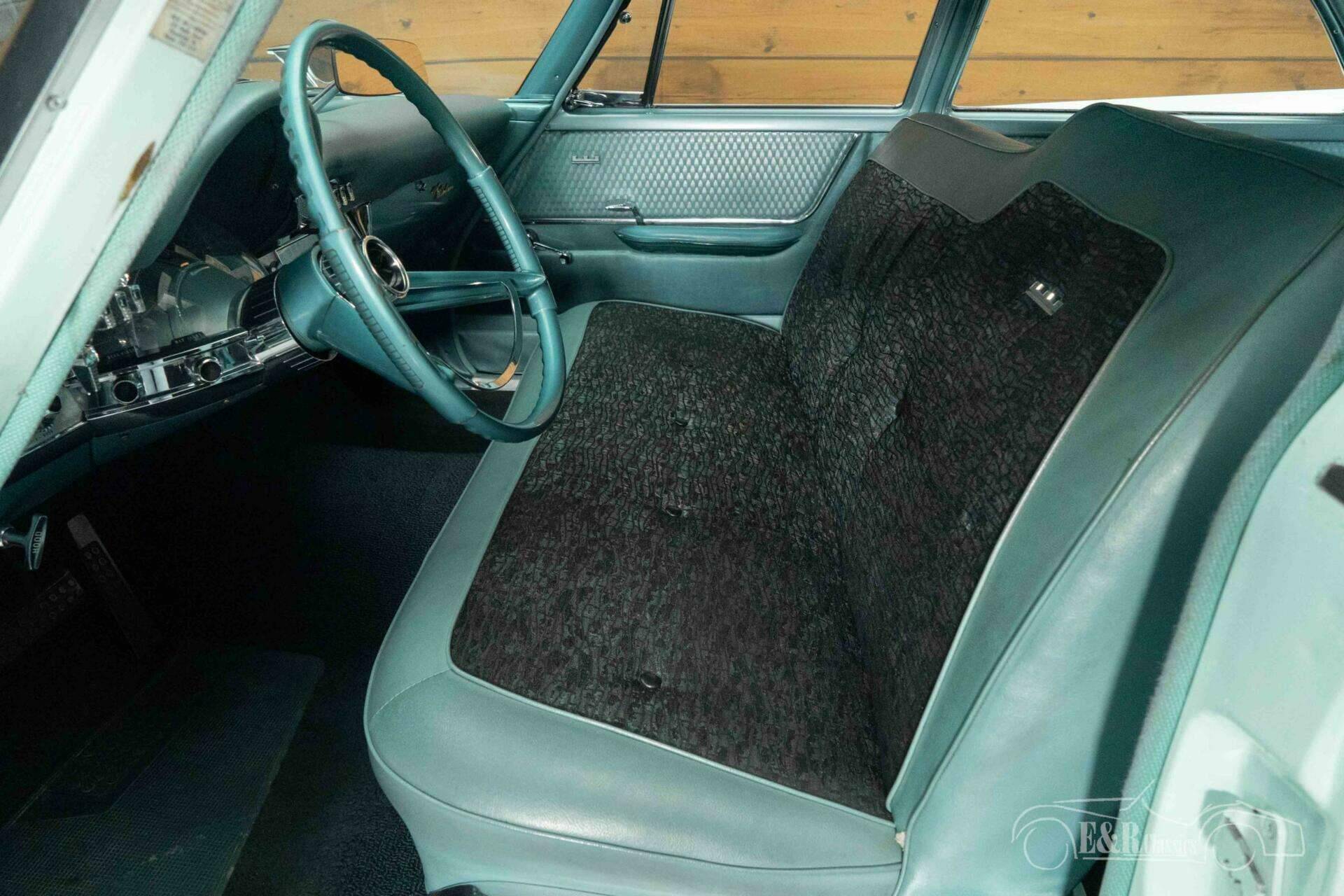 The appearance of this Windsor is downright impressive: the two-tone paintwork in Seaspray blue with black roof gives the car a chic, timeless look. The large rear fins, characteristic of this year of construction, emphasize the dramatic 60s design and make this car an absolute eye-catcher. The classic white wall tires in combination with original hubcaps enhance the vintage look. Inside, a beautifully preserved turquoise interior awaits with wide benches, lots of chrome and a dashboard that is reminiscent of an American jukebox. The colours of the inside and outside flow seamlessly into each other, which ensures a harmonious and characterful presentation of this American classic.