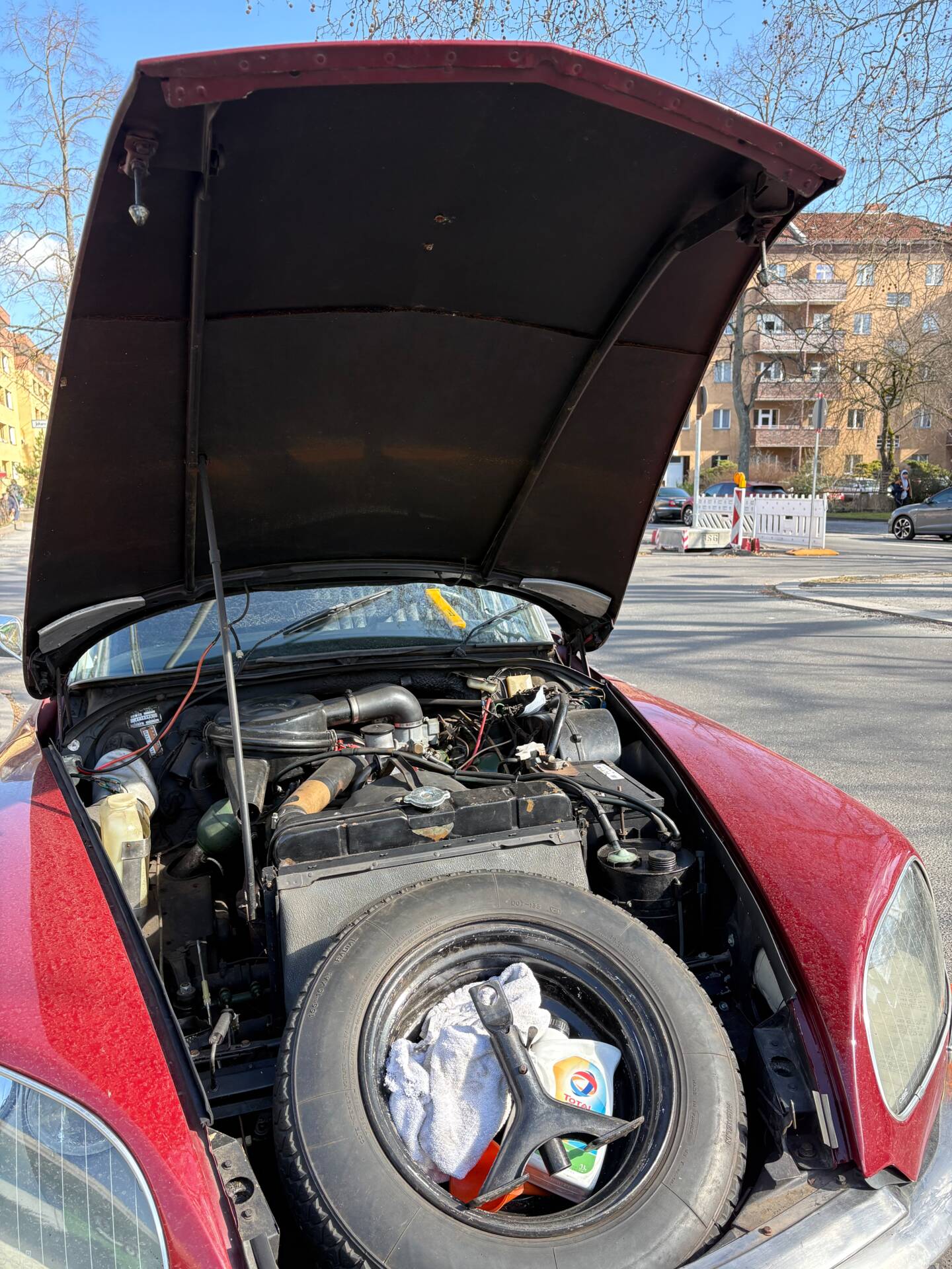Der Innenraum (Leder) ist sichtbar gebraucht und weist altersbedingte Nutzungsspuren auf. Der Lack zeigt kleinere Roststellen, was bei Fahrzeugen dieses Alters nicht ungewöhnlich ist. Insgesamt handelt es sich um ein ehrliches und sehr solides Fahrzeug mit guter technischer Basis.