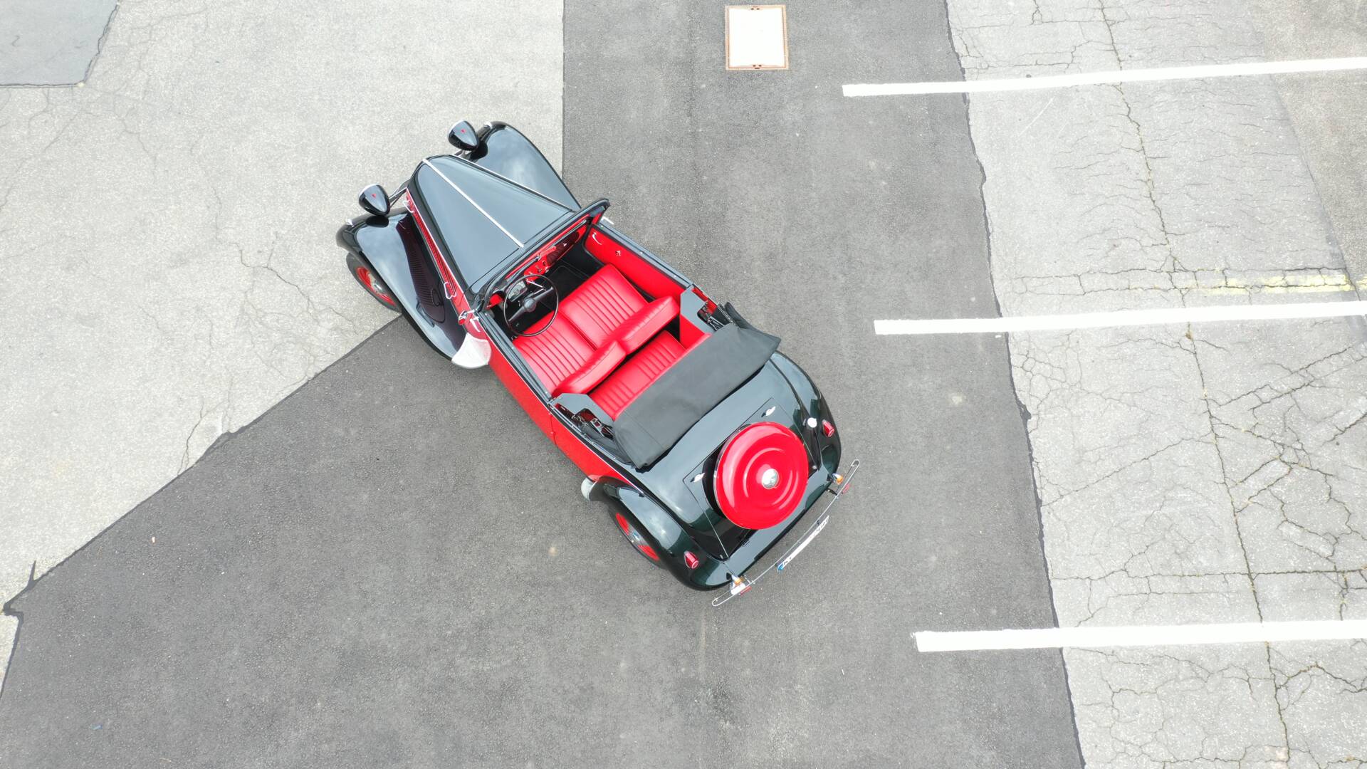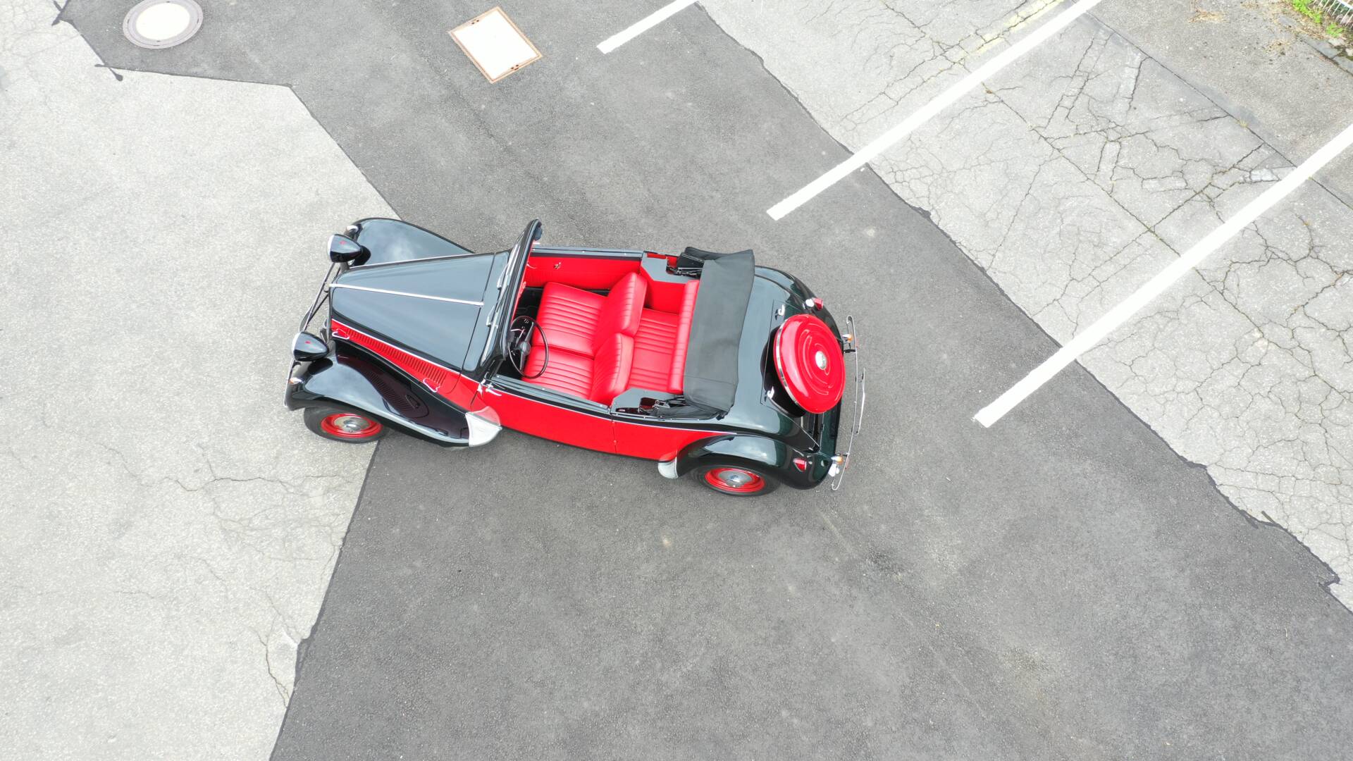 Das Fahrzeug befindet sich im guten, restaurierten Zustand, sowohl technisch als auch optisch. Die Restauration wurde fachmännisch durchgeführt. Die Karosserie ist soweit erkennbar rostfrei, das Lackbild gleichmäßig und glänzend, das Verdeck in einem guten Zustand. Das Interieur mit originalen, klassischen Armaturen.