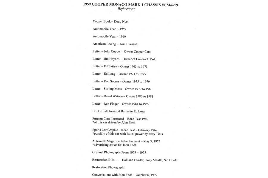 CM/6/59 was the sixth of the eight factory built cars and was delivered new to American car dealer Harry Blanchard of Connecticut. Preferring to stick with his Porsche RSK for racing, Harry sold the Cooper-Monaco straight on to New York motor dealer and car entrant Charles Kreisler. Still in the original dark blue livery as delivered to Blanchard, Charlie entered the car in the Lime Rock Park round of the USAC Road Racing Championship for Indycar racer Roger Ward. On the day though, former Mercedes-Benz factory driver John Fitch would race the Cooper-Monaco after reminding Kreisler that he had offered him first refusal to race the car, and he would very much like to drive the new Cooper. Fitch used CM/6/59 to good effect to finish 4th overall. Fitch then agreed to drive the car for the rest of the season starting at the Montgomery National where he dropped out early in the main race. Back on the USAC RRC trail at Meadowdale, Fitch finished 3rd. After retiring in the Canadian Stock Car Association sports car race at Harewood Acres, Fitch won the main event at the season-ending SCCA Regional at Lime Rock Park.
