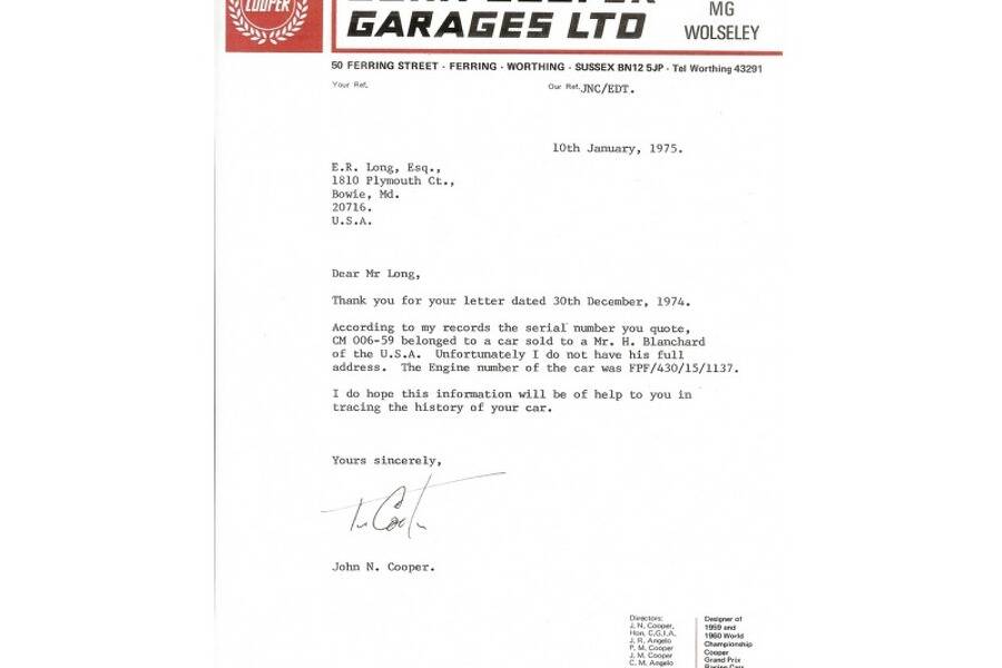 Over the next two years or so, Ed rebuilt and cosmetically restored the Cooper before offering it for sale in 1975 for $3500. CM/6/59 was bought by Ron Scoma of DeKalb, Illinois who used his college money to buy the Cooper. Over the next four years Ron worked on and off putting the car back in order sourcing and acquiring the correct spec of Coventry-Climax engine and Jack Knight gearbox.