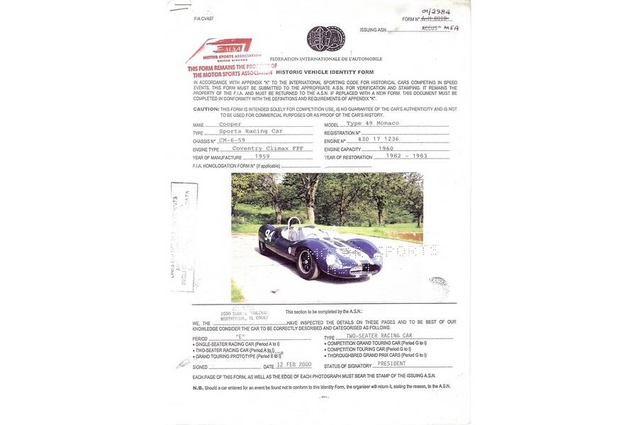 This factory Cooper Monaco is in outstanding condition and is 100% race-ready. It will be sold with a new, 2026 issued FIA HTP and comes with a spare set of wheels. CM/6/59 has been fully sorted, always maintained with no expense spared. It has proven to be a competitive entry in all races it has participated in such as mulitple Le Mans Classic, Goodwood Revival and Member meetings, Stirling Moss Trophy, etc..