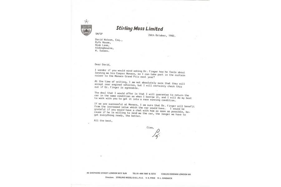 In 1979 Ron offered the car for sale and CM/6/59 was bought and imported to England by Stirling Moss who was very familiar with the T49 having raced one successfully in period. Stirling sold the car as a restoration project the following year to David Watson who commissioned Hall & Fowler to carry out a full restoration of the car. The restoration was overseen and invoiced through Stirling Moss Ltd.. Stirling tested the car at Silverstone and raced it at the curtain opener for the 1983 Monaco Grand Prix; upon which David Watson sold the car to US collector and historic racer Dr Ron Finger of Georgia who repainted the car from silver to blue and white. Ron raced the car until 1990, then placed the Cooper in dry storage until selling it in 1999 to Mark Leonard of Grand Prix Classics of California.