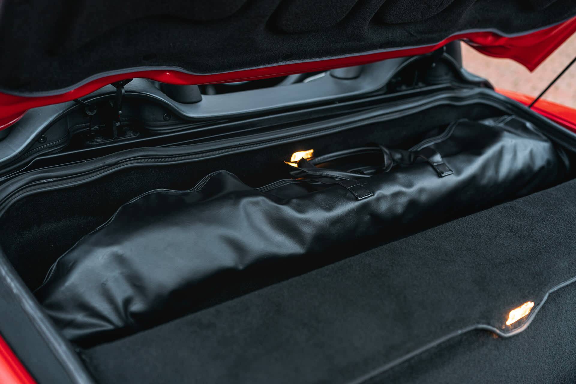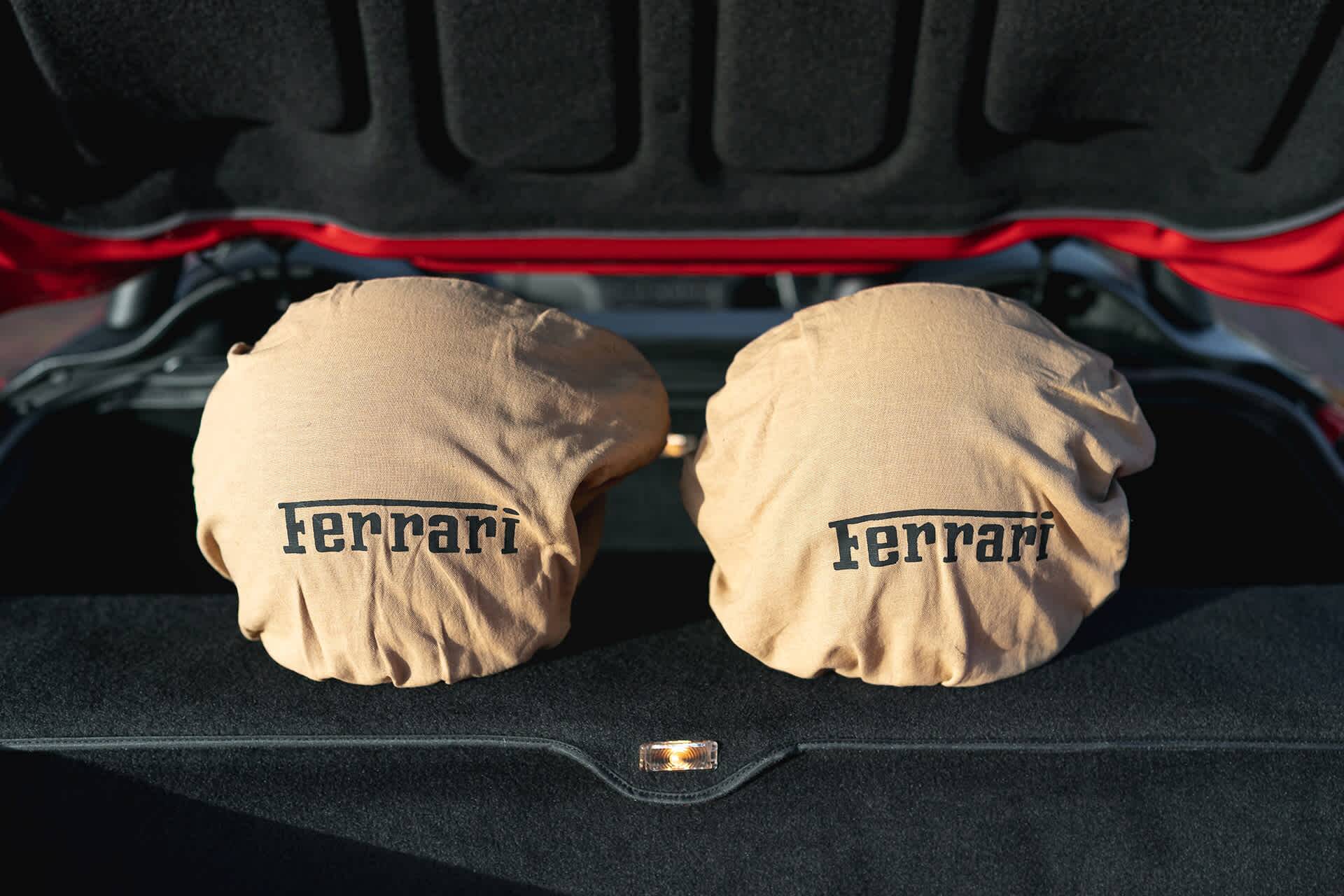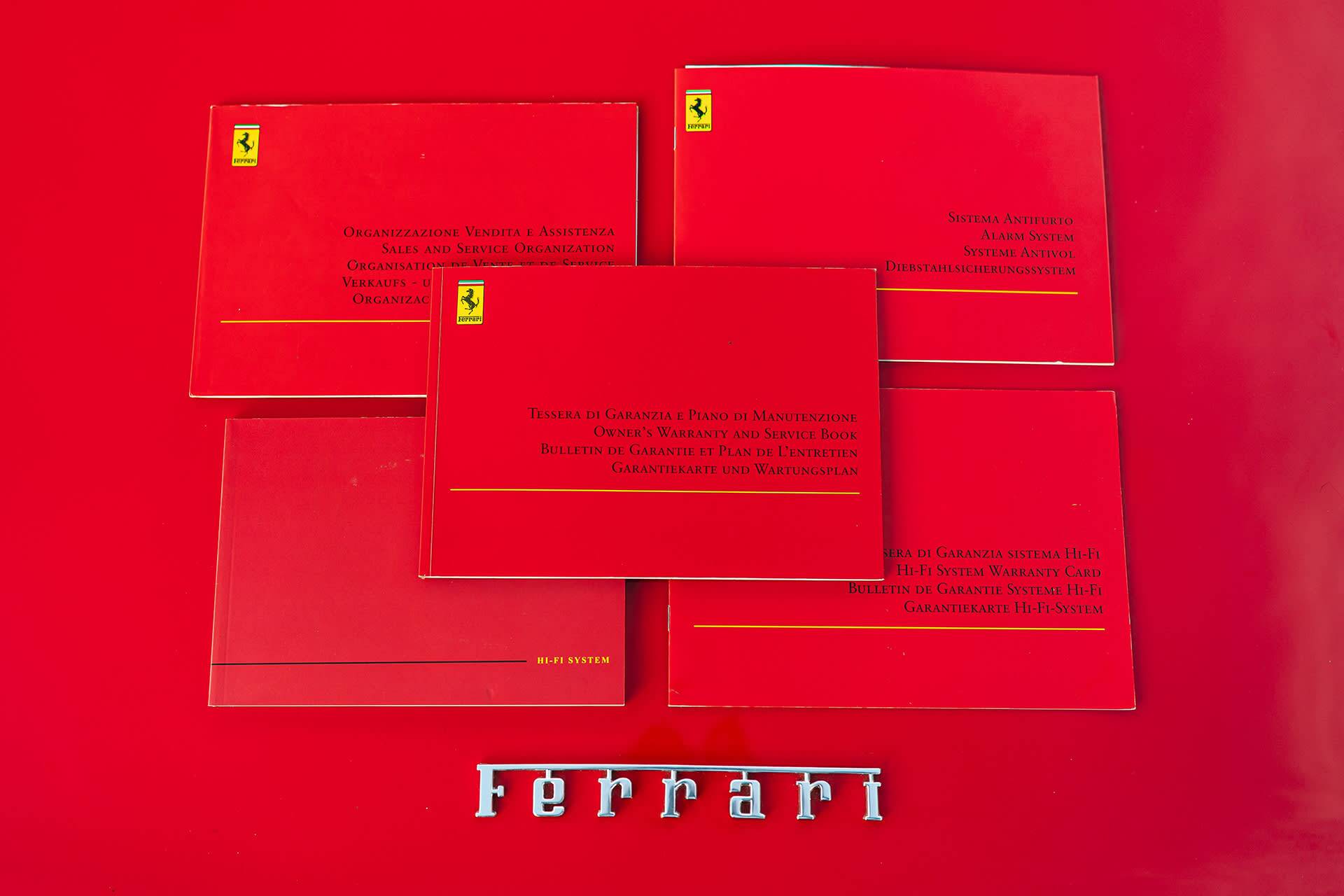 Satisfyingly, chassis number 4116 retains its factory documents pouch complete with Certificate of Origin, Warranty and Service Book, Alarm System booklet, Owners’ Manual, Sales and Service booklet and Hi-Fi System Warranty Card. In the boot you’ll find the fitted leather bag containing the canvas roof arrangement and the red Ferrari car cover. Beneath the boot floor are the leather tool kit and the bagged tyre compressor kit. The proverbial cherries on the cake are the two red special-edition Ferrari 550 Barchetta crash helmets, complete with their yellow cloth bags and brown leather visors.
