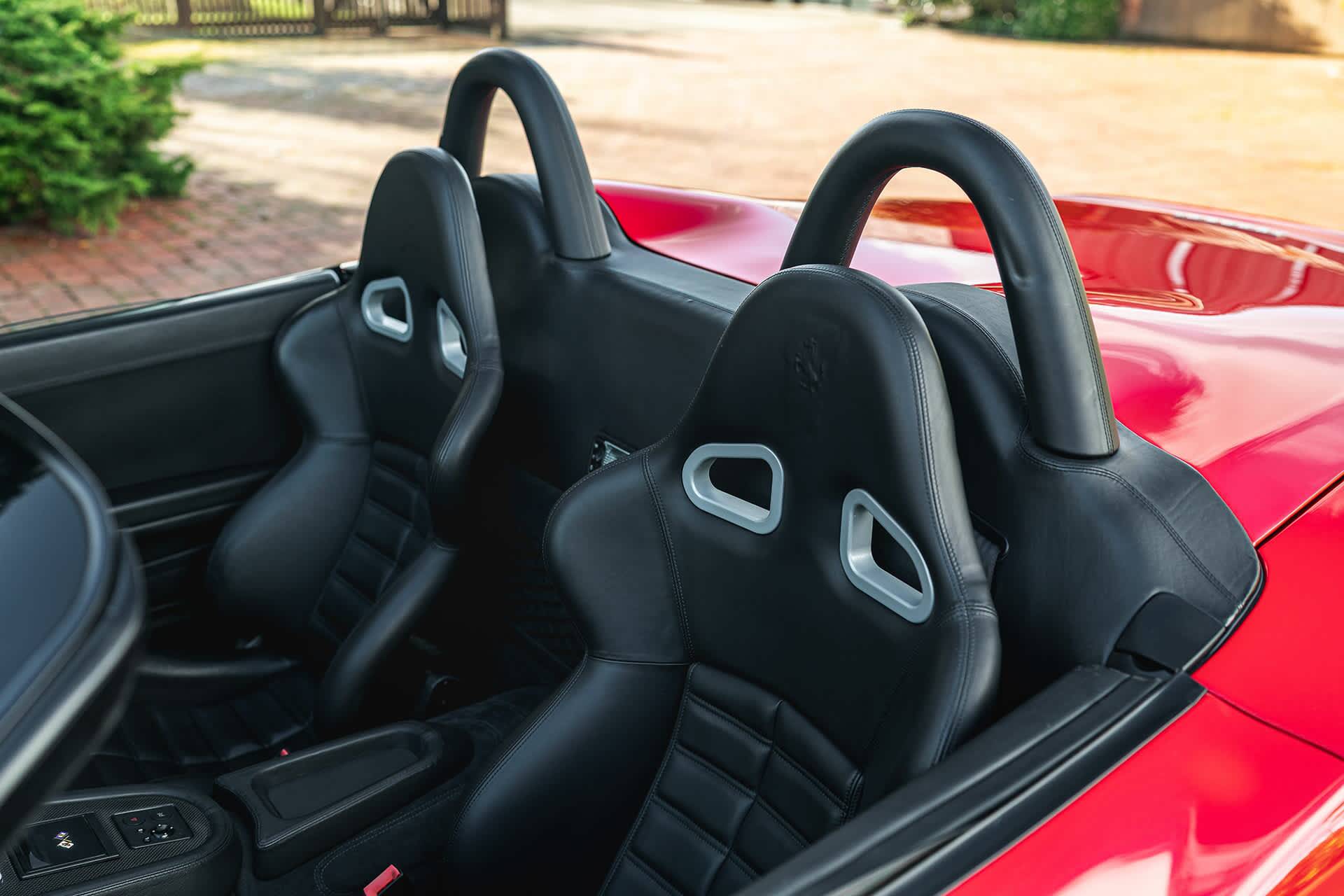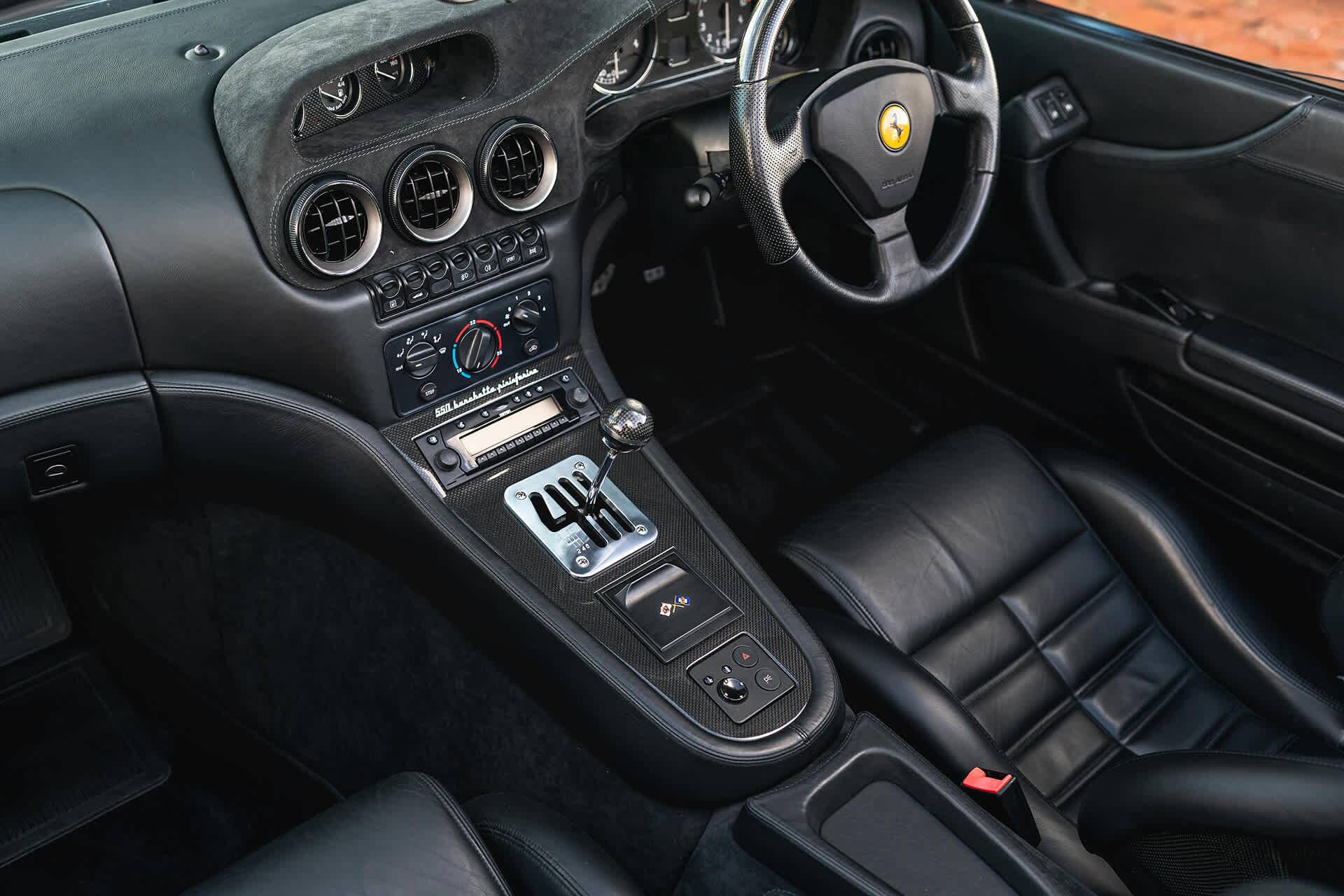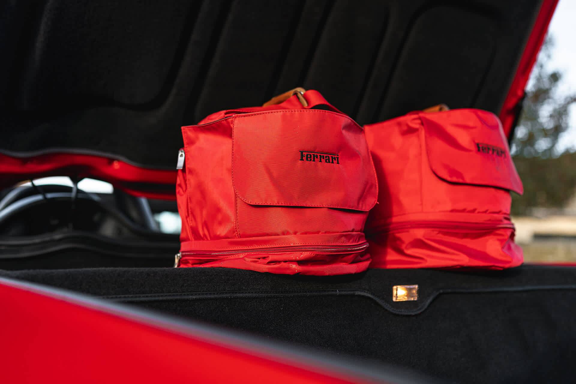 Satisfyingly, chassis number 4116 retains its factory documents pouch complete with Certificate of Origin, Warranty and Service Book, Alarm System booklet, Owners’ Manual, Sales and Service booklet and Hi-Fi System Warranty Card. In the boot you’ll find the fitted leather bag containing the canvas roof arrangement and the red Ferrari car cover. Beneath the boot floor are the leather tool kit and the bagged tyre compressor kit. The proverbial cherries on the cake are the two red special-edition Ferrari 550 Barchetta crash helmets, complete with their yellow cloth bags and brown leather visors.