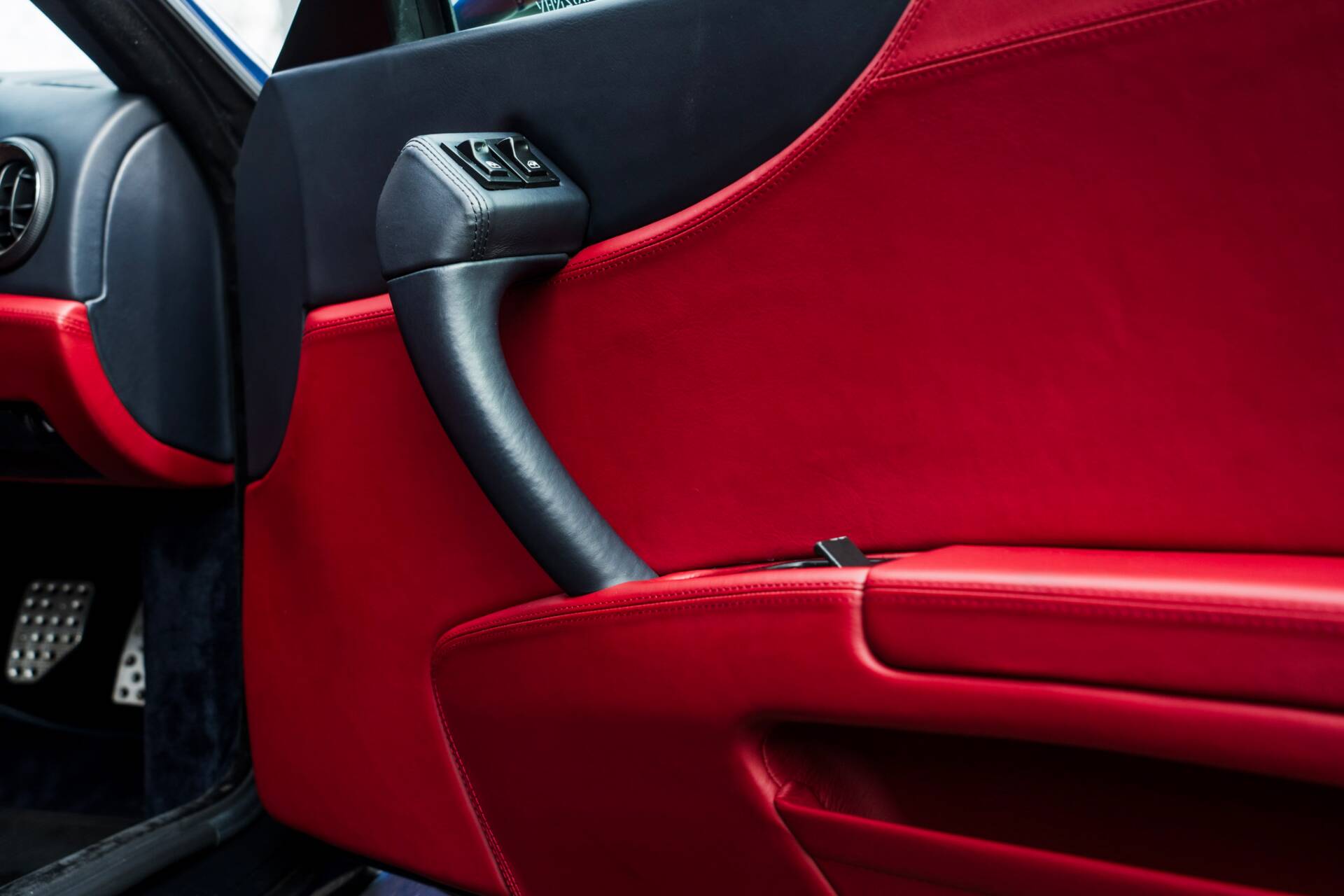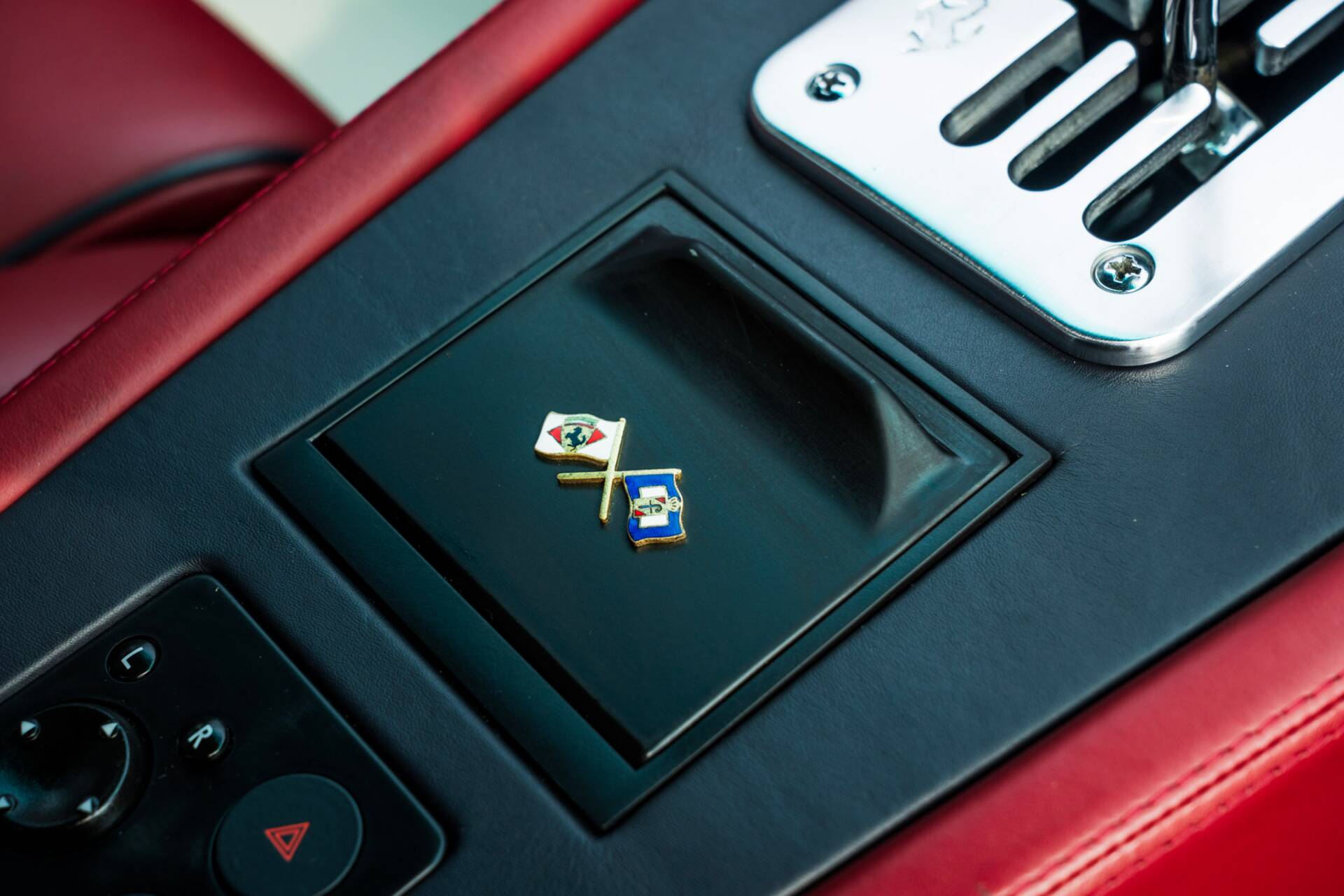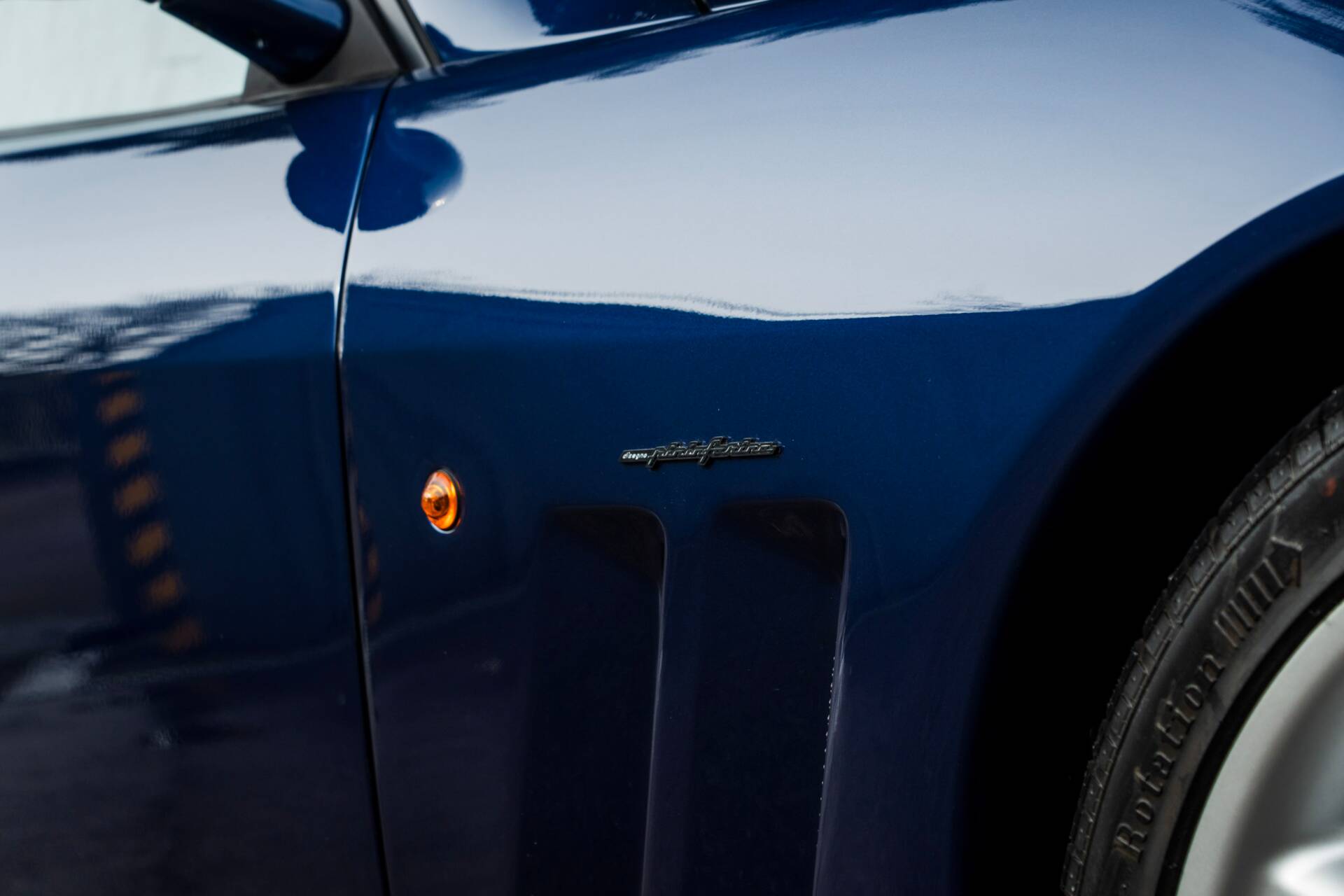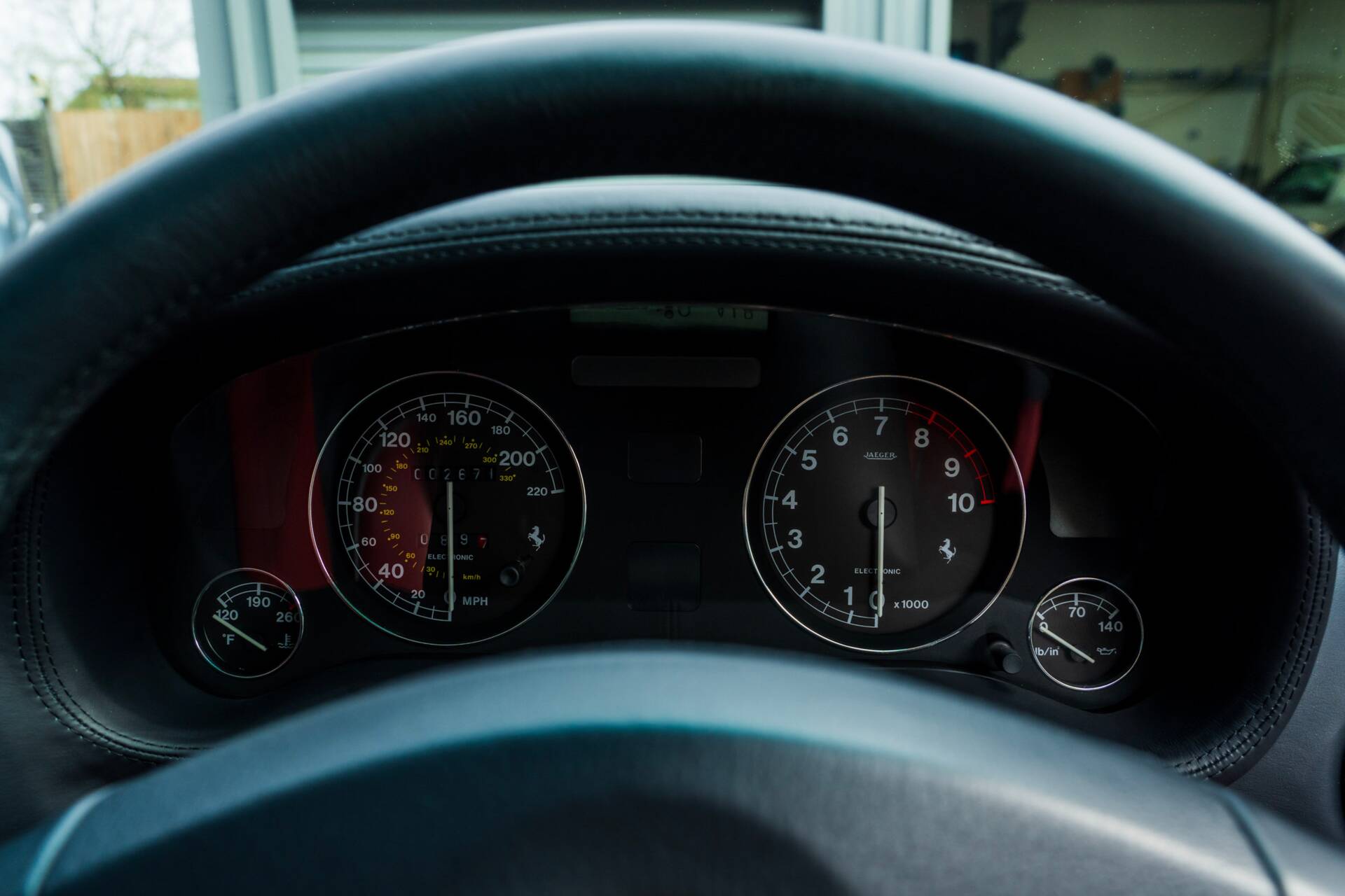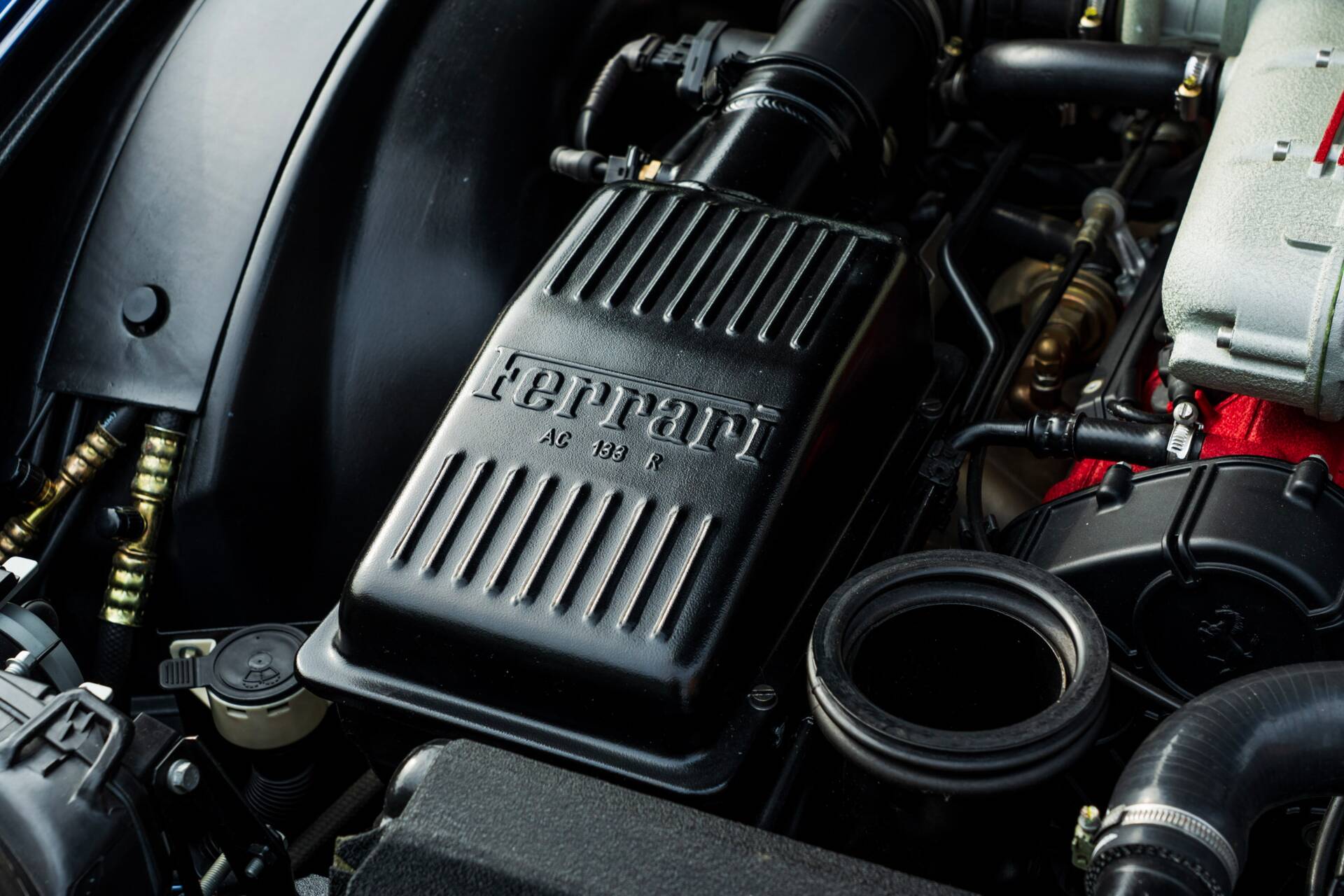 FACTORY SPECIFICATION INCLUDES:- 6-SPEED OPEN-GATE MANUAL GEARBOX, DAYTONA STYLE SPORTS SEATS WITH BLACK PIPING AND CAVALLINO EMBOSSED HEADRESTS, DARK BLUE DASH ROLL, DARK BLUE CARPETTING, NERO DASHBOARD ROLL, AIR CONDITIONING, ELECTRIC WINDOWS, REMOTE ALARM LOCKING, ASR, BLACK BRAKE CALIPERS, 18” ALLOY WHEELS, ALUMINIUM PEDAL SET, AND FERRARI STEREO RADIO.