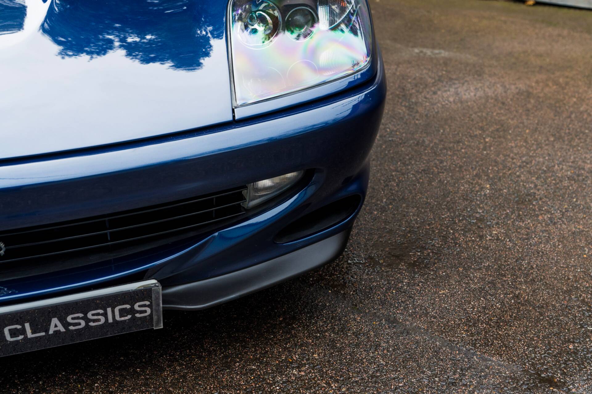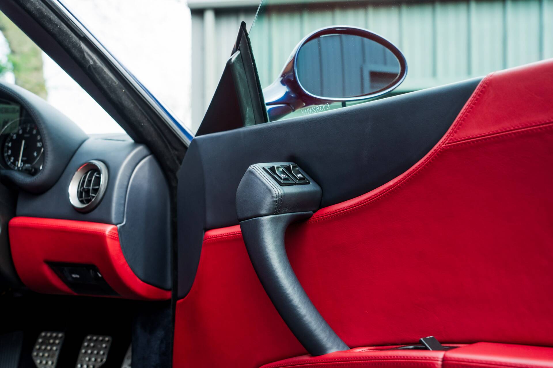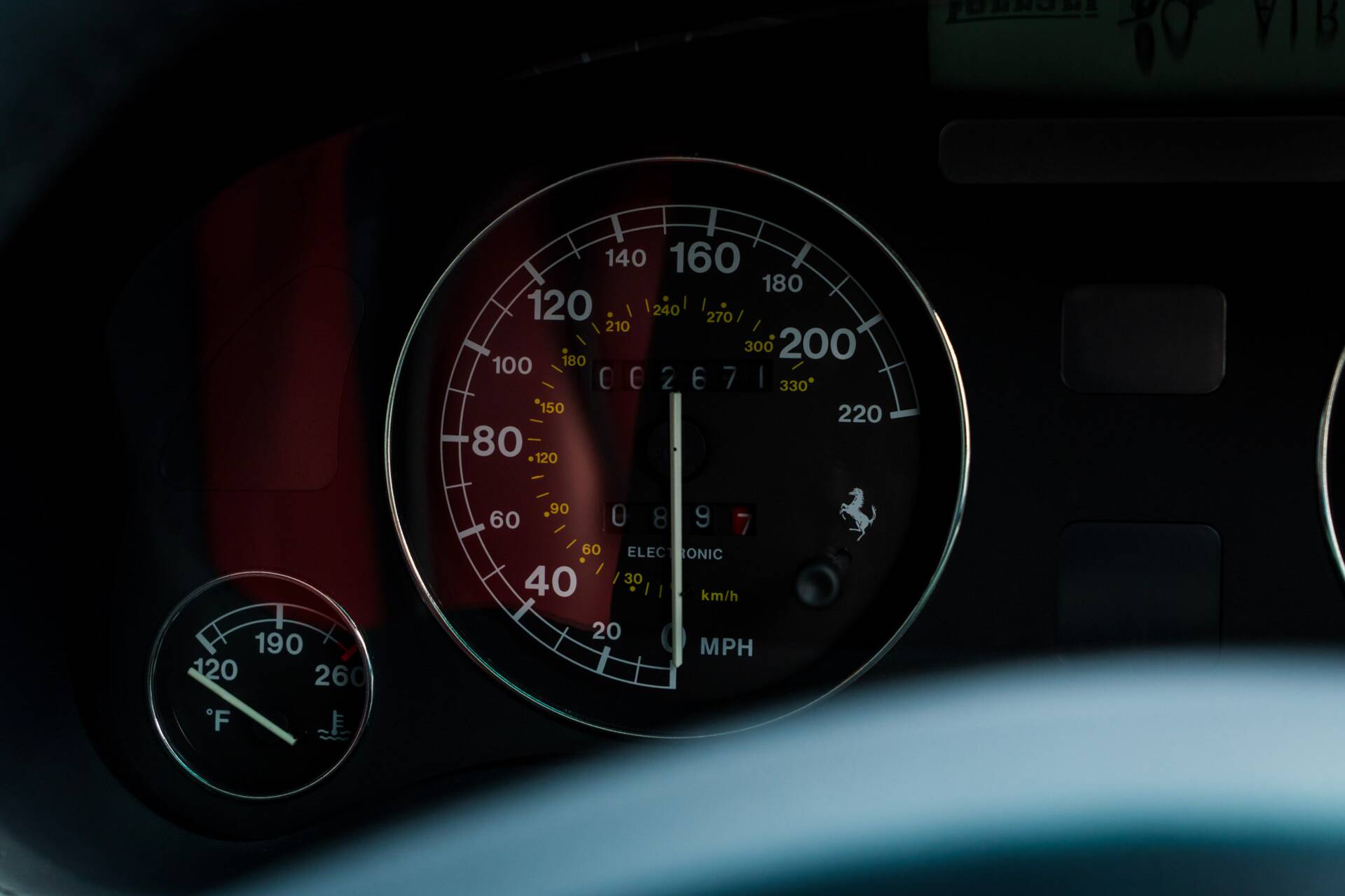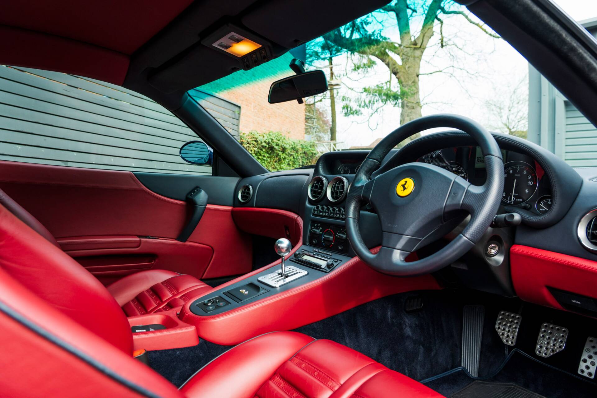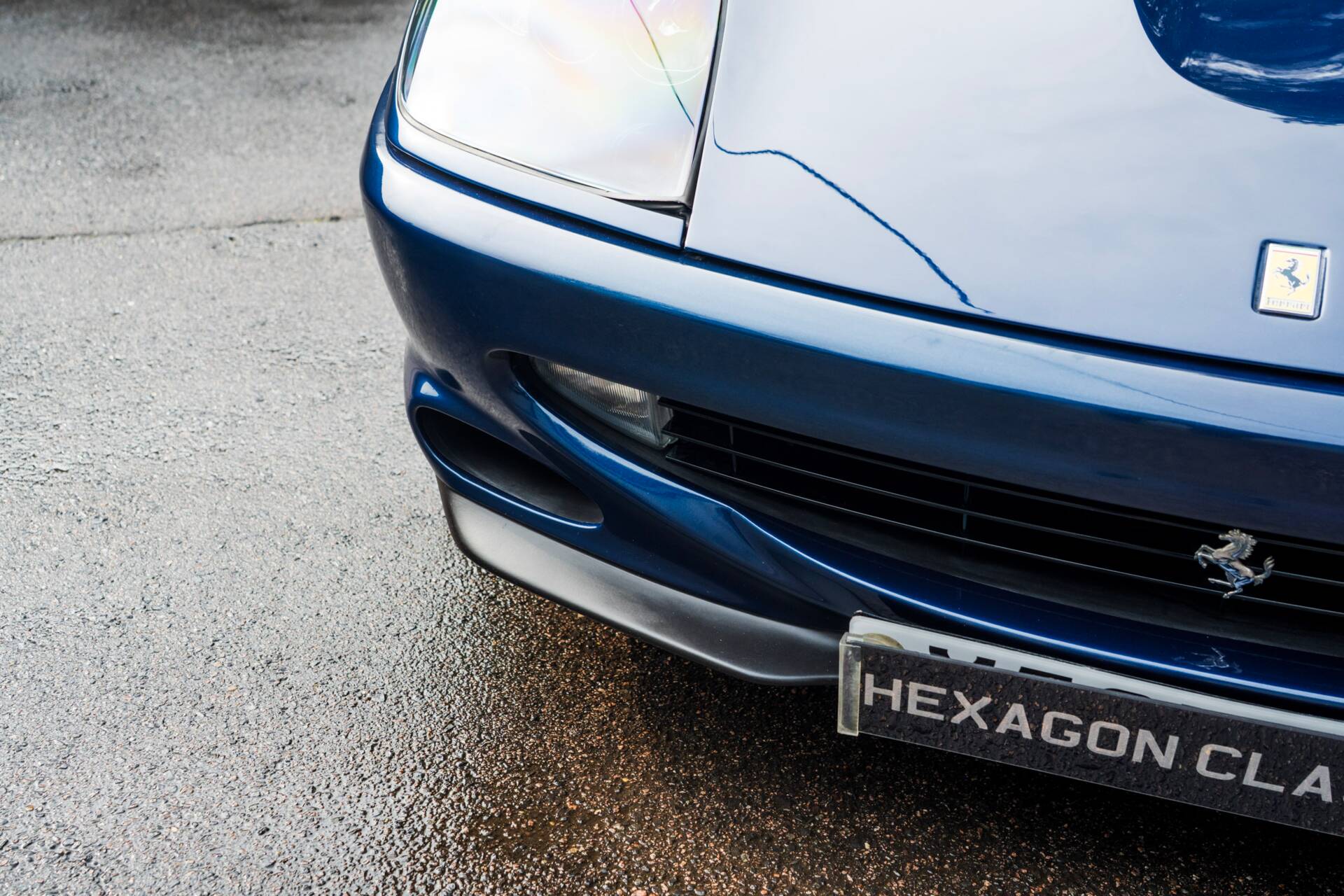 FACTORY SPECIFICATION INCLUDES:- 6-SPEED OPEN-GATE MANUAL GEARBOX, DAYTONA STYLE SPORTS SEATS WITH BLACK PIPING AND CAVALLINO EMBOSSED HEADRESTS, DARK BLUE DASH ROLL, DARK BLUE CARPETTING, NERO DASHBOARD ROLL, AIR CONDITIONING, ELECTRIC WINDOWS, REMOTE ALARM LOCKING, ASR, BLACK BRAKE CALIPERS, 18” ALLOY WHEELS, ALUMINIUM PEDAL SET, AND FERRARI STEREO RADIO.