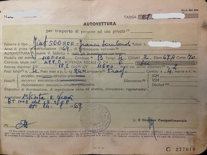 Rarissima Fiat 500 FRANCIS LOMBARDI "My Car", Serie 110 F, versione speciale della Nuova 500 realizzata dalla celebre carrozzeria vercellese Francis Lombardi tra il 1967 e il 1971. Questo allestimento, noto per le sue finiture superiori e la linea elegante, rappresenta una delle interpretazioni più raffinate della 500 d’epoca. L’esemplare proposto è del 1969, con tetto chiuso dotato di nervature longitudinali e spoiler posteriore, una configurazione rara e molto ambita dai collezionisti per la sua maggiore insonorizzazione e comfort rispetto alla versione trasformabile con tetto apribile.