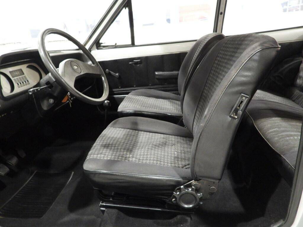 SEDILI IN STOFFA GRIGIA E NERA E VELLUTINO A COSTE E PANNELLI IN SKY NERO, MOQUETTE IN LANA NERA AL PAVIMENTO, VOLANTE A DUE RAZZE ORIGINALE, SPECCHIO ESTERNO LATO GUIDA CROMATO A REGOLAZIONE MANUALE INTERNA