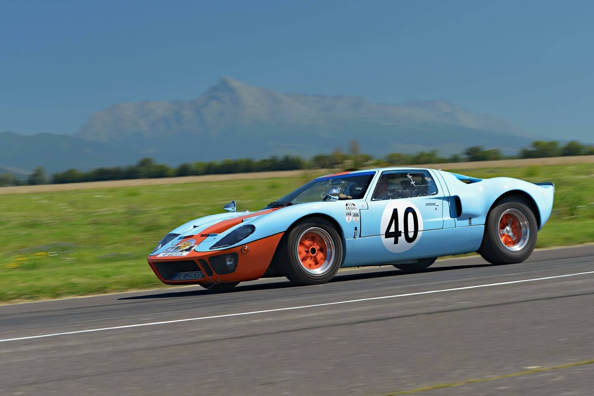 The holy grail of all Ford GT40s is the MKI in Gulf Racing colors with the serial number P1075, which is the only car in history to win Le Mans twice, in 1968 and 1969. The GT40 offered by us is a replica of this particular car. The kit was manufactured by the English company KVA and is 100 percent identical to the original in shape and dimensions.