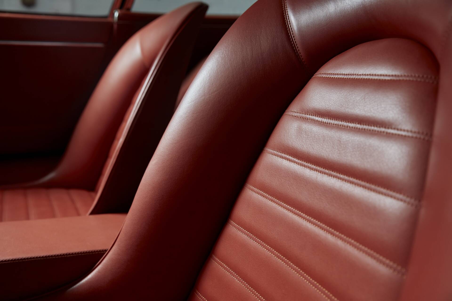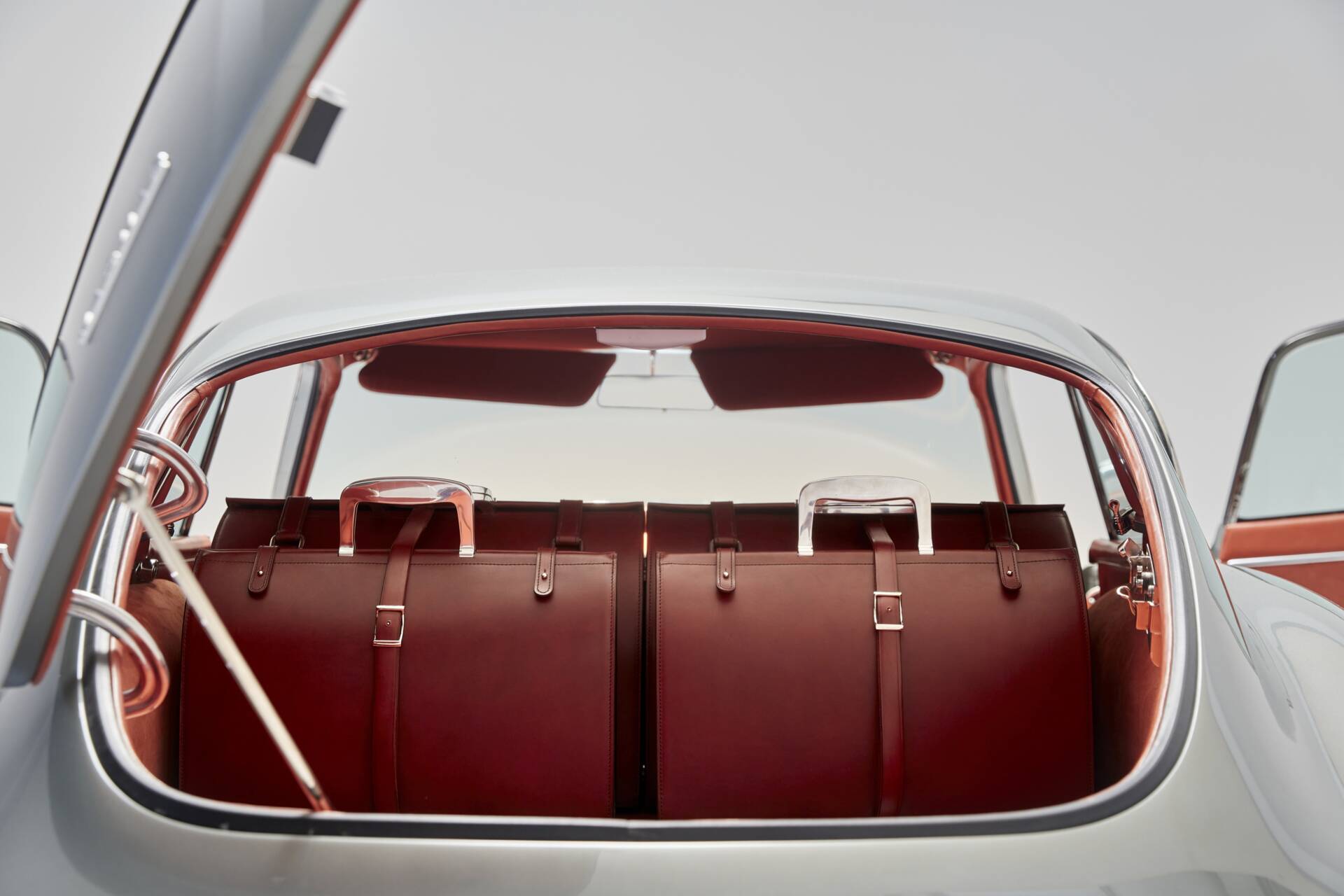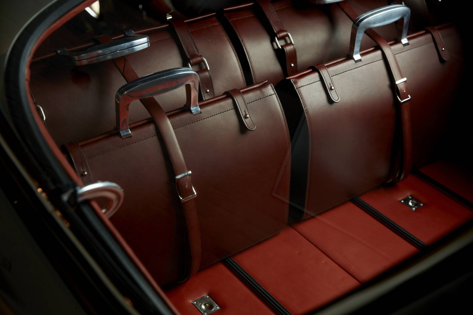 This car has covered a mere 2,400 miles, much of that honing to the setup and engine dynamics with closed sessions at Silverstone which were utilised to create the ultimate E-Type driving experience for a road car and the top motoring journalists giving glowing road tests and reviews which can be found online and listed below. The colour is Opalescent Silver metallic, a Jaguar colour but finished far better than any car from the Jaguar factory with over 20 litres of paint used for each car. Trimmed in burnt orange leather by Bill Amberg and with the matching luggage set present, this trim alone is stated to cost circa £70,000 in leather and labour. Also, a wonder for such a classic are the soft close aluminium doors which 'make sense' but take hours of fitting and fettling.