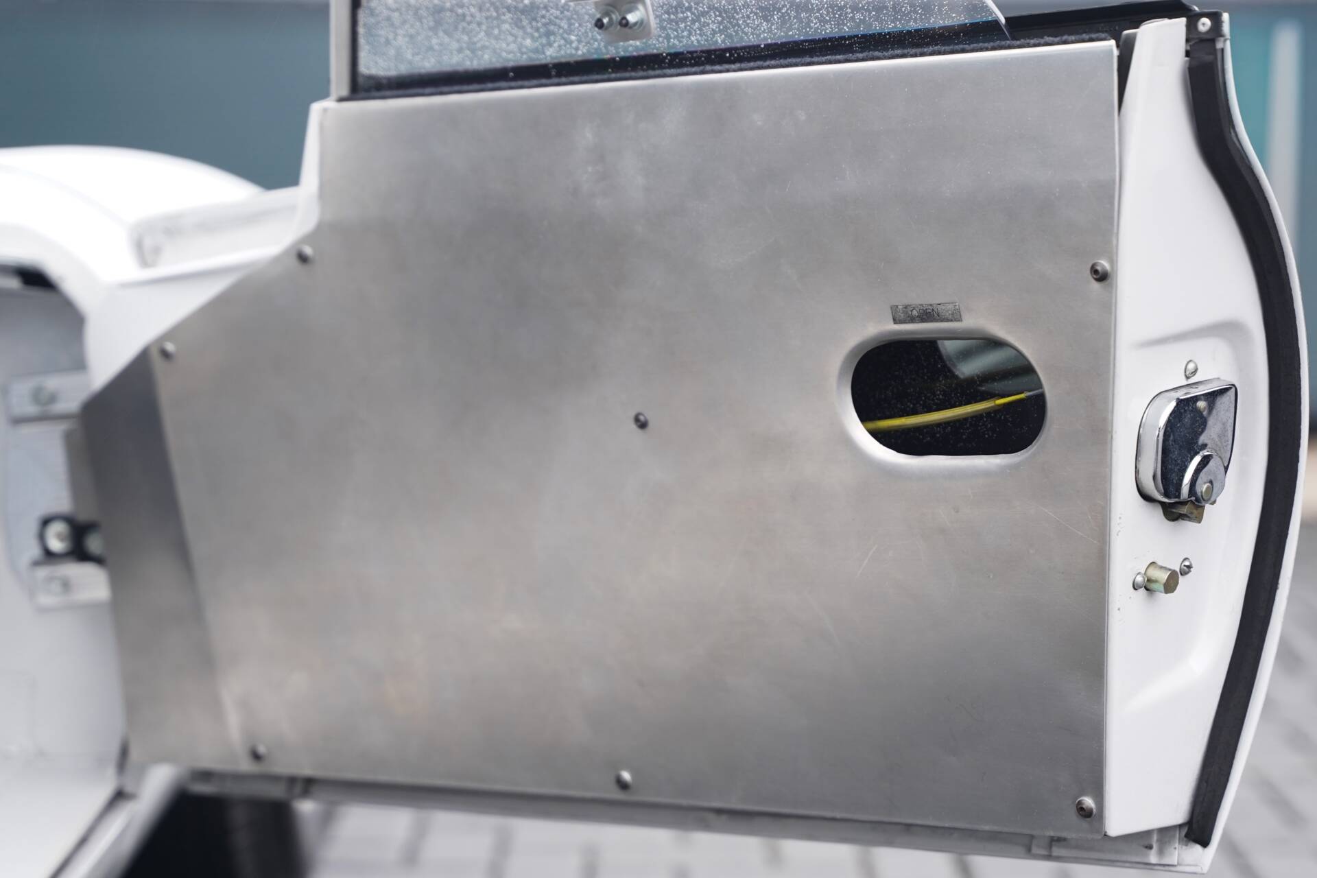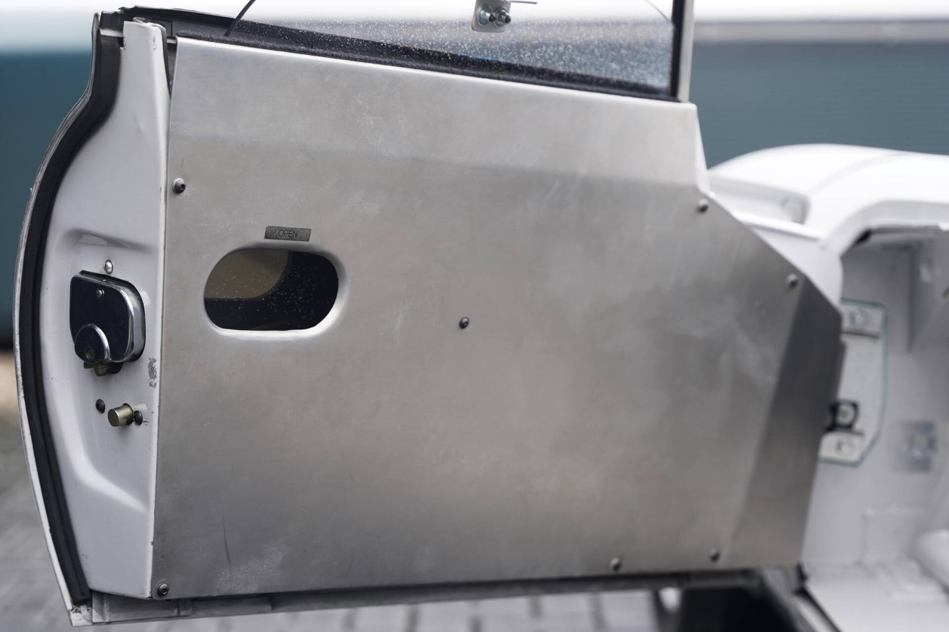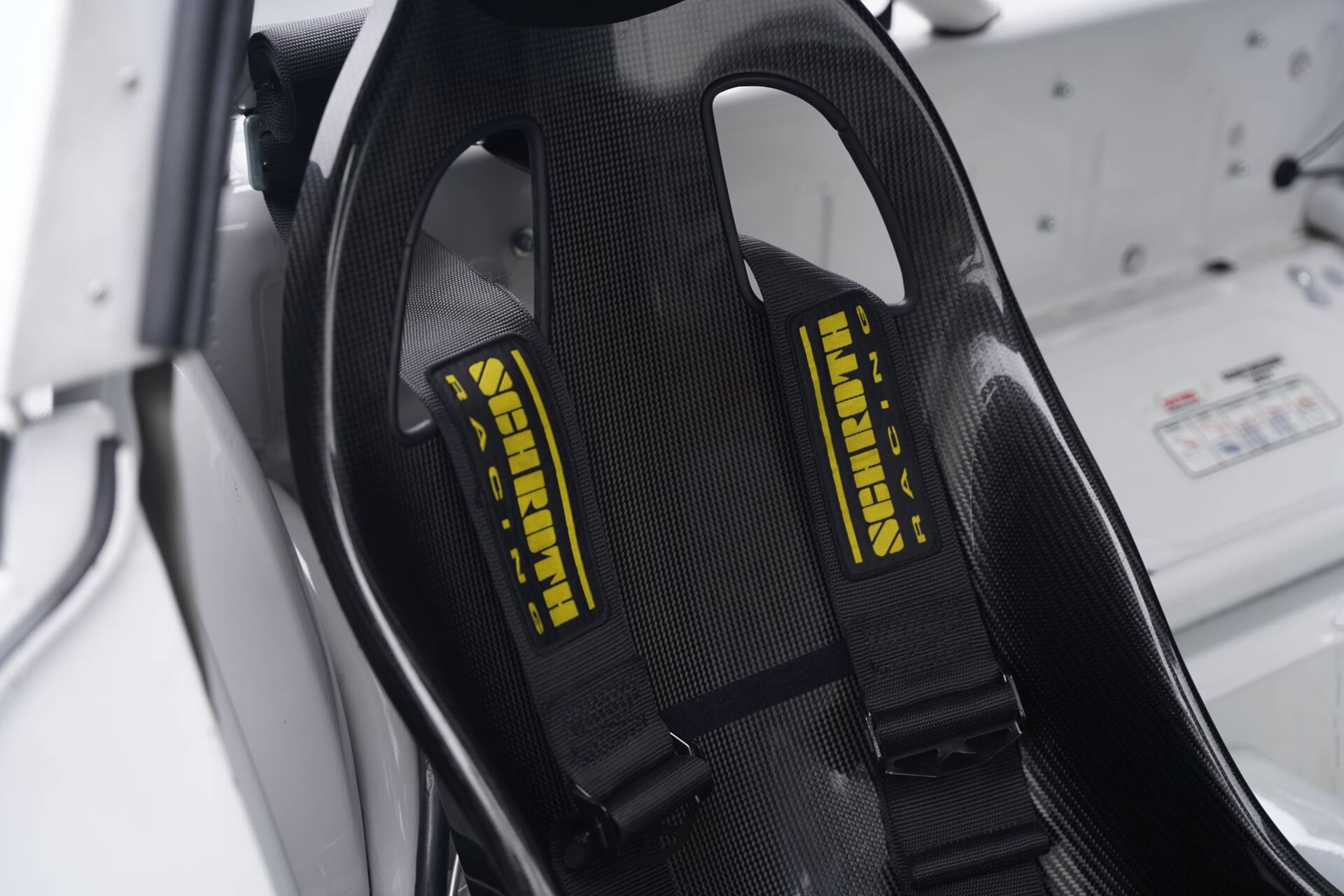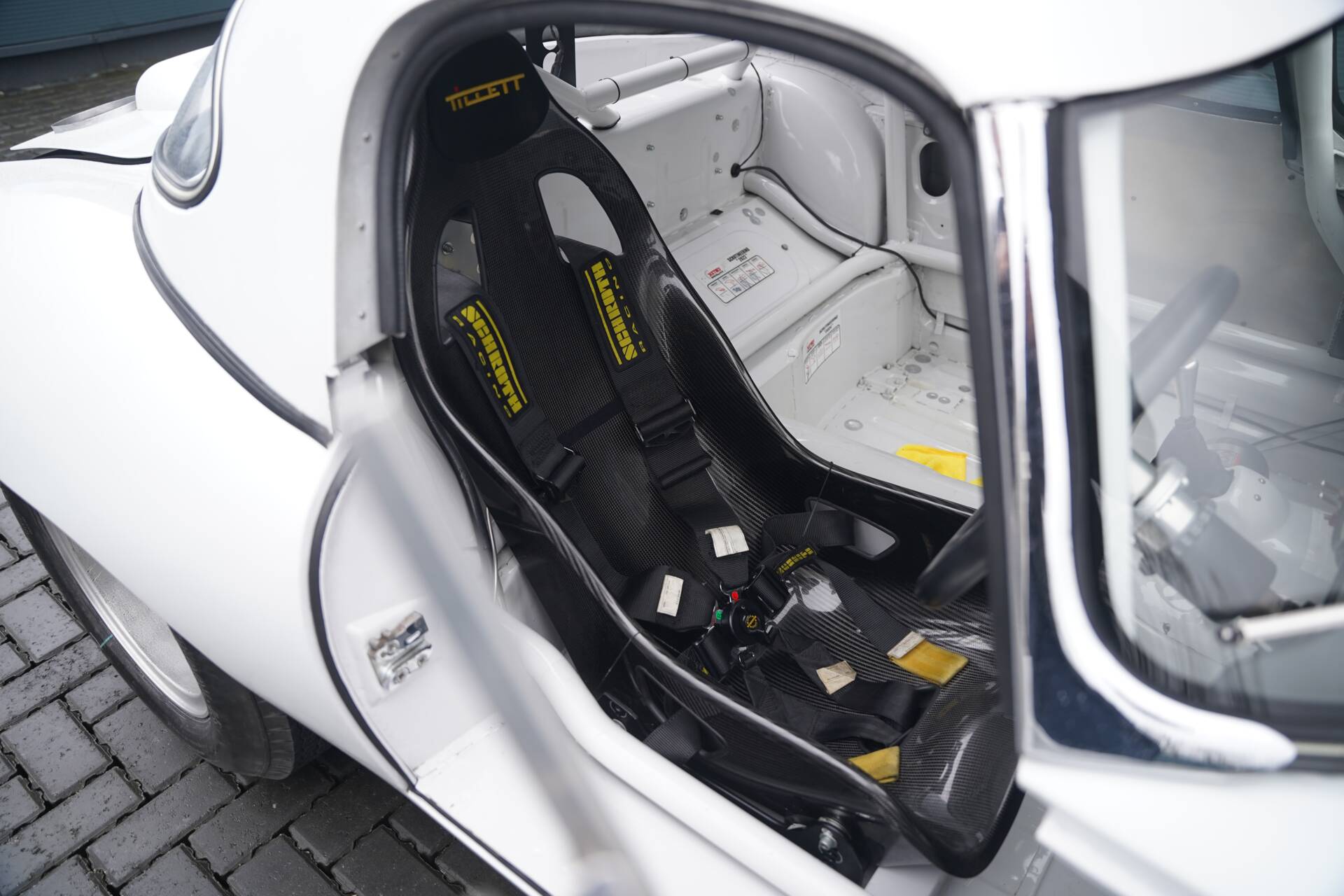 Visually, the Semi-Lightweight strikes a purposeful stance. Wide-arch bodywork, louvred bonnet, vented hardtop and boot lid and magnesium wheels give the car an unmistakable presence, while remaining faithful to the original design language penned by Malcolm Sayer. Finished in an all-white wrap over the bare aluminium body(specified by the former owner to minimise weight, such was the attention to competitive edge during the original build), the car presents a blank canvas for a livery, or can be left as-is for a cleaner aesthetic. Inside, the cars purpose is clear. A carbon fibre Tillet race seat with 6-point Schroth harness offers a lightweight solution for the driver. The vital parameters are monitored via Racetech gauges and a plumbed in Lifeline fire extinguisher provides another level of safety within.