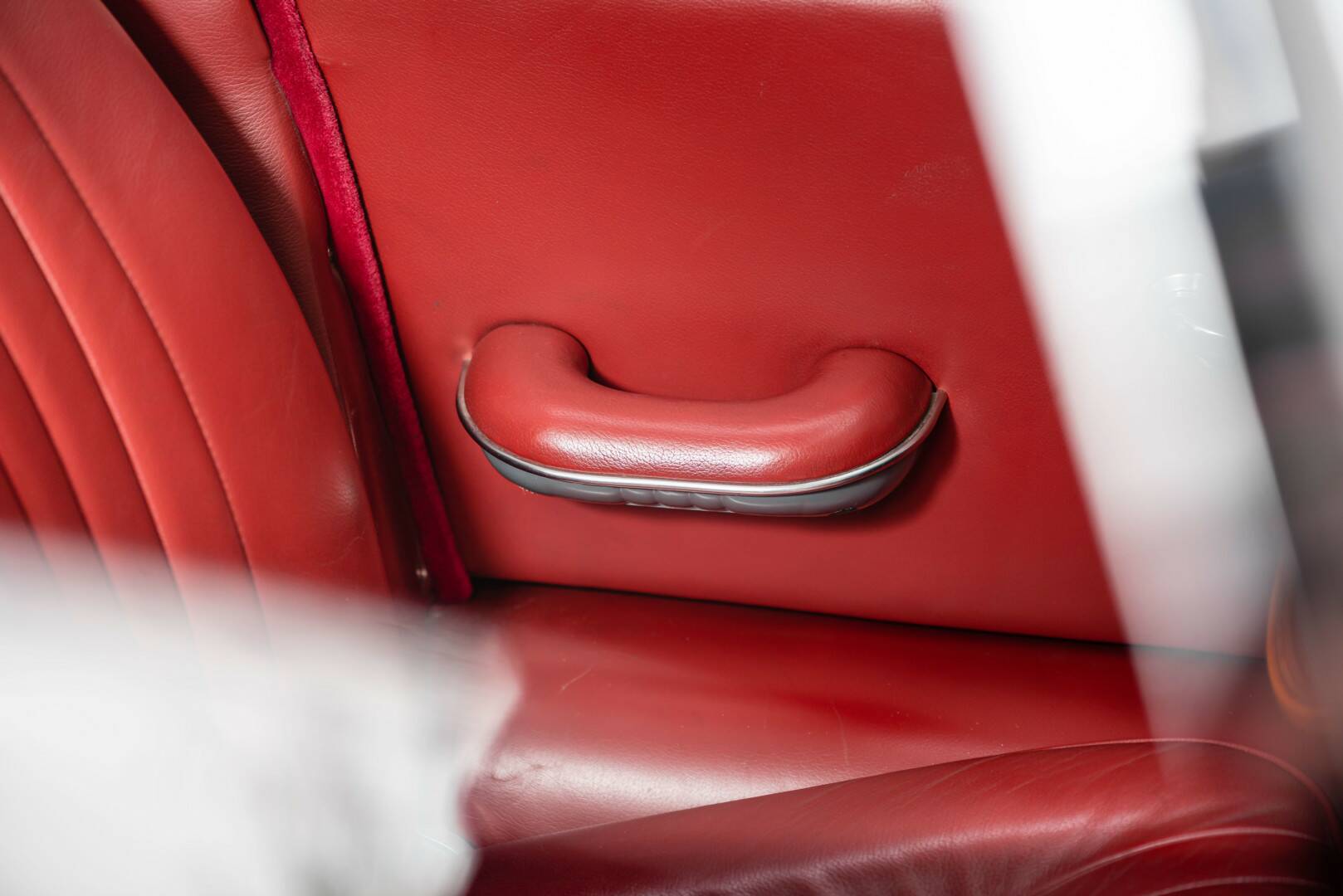 Les cuirs rouges, soigneusement sélectionnés, sont aujourd’hui encore dans un état remarquable. À l’époque, nous avions réalisé un intérieur sur mesure entièrement en cuir, conciliant modernité et respect de l’esthétique Jaguar.