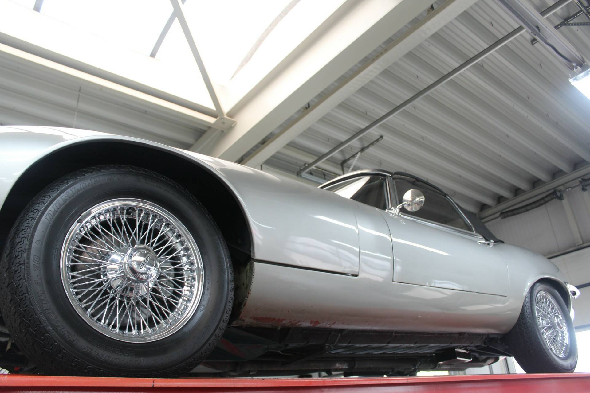 Jaguar E-Type V12 Roadster "Highly authentic" only 33.000 KM! Two owner car ,Mostly in the original paint - Very original condition, History with two owners - documented with factory documents and registration papers, "Opalescent Silver Grey over Red leather", "Even the door keys are matching numbers", Beautiful and precise fits and seams of the body panels, Ultimate E-type for originality enthusiasts,