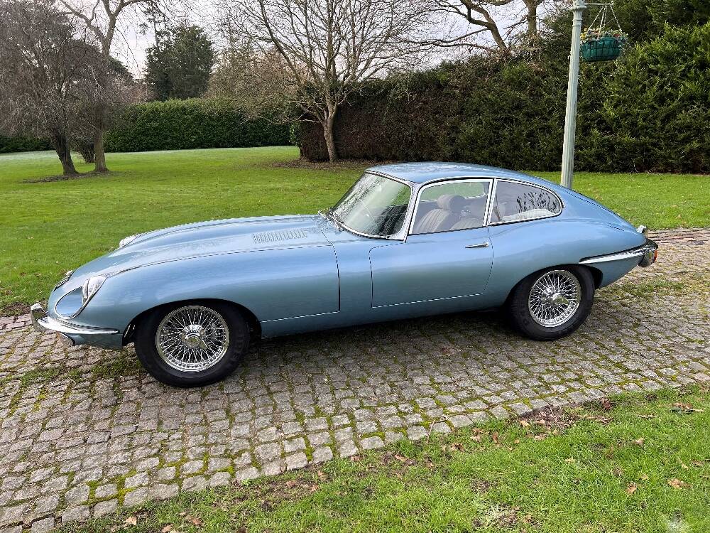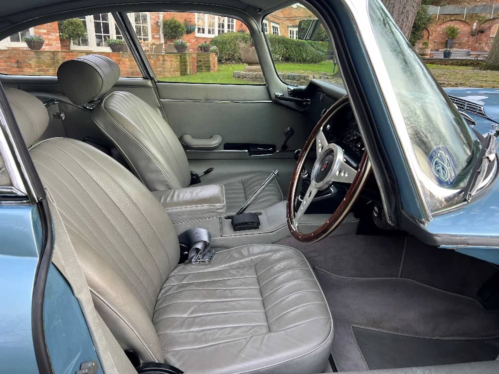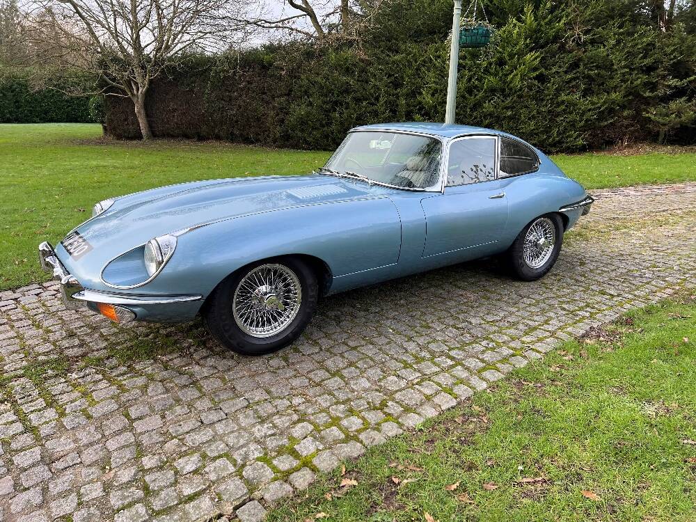 1970 Jaguar E type SII FHC in Opalescent Pale Blue with contrasting Grey hide interior. This is a beautiful and extremely well cared for original right hand drive, UK supplied example that I have known for the past 10 years, when it was acquired by a close friend who sadly passed away just before Christmas. He was a BRDC member with a long motoring history and he will be sadly missed. He purchased this E type about 10 years ago and it was his pride and joy and it was put to good use on various tours with the Guild of Motoring Writers of which he was a long term member. On viewing the car, you will find that the manner in which it has been kept and the resulting exceptional condition speaks for itself. Finished in one of the best colour combinations and sitting on perfect chrome wire wheels, it comes with an extremely detailed history file showing regular maintenance during his ownership and before. It is an absolute joy to drive and will undoubtedly bring a lot of pleasure to the next lucky owner. Please contact Martin Brewer for more detailed information.