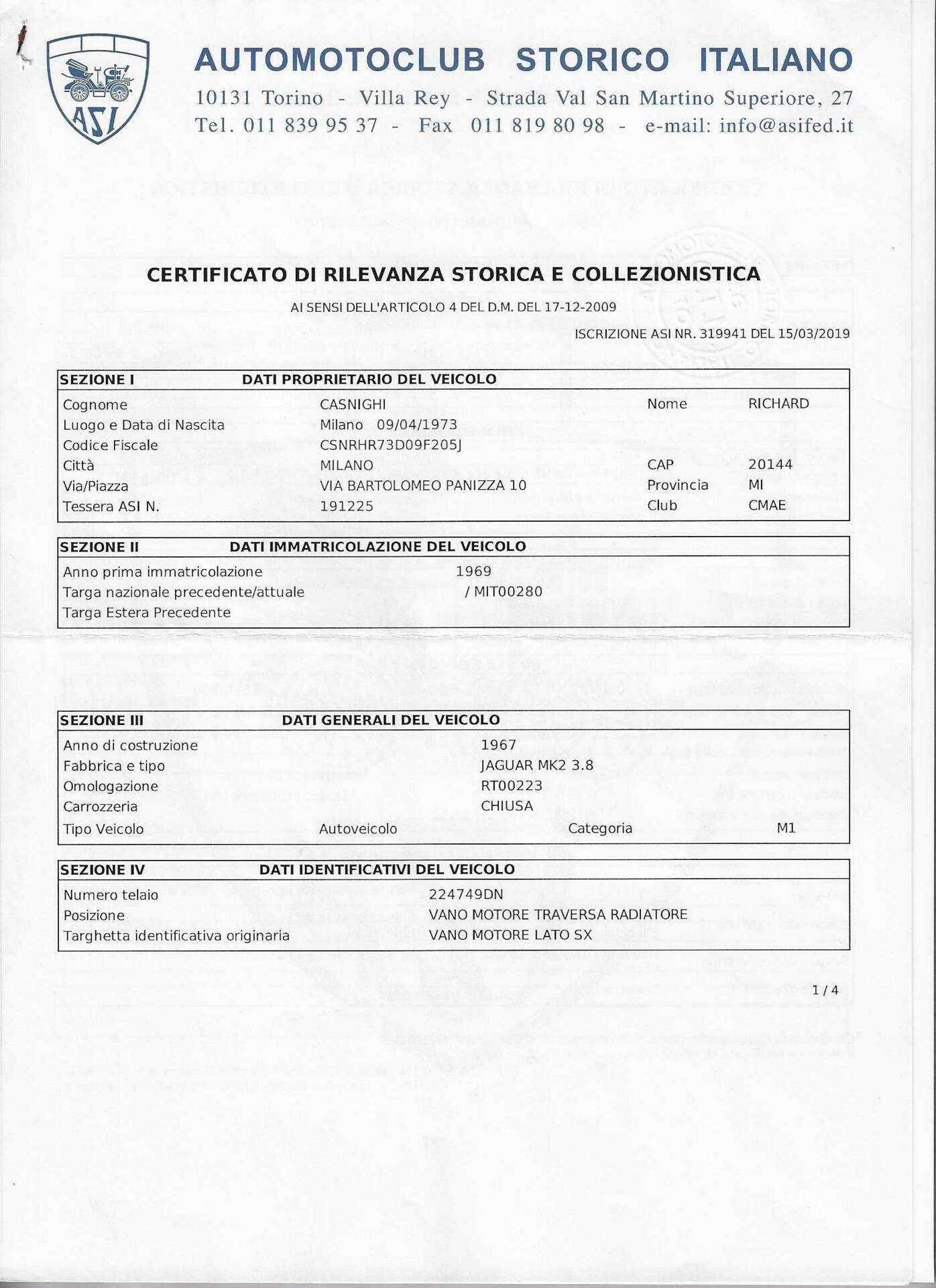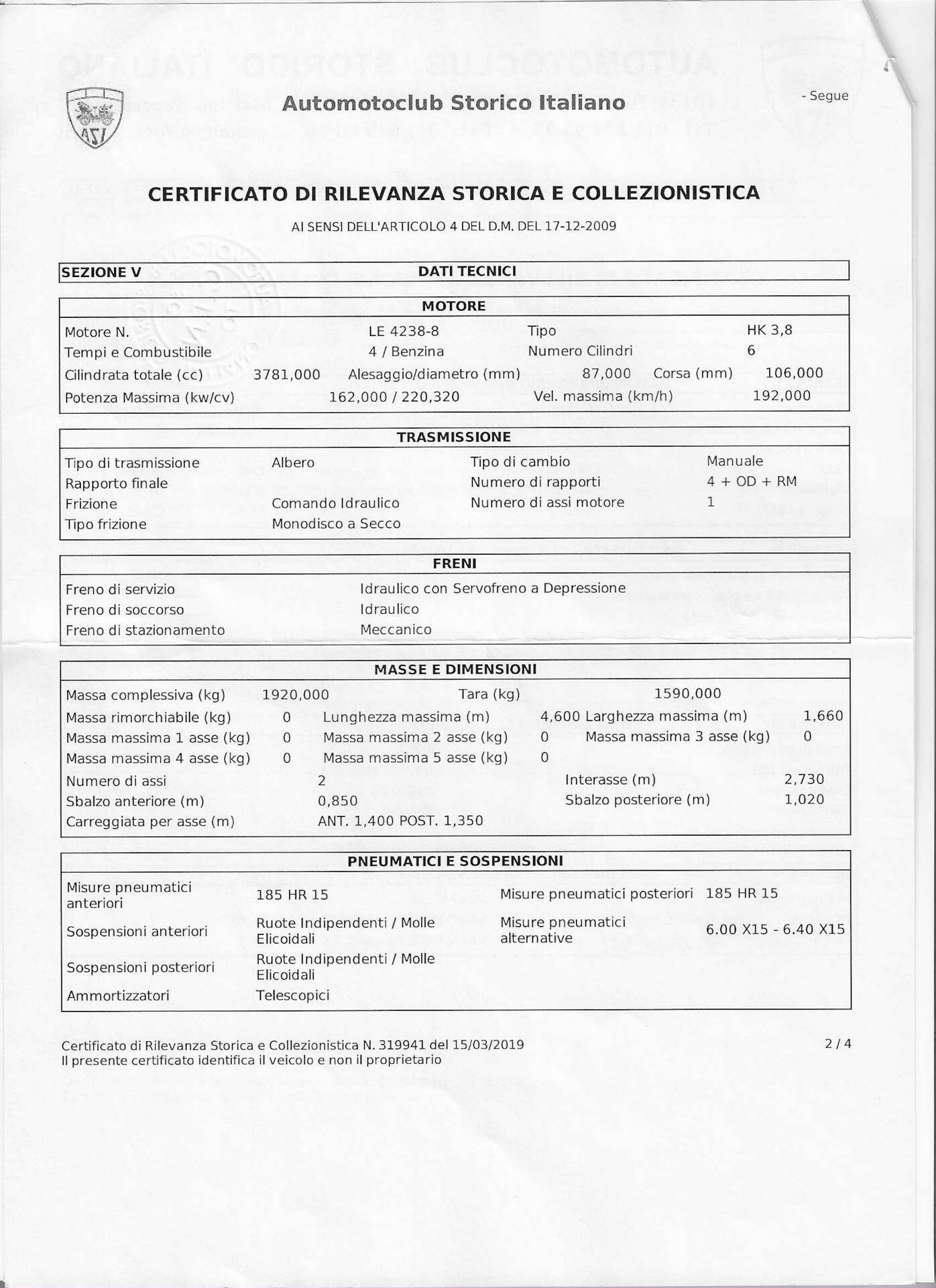 In 2019, the car was awarded the prestigious Jaguar Heritage Trust Certificate, confirming full matching numbers and original factory colors and specifications. The same year, it also obtained the ASI Certificate of Historical Significance, which grants access to Italian historic vehicle benefits (insurance, road tax exemption, and circulation privileges).