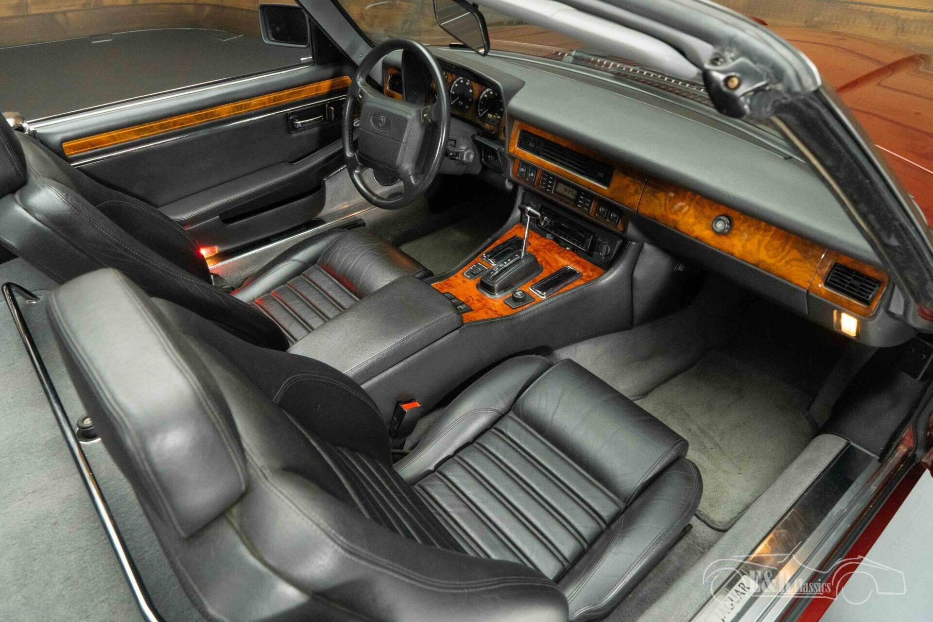 The exterior immediately catches the eye thanks to the deep red paintwork, which combines beautifully with the black soft top and the elegant lines of the XJS. The classic spoked wheels underscore the car's timeless character. The interior exudes pure Jaguar luxury: black leather seats, a dashboard with wood inlays, and a harmonious interplay of materials and colors. This convertible is well-equipped with climate control, cruise control, and a power soft top, windows, and seats. Everything is designed for comfortable and stylish driving, whether with the roof down on a summer day or closed for longer journeys.
