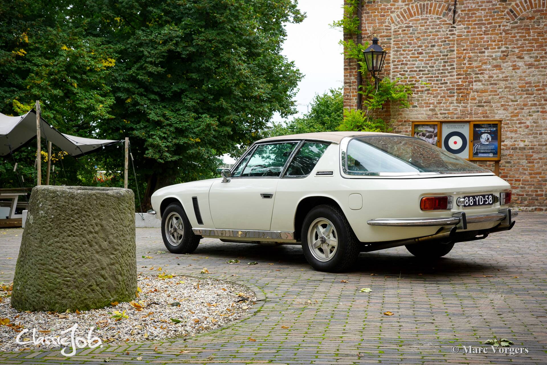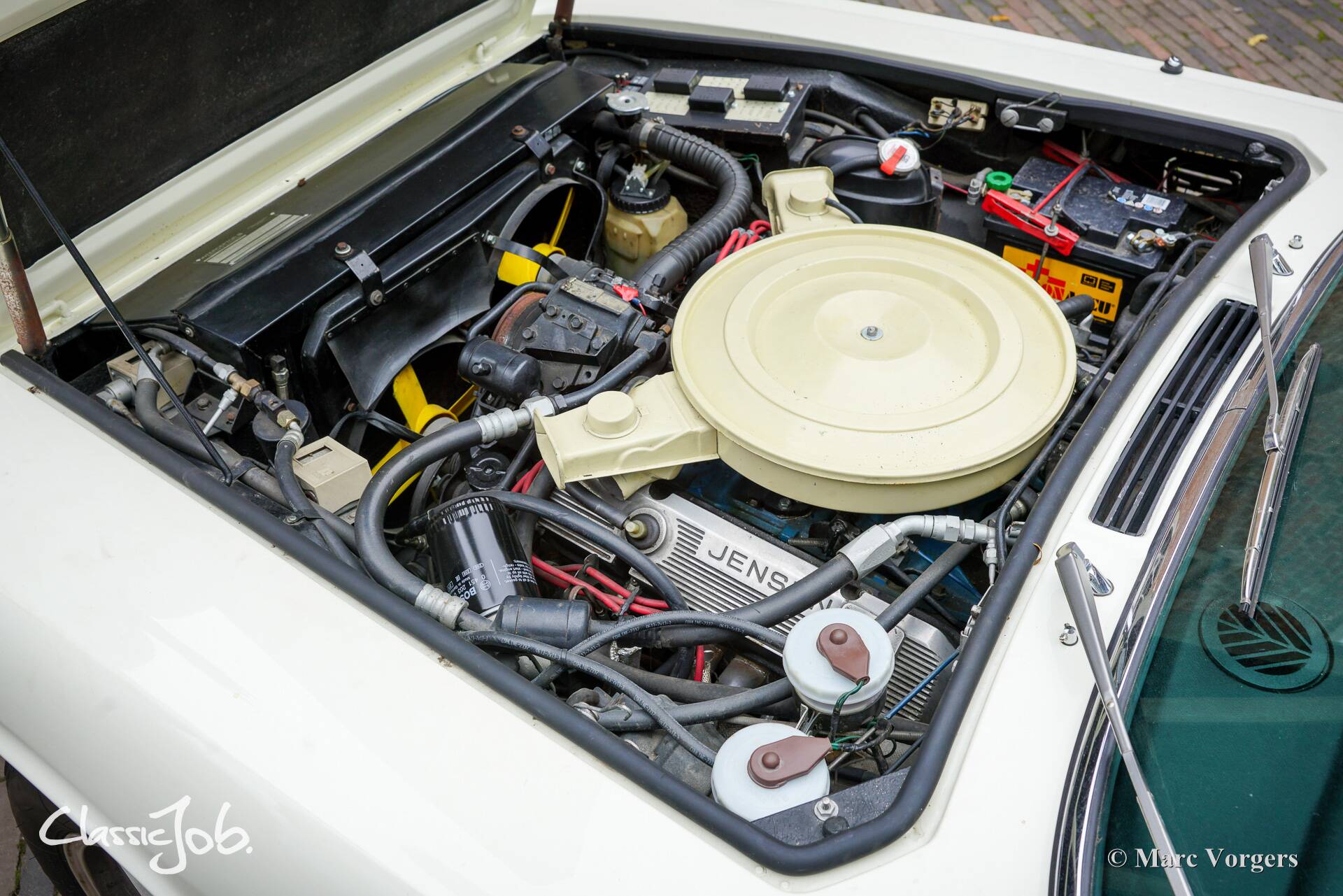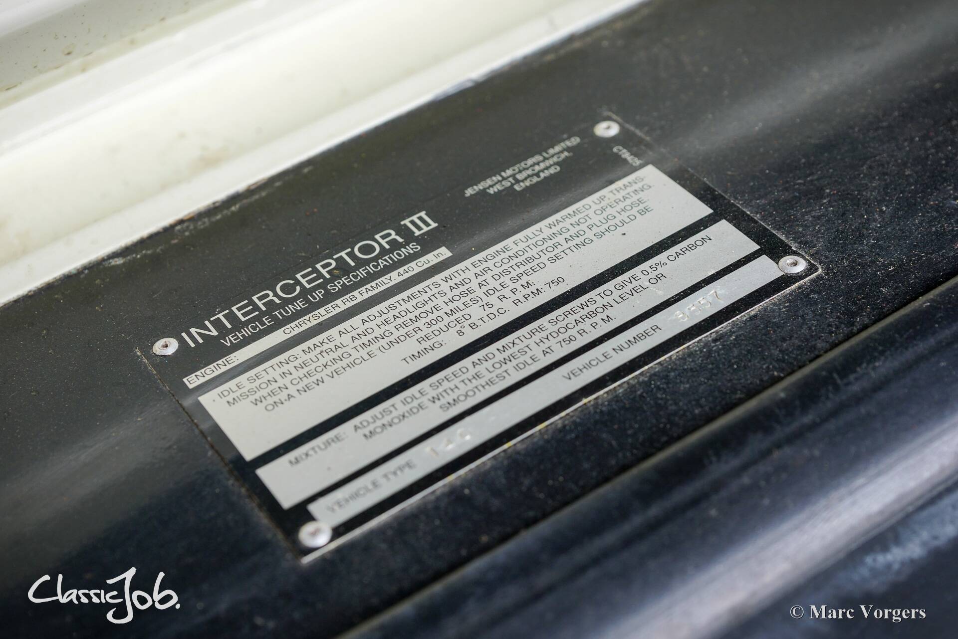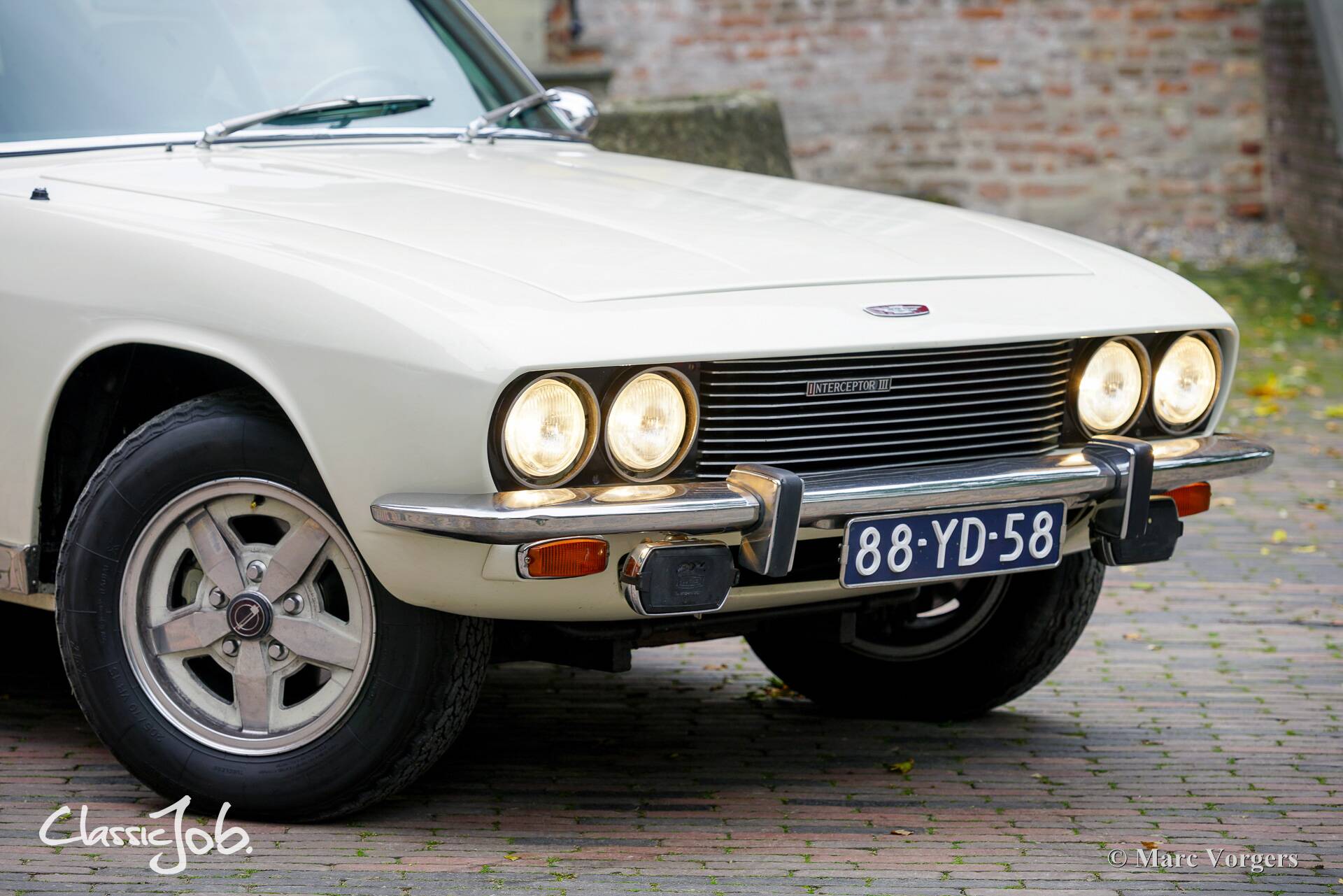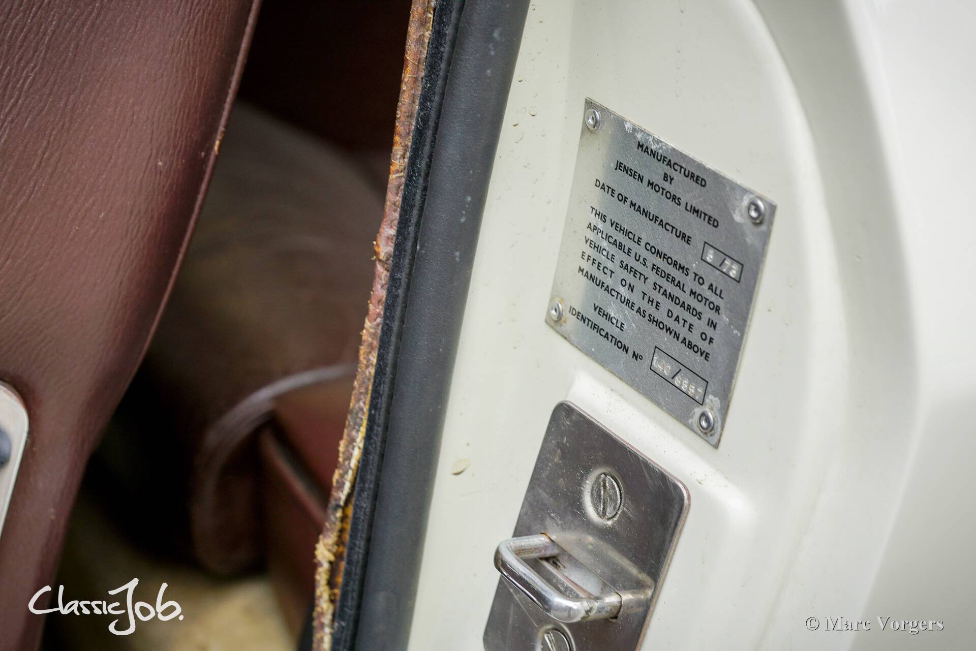 Jensen Interceptor III coupé, bouwjaar 1972. Autonummer 8557. Eerste registratie 1 januari 1973. Exterieurkleur wit gecombineerd met een bruin lederen interieur afgewerkt met lichtbeige tapijt. Deze indrukwekkende Jensen Interceptor is in oktober 2021 door de huidige eigenaar naar Nederland geïmporteerd. De kilometerstand was toen 63122 mijl. De auto, die toen in een redelijke originele staat verkeerde, werd naar klassieker- en Jensen-specialist Schackman in Nederland gebracht, waar de auto grotendeels werd gedemonteerd voor restauratie. In 2022 is de auto naar Classic Job gebracht voor een volledige carrosserierestauratie, waarbij het slechte plaatwerk werd gerepareerd en de auto werd voorzien van een perfect nieuw laksysteem in de originele kleur. Ook de originele lichtmetalen velgen zijn door Classic Job gerestaureerd. Nadat de carrosserie klaar was, is de auto teruggebracht naar Schackman om opnieuw te worden opgebouwd. De voorruit en ramen zijn teruggeplaatst, de kabelboom is gedeeltelijk vernieuwd, het dashboard is gerestaureerd en diverse onderdelen zijn opnieuw verchroomd. Mechanisch en technisch is alles gecontroleerd, afgesteld en up-to-date gebracht. Het originele lederen interieur, dat in goede staat verkeert, is behouden en de kofferbak is opnieuw bekleed. In totaal is er € 40.000 geïnvesteerd om de auto in de huidige zeer goede en prachtige staat te brengen! De grote 7,2 liter Chrysler-motor (288 pk/ 515 Nm!) loopt en klinkt perfect, de automatische versnellingsbak met 3 versnellingen schakelt zeer goed en de auto rijdt en klinkt indrukwekkend! De auto is toegevoegd aan de collectie en heeft niet veel gereden; de kilometerteller staat momenteel op slechts 63.803 mijl. De Jensen Interceptor III is een Britse grand tourer die ingetogen stijl combineert met betrouwbare prestaties. Ontworpen door Touring in Milaan en gebouwd in West Bromwich, beschikt hij over een ruime 2+2 coupé-indeling en een opvallende, omlopende achterruit die een vleugje karakter toevoegt. Het is een auto die Brits vakmanschap en charme uit die tijd uitstraalt zonder de aandacht te trekken. In totaal werden er tussen augustus 1971 en december 1976 slechts 4255 exemplaren gebouwd. Dit is een fantastische rijdersauto en een geweldige aanvulling op een klassieke sportwagencollectie. Deze auto is alleen op afspraak beschikbaar voor bezichtiging en een testrit.