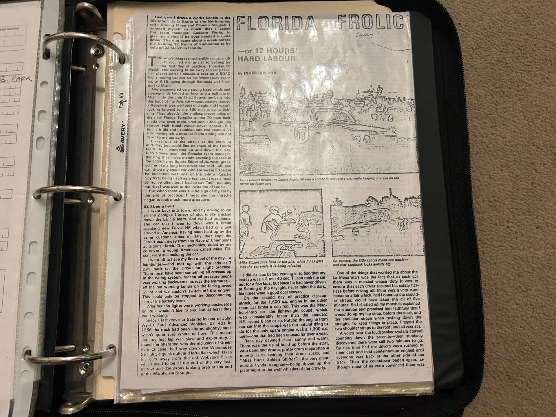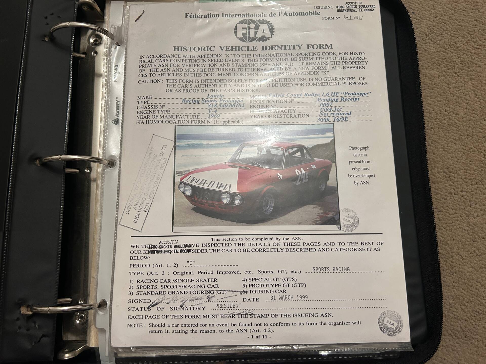 Built by HF Squadra Corse in late 1968, Chassis 818.540*001002 was shipped from Turin to the USA and handed over to Lancia’s US importer, Algar Enterprises, for endurance racing and specifically the 1969 Sebring 12 Hours in 1969, to be raced by Innes Ireland and a young American mechanic-turned-driver named Michael Tillson, who worked for Algar. As documented by Ireland in his column in the 8 May 1969 issue of Autocar (and recounted by Nigel Trow in his well known book ‘Lancia Racing’), the day before the car arrived the Fulvia Sport of Maglioli lost its engine in practice, and the 1600 engine from #1002 was swapped into the Sport. #1002’s engine was replaced with a 1.3HF 818.342 engine, which resulted in a frustrating race for Ireland & Tillson, as the car’s gearbox (818.540.0016 at the time) was geared for the 1600 engine.
