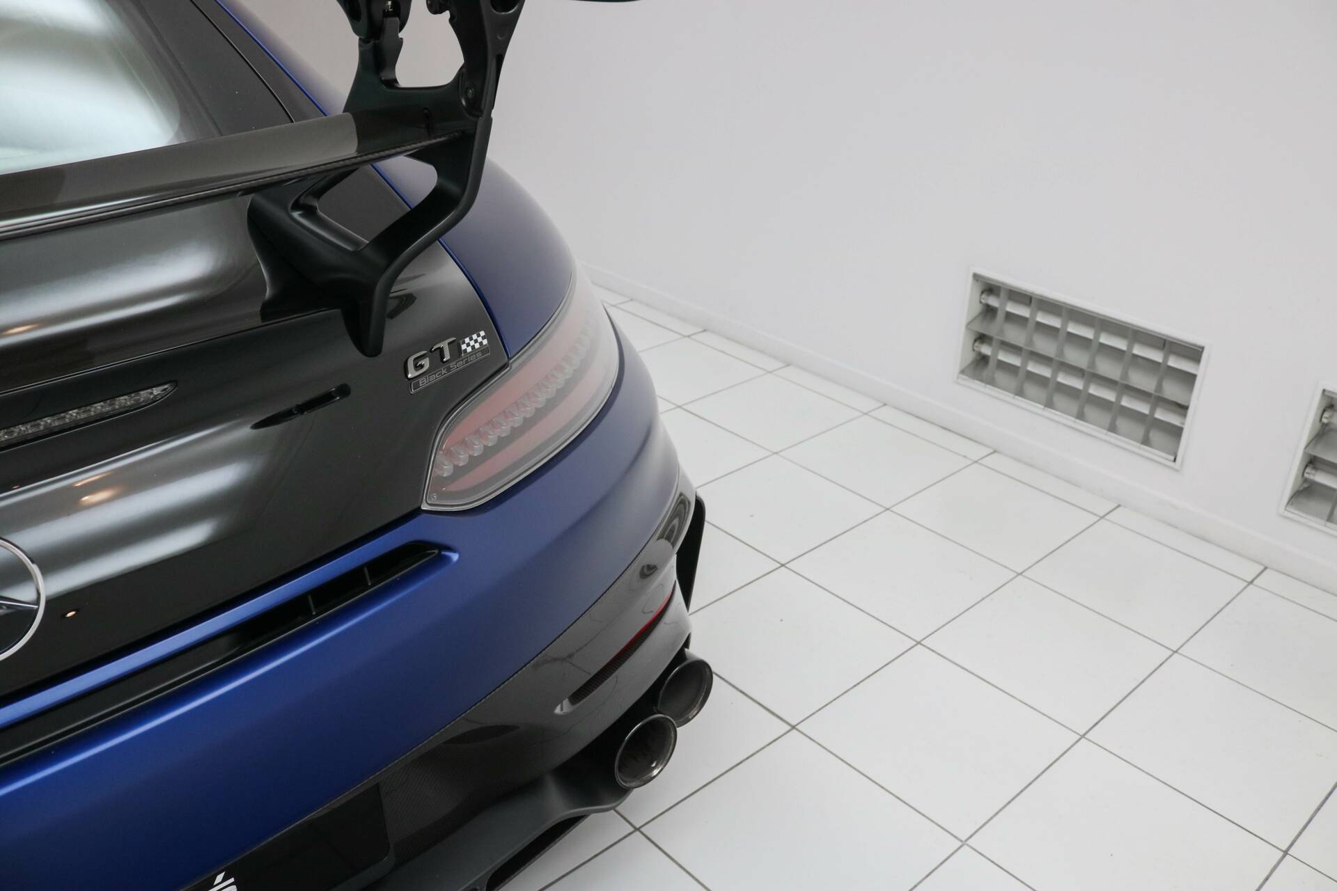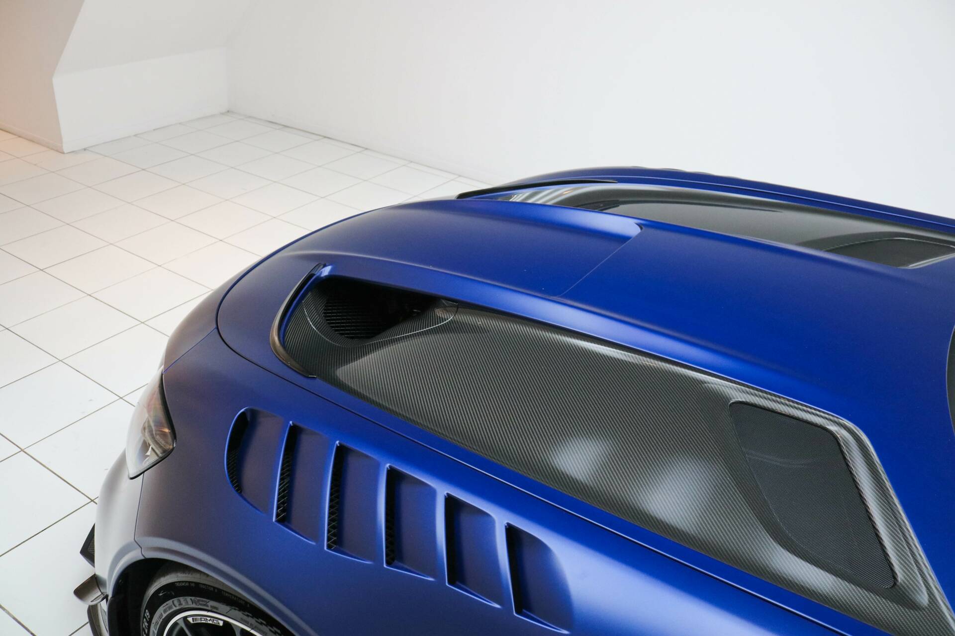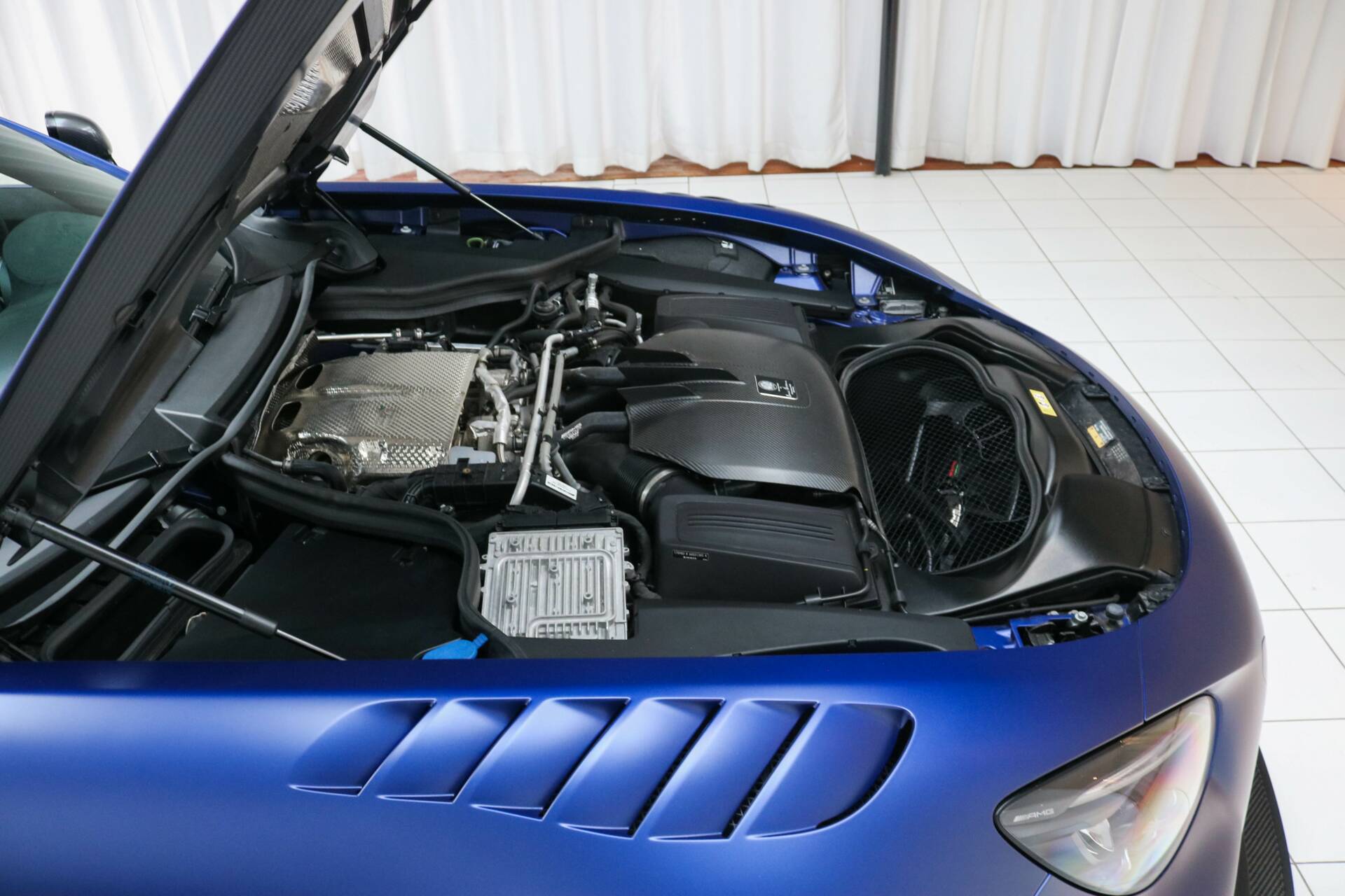 Lackiert in Manufaktur Brilliantblau Magno. Die Karosserie befindet sich vollständig im Originallack und ist unfallfrei. Ausgestattet mit dem AMG Carbon Exterieur-Paket mit zahlreichen sichtbaren Carbon-Elementen. Typische Black Series Merkmale sind der vergrößerte Panamericana-Kühlergrill, die aggressive Frontschürze mit großen Lufteinlässen, der verstellbare Carbon-Heckflügel, der markante Diffusor sowie die leichte Motorhaube mit Luftauslässen. Das Fahrzeug steht auf 19-Zoll-Front- und 20-Zoll-Hinterrädern.