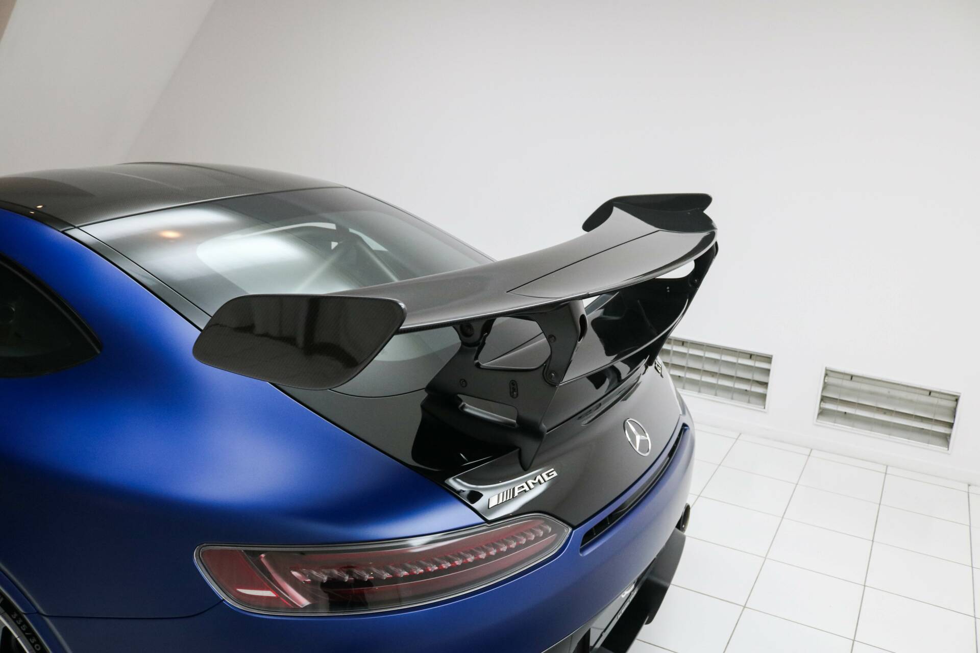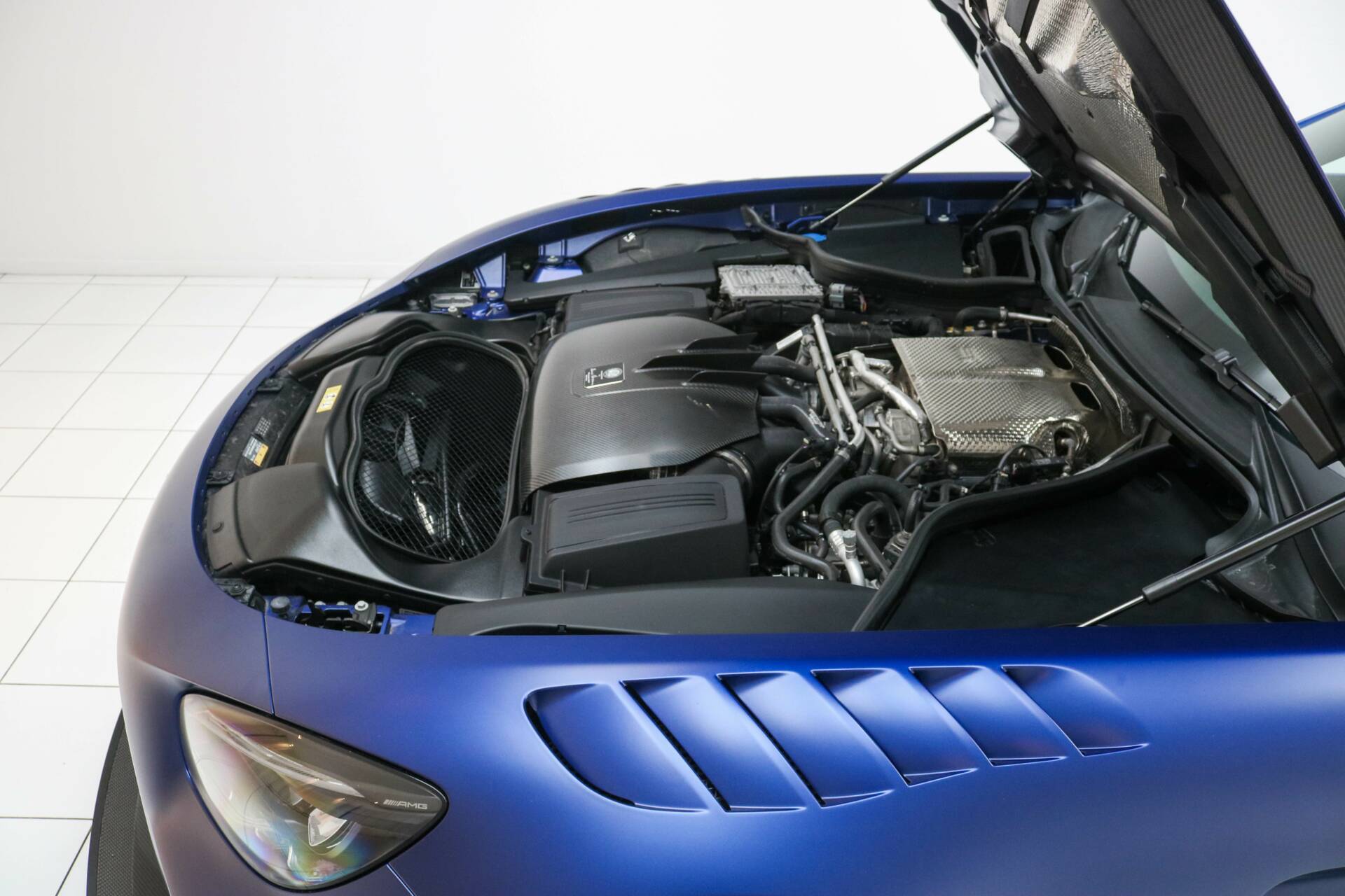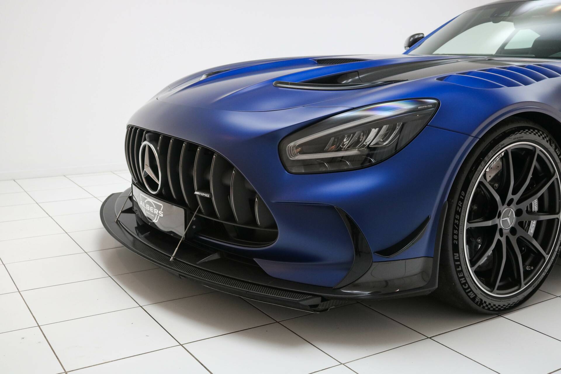 Lackiert in Manufaktur Brilliantblau Magno. Die Karosserie befindet sich vollständig im Originallack und ist unfallfrei. Ausgestattet mit dem AMG Carbon Exterieur-Paket mit zahlreichen sichtbaren Carbon-Elementen. Typische Black Series Merkmale sind der vergrößerte Panamericana-Kühlergrill, die aggressive Frontschürze mit großen Lufteinlässen, der verstellbare Carbon-Heckflügel, der markante Diffusor sowie die leichte Motorhaube mit Luftauslässen. Das Fahrzeug steht auf 19-Zoll-Front- und 20-Zoll-Hinterrädern.
