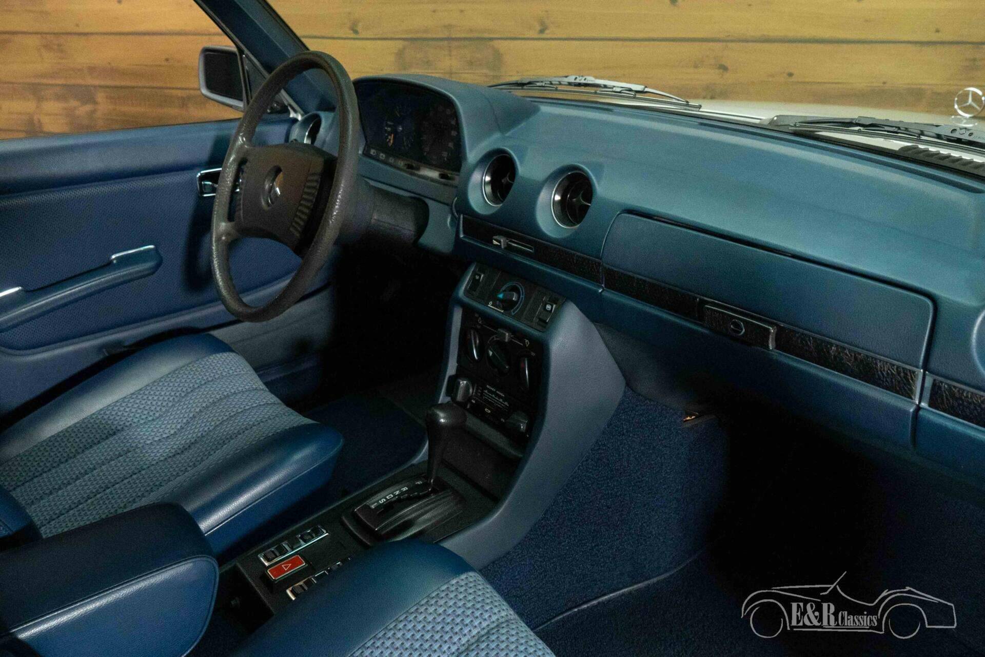 The exterior features stylish silver-gray metallic paintwork, which beautifully complements the elegant lines and subtle chrome details of the W123. The original steel wheels with hubcaps enhance the car's authentic character. Inside, you'll find a well-maintained dark blue interior, which beautifully contrasts with the light body color. The interior exudes solid German quality, with comfortable seats, power windows, and a classic Becker Monza radio that perfectly complements the ambiance of this Mercedes. All together, it creates a harmonious whole that combines luxury, comfort, and timeless design.