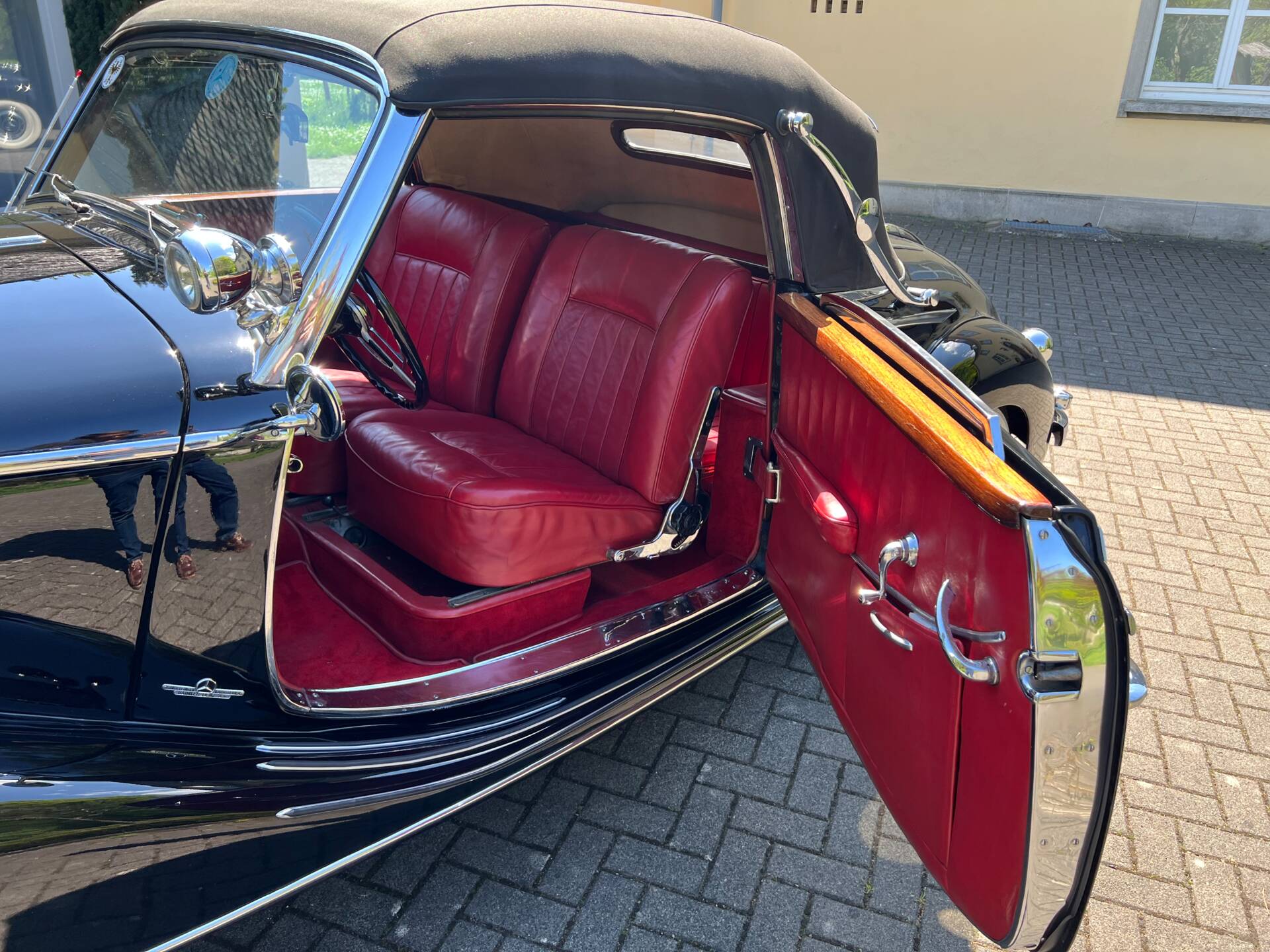 Das Fahrzeug präsentiert sich heute in einem sehr gepflegten Gesamtzustand. Die schwarze Lackierung zeigt einen schönen, tiefen Glanz und harmoniert hervorragend mit dem roten Lederinterieur, das dem Innenraum eine elegante und zugleich sportliche Note verleiht. Sitze, Verkleidungen und Armaturen vermitteln ein stimmiges Gesamtbild mit nur minimalen, altersgerechten Gebrauchsspuren. Das Stoffverdeck ist ebenfalls erneuert und befindet sich in sehr gutem Zustand.