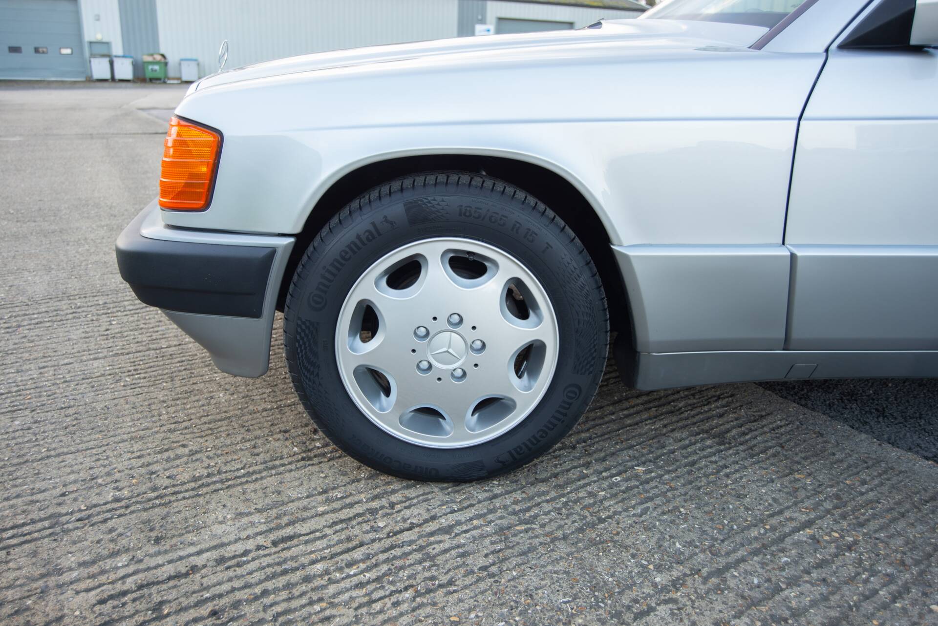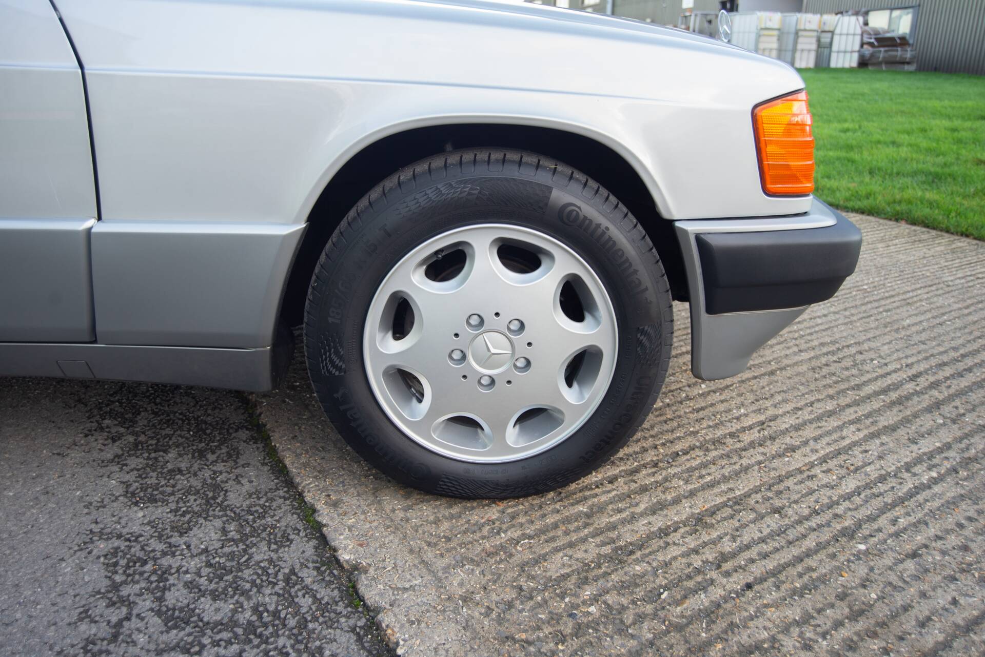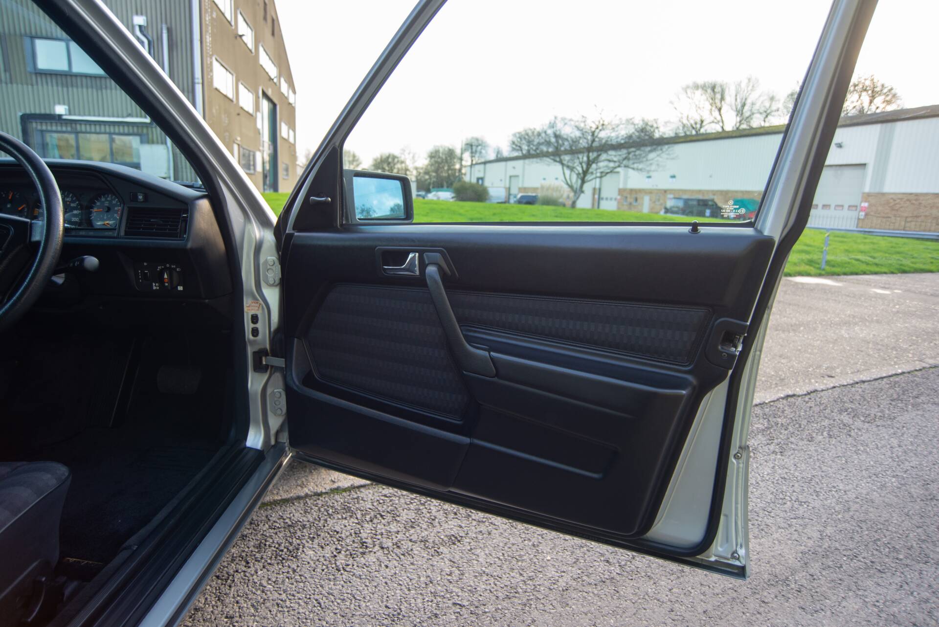 Finished in Brilliant Silver metallic with black cloth trim. Factory air conditioning, front and rear electric windows, alloy wheels, rear headrests and outside temperature display. The A/C is the rare one – whilst this was always available as an option, it is rare to see on 190s in the UK.
