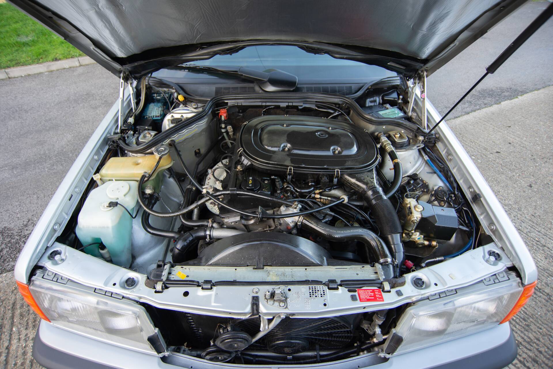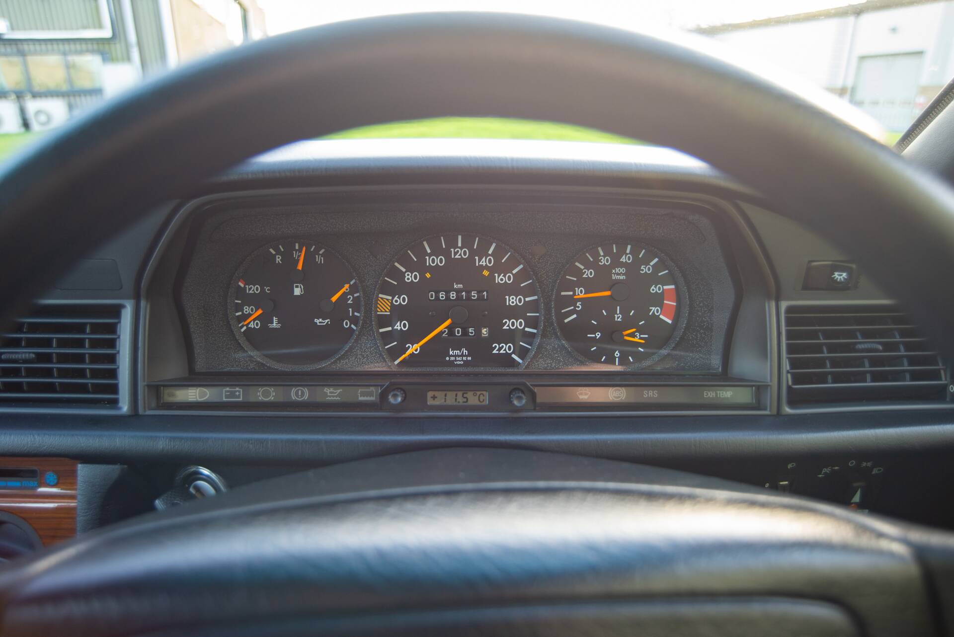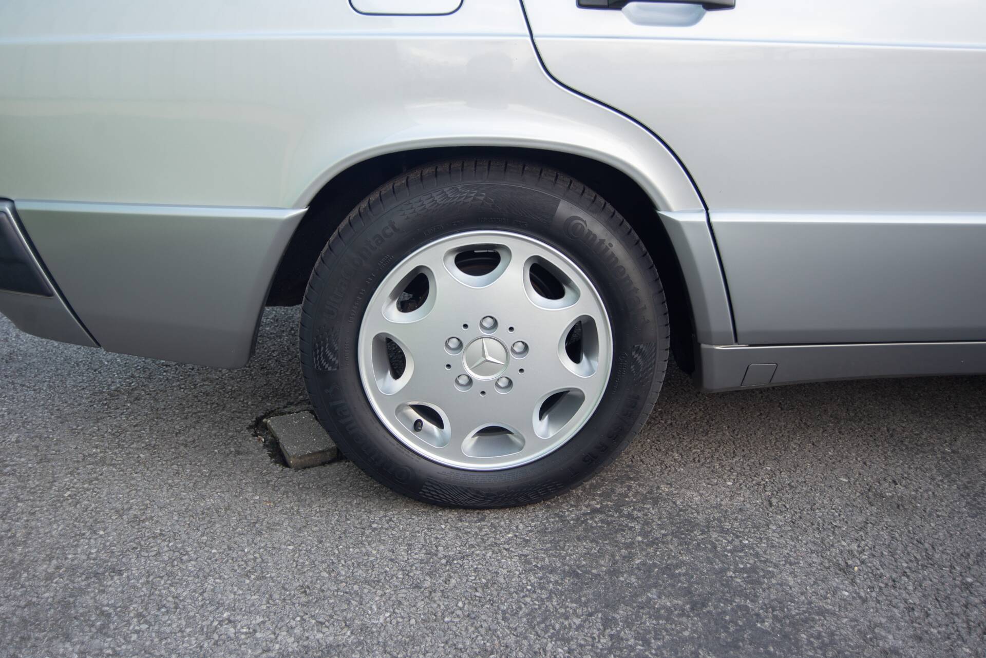 Finished in Brilliant Silver metallic with black cloth trim. Factory air conditioning, front and rear electric windows, alloy wheels, rear headrests and outside temperature display. The A/C is the rare one – whilst this was always available as an option, it is rare to see on 190s in the UK.