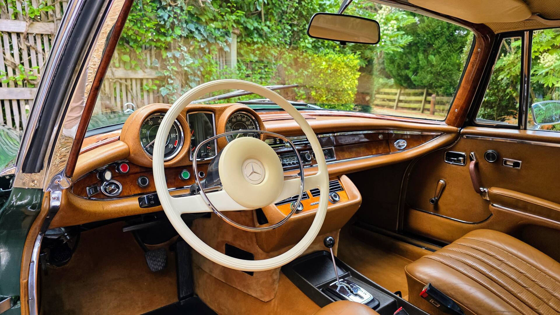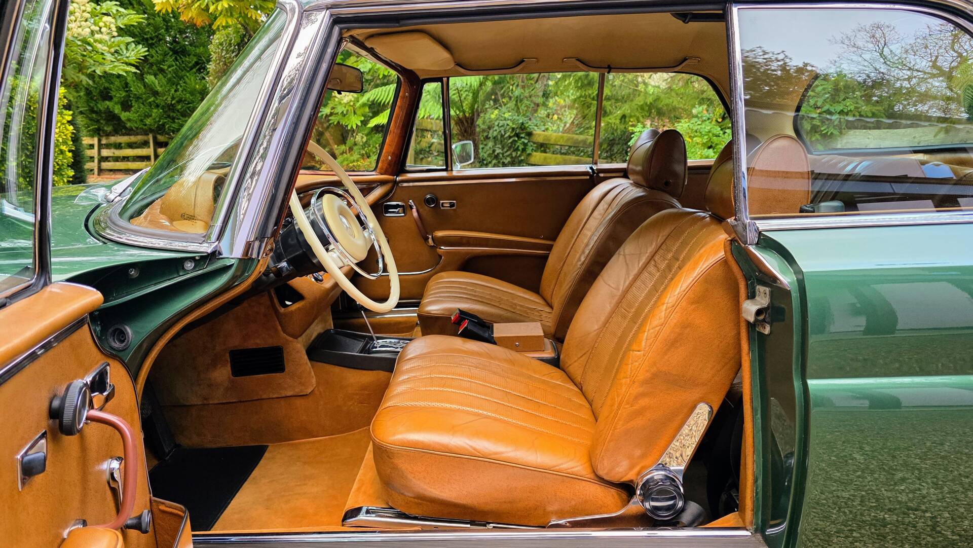 Der Innenraum ist mit cognacfarbenem Leder ausgestattet und besticht durch seinen wunderbar authentischen Charakter. Anstatt überrestauriert zu wirken, zeigt er eine perfekte, altersbedingte Patina, die dem Innenraum Wärme, Charme und ein authentisches Flair verleiht, das immer seltener zu finden ist. Es ist ein Ort, der sich richtig anfühlt, einladend ist und unverkennbar Mercedes-Benz verkörpert. Besonders hervorzuheben ist die seltene und begehrte Werksklimaanlage, die den Komfort und die Attraktivität dieses Fahrzeugs deutlich steigert.