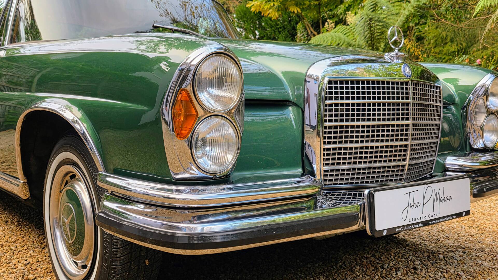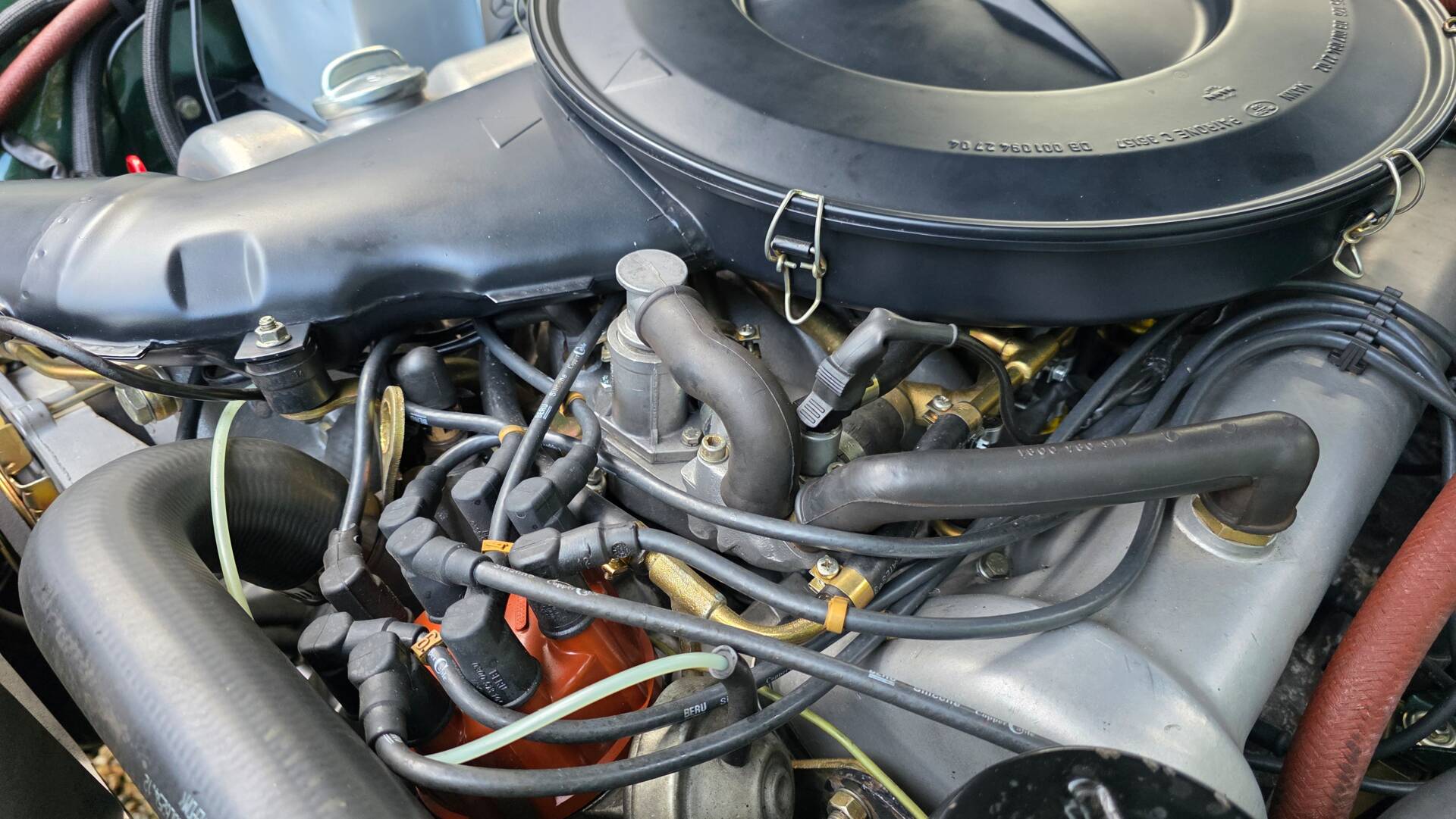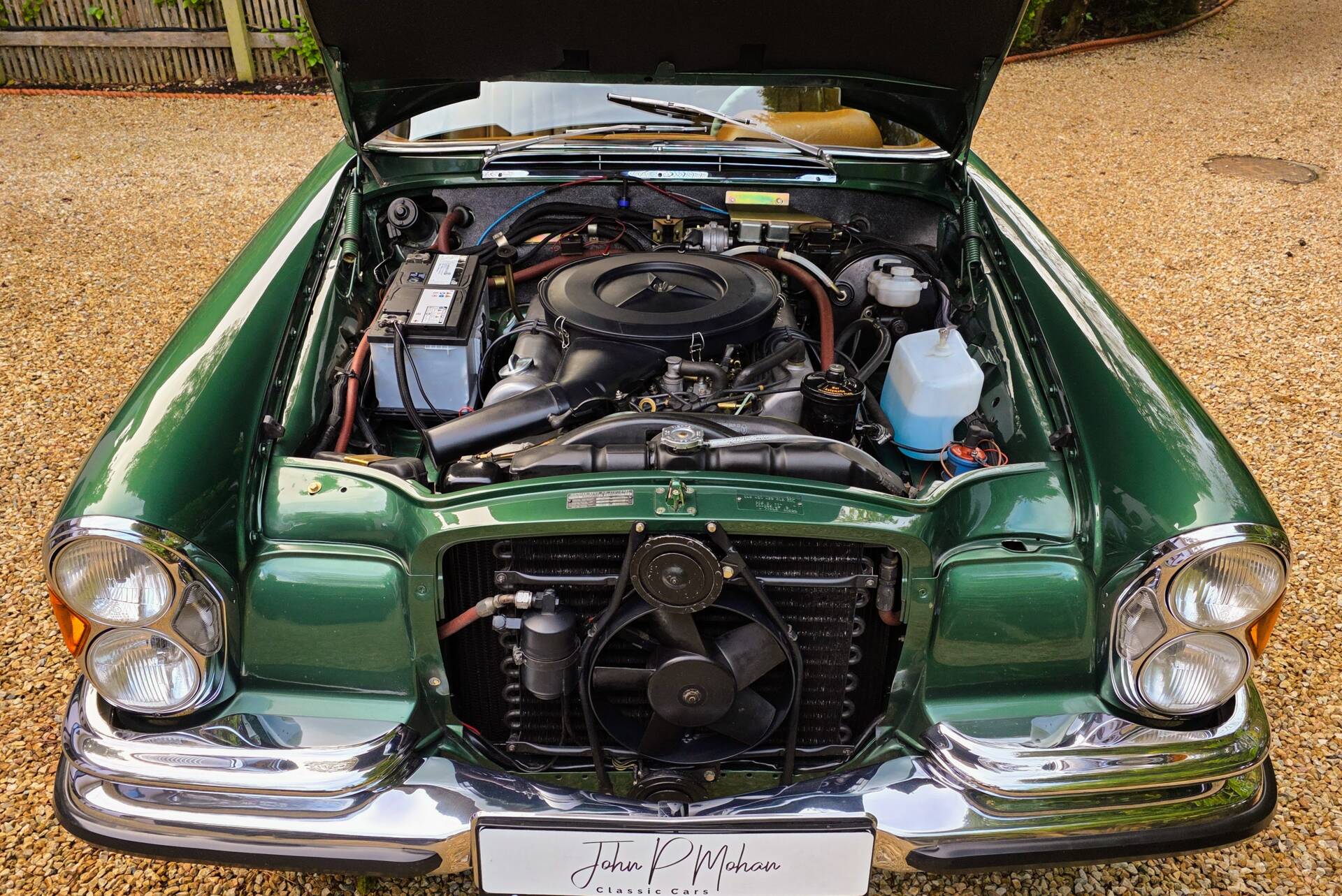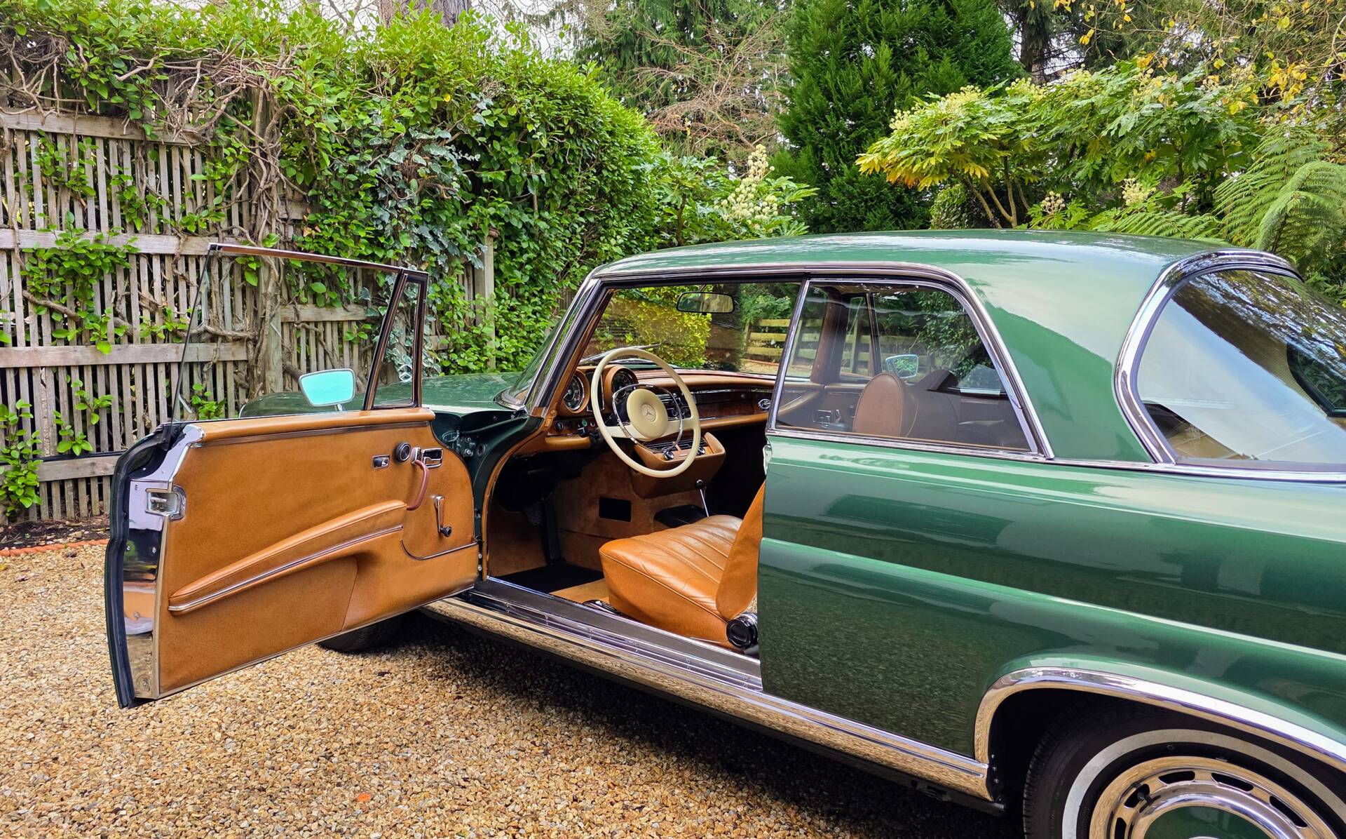 Die Karosserie in atemberaubendem Moosgrün-Metallic präsentiert sich in herausragendem Zustand. Sie ist von makelloser Schönheit, mit klaren Linien, exzellenter Spaltmaßsetzung und einem tiefen, glänzenden Lack, der perfekt zur säulenlosen Coupé-Silhouette passt. Chrom und Zierelemente sind ebenso beeindruckend und runden das markante und zugleich elegante Äußere ab.