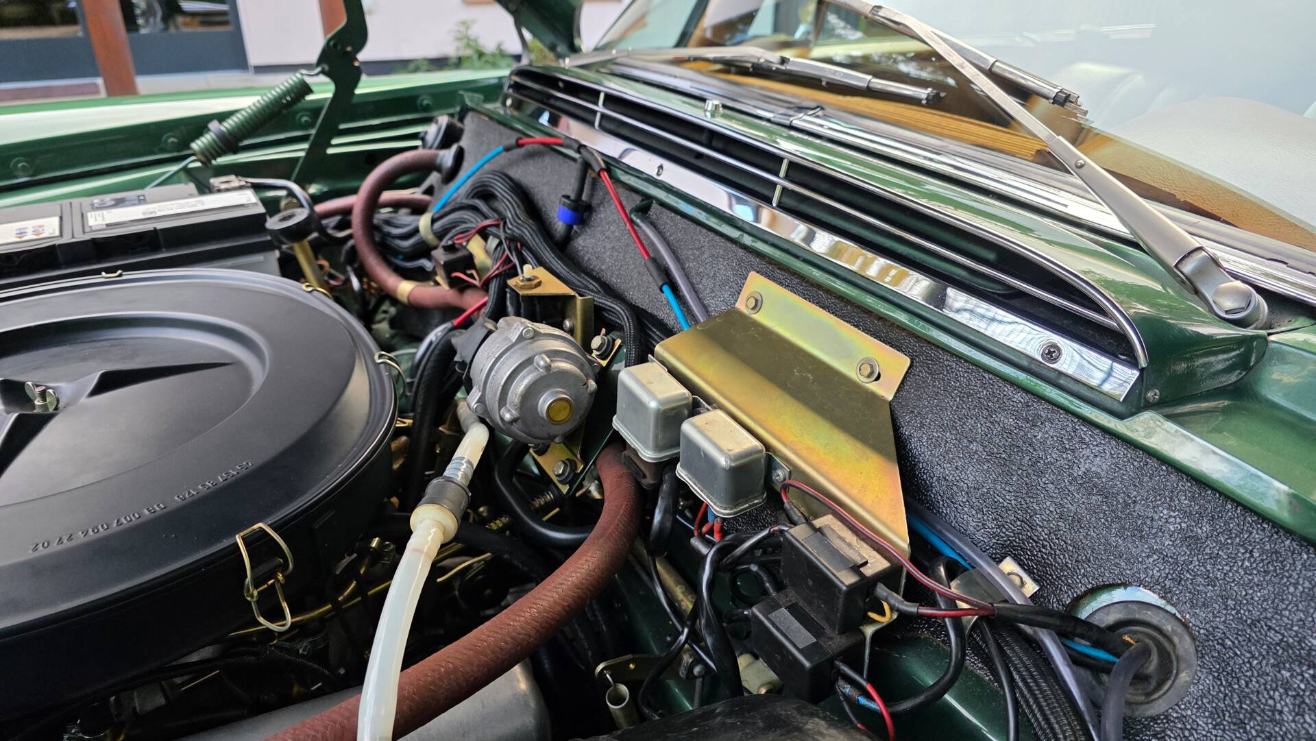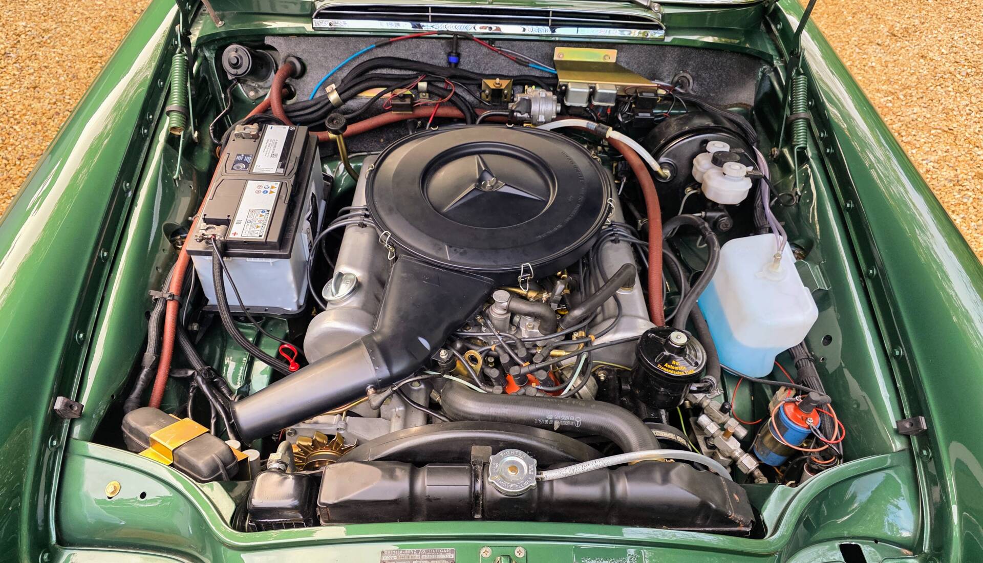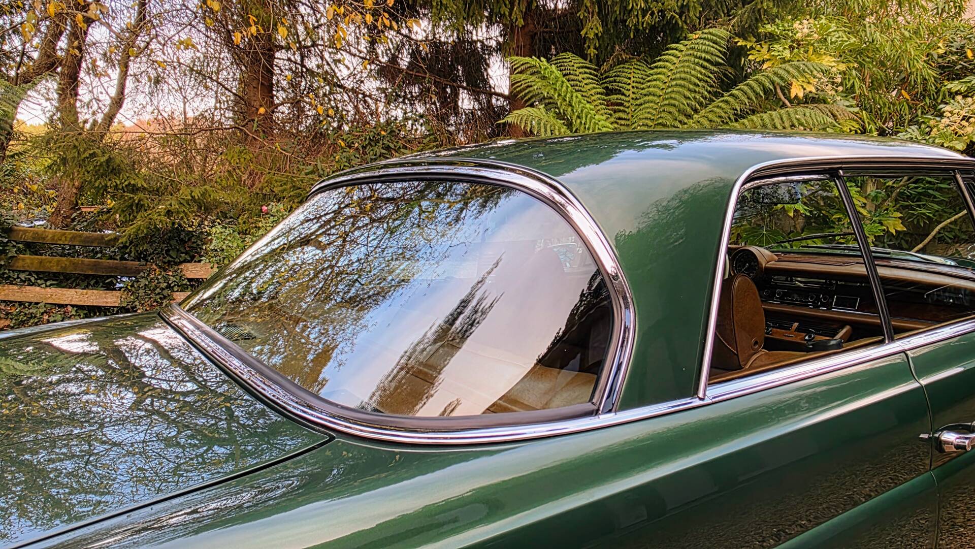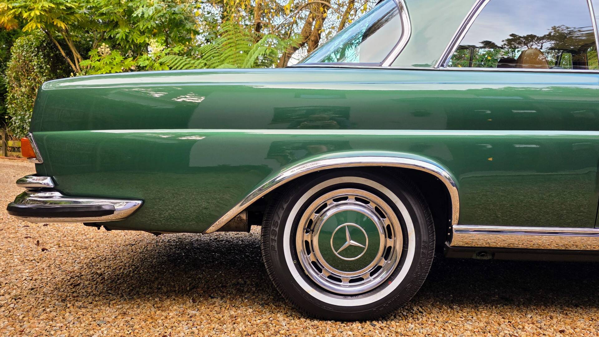 Die Karosserie in atemberaubendem Moosgrün-Metallic präsentiert sich in herausragendem Zustand. Sie ist von makelloser Schönheit, mit klaren Linien, exzellenter Spaltmaßsetzung und einem tiefen, glänzenden Lack, der perfekt zur säulenlosen Coupé-Silhouette passt. Chrom und Zierelemente sind ebenso beeindruckend und runden das markante und zugleich elegante Äußere ab.