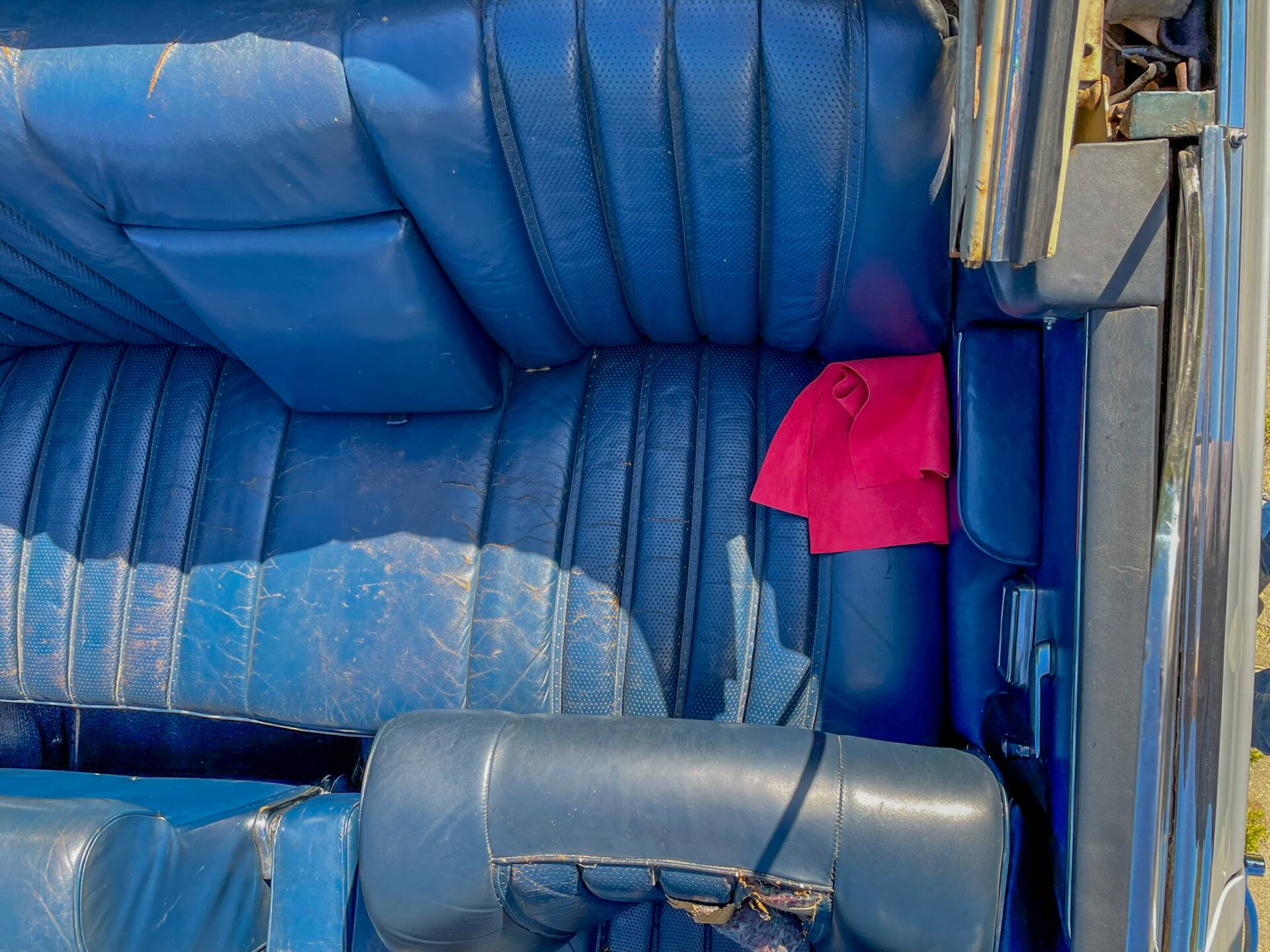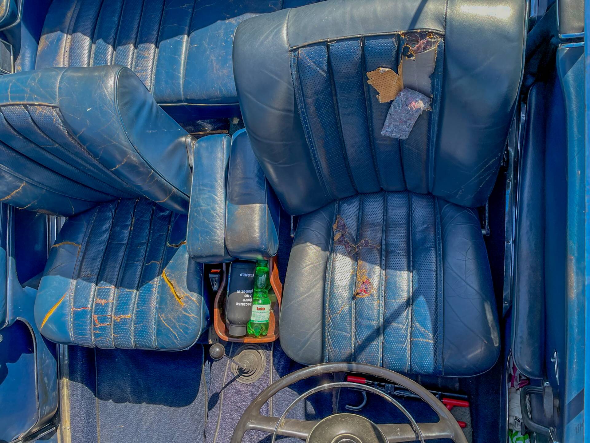 - es gab wohl mal einen Wasserschaden deutlich vor meiner Zeit, deswegen Abweichungen von der Lederfarbe innen und auch deswegen der schlechte Zustand vom Sitzleder