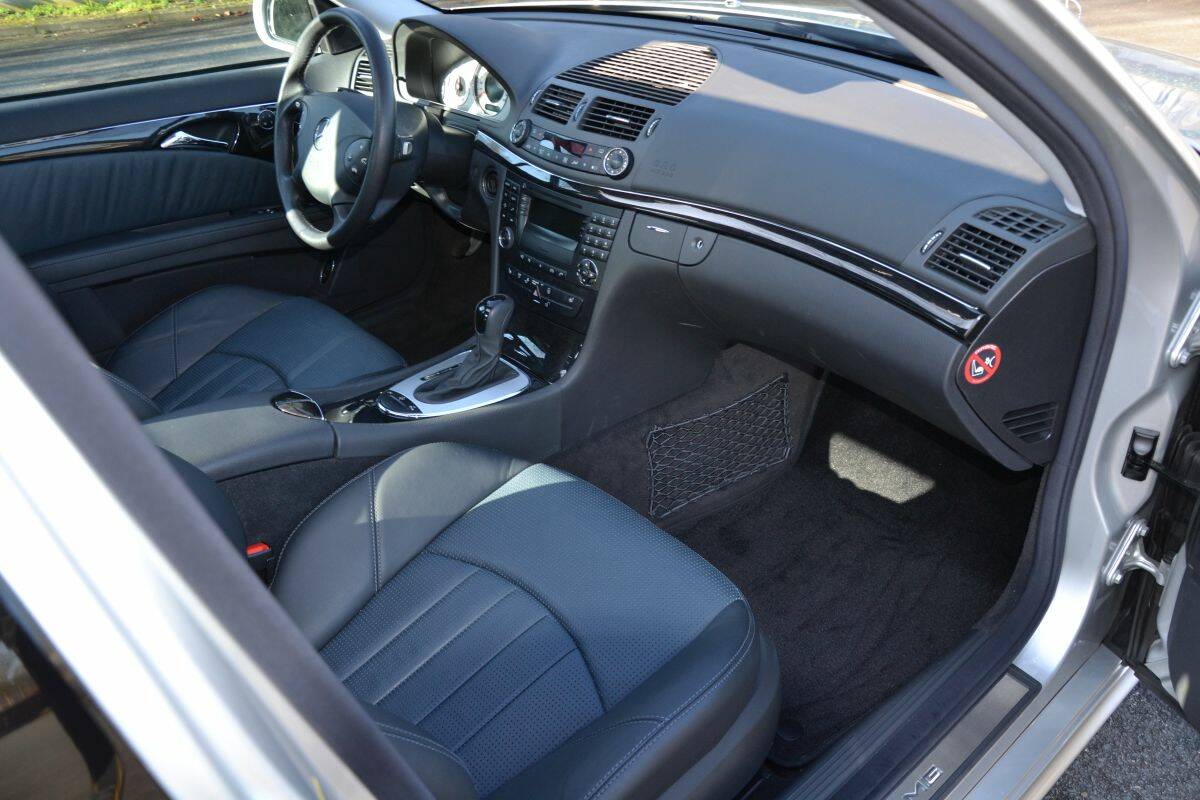 What makes the car particularly special is how these supercar-level performances were wrapped in an understated and elegant package. Enthusiasts will immediately recognize the AMG styling package, the larger wheels with distinctive AMG brake calipers behind them, and the four exhaust tips at the rear. To most people, however, it simply appears to be a beautifully designed Mercedes-Benz sedan. This generation E-Class is exceptionally well balanced in its design, and an important detail is the clean trunk lid without a spoiler lip. Increasingly, examples appear with added spoilers, but AMG never supplied a trunk spoiler for the E55.