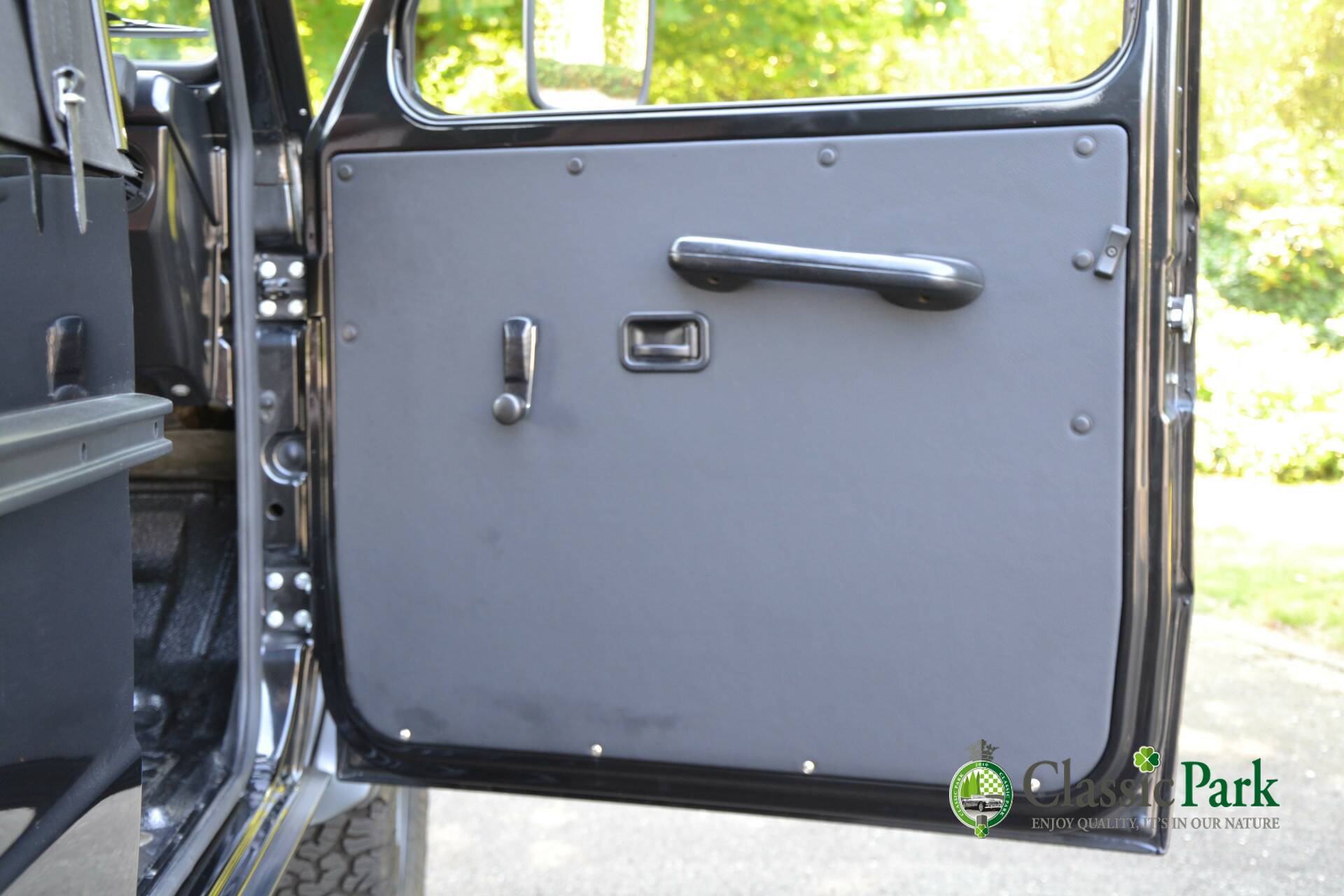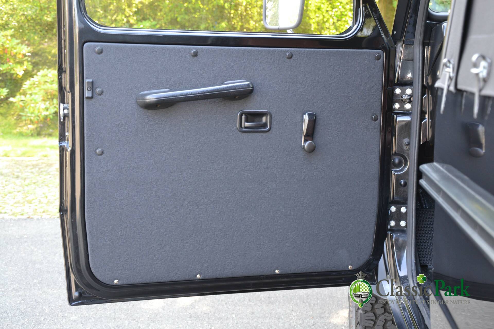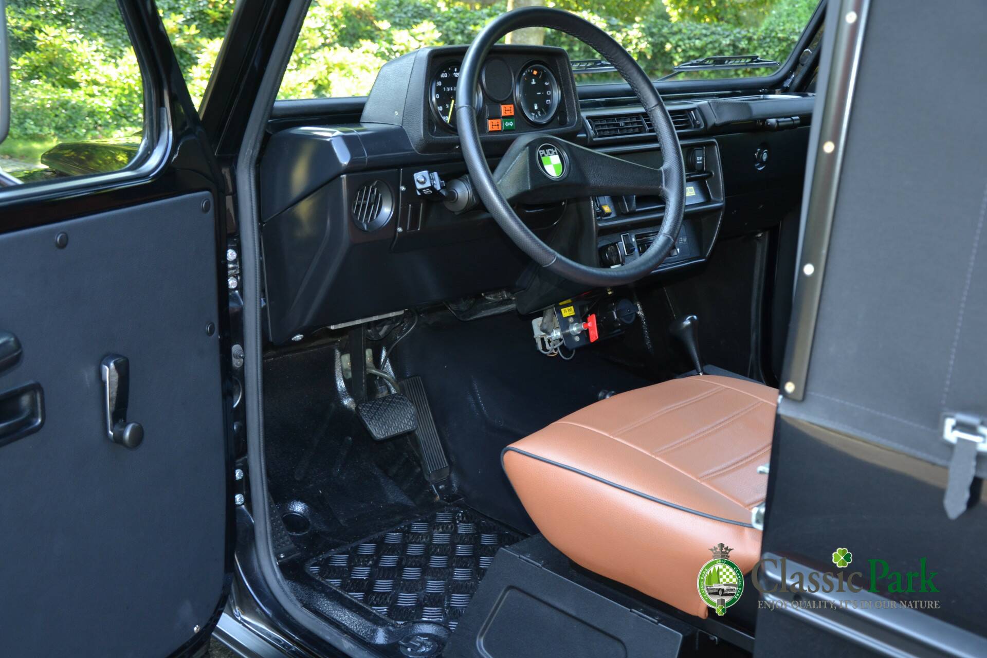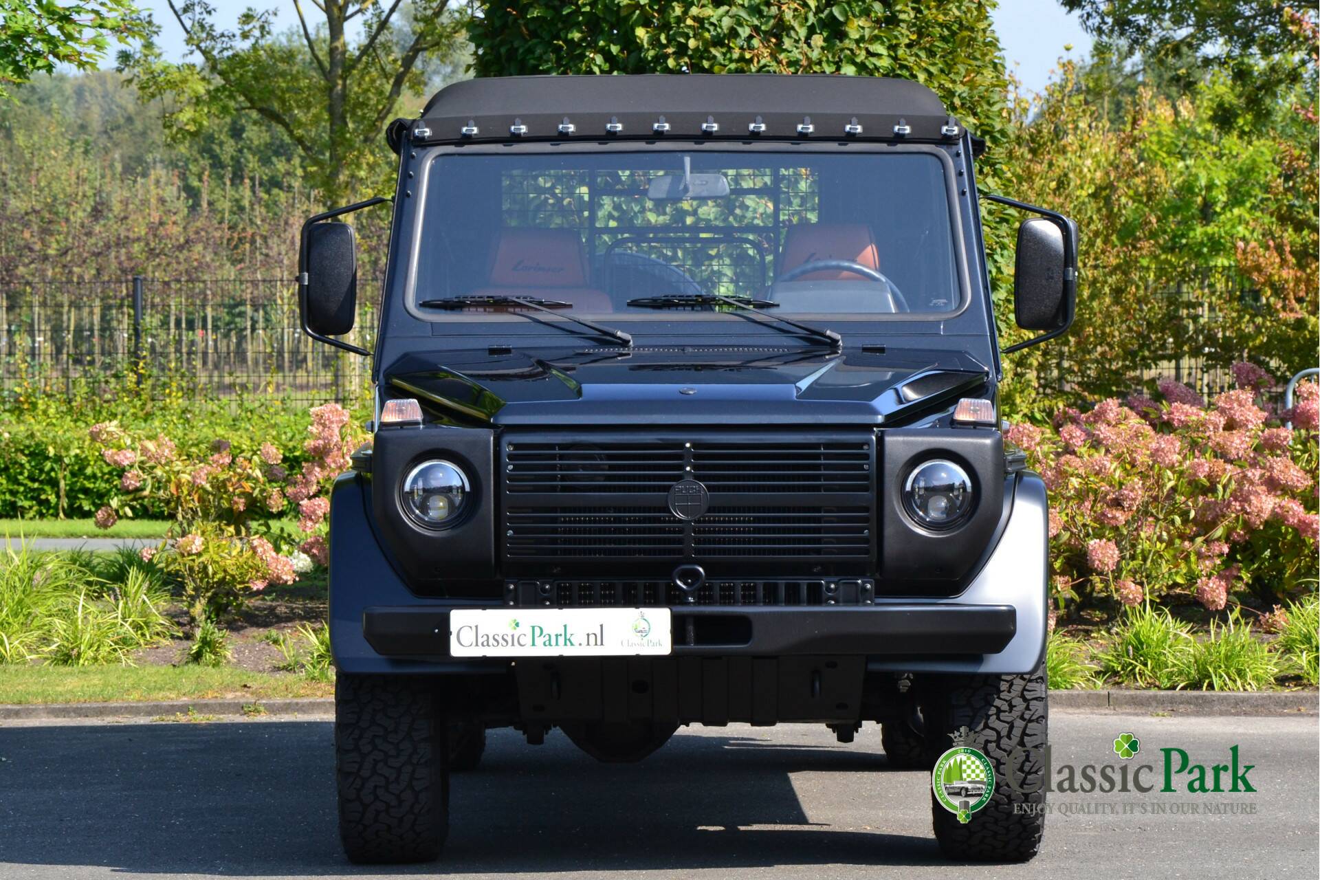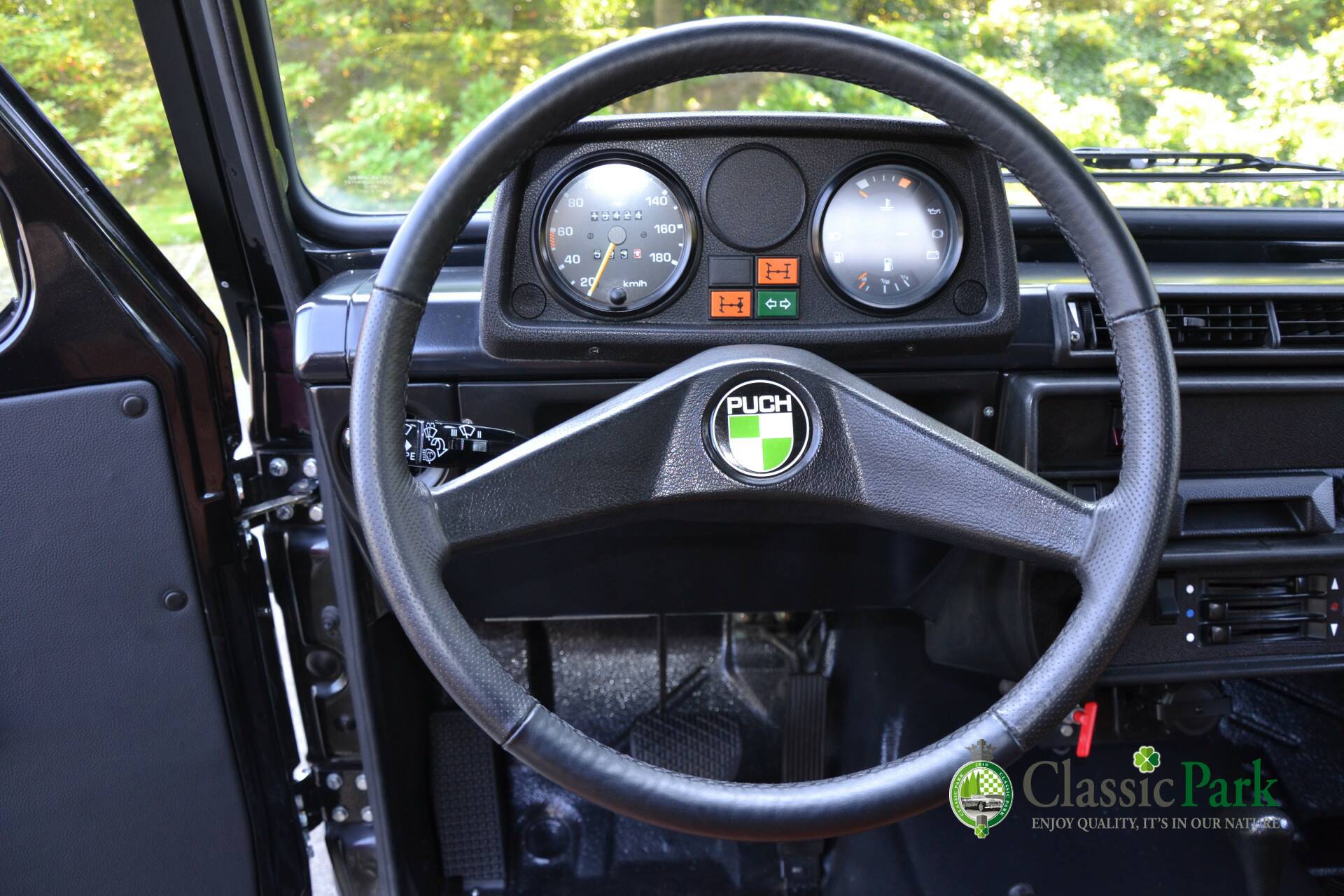 Dieser Puch 230GE verfügt über einen Radstand von 2850 mm und natürlich Allradantrieb. Angetrieben wird er von einem 2,3-Liter-Benzinmotor mit Einspritzung (bekannt als Mercedes-Benz „230“ mit Einspritzung „E“). Das Fahrzeug wurde vom österreichischen Hersteller Steyr-Daimler-Puch gebaut und im Mai 1991 für den militärischen Einsatz ausgeliefert. In den Jahren 2019 bis 2020 wurde das Fahrzeug bei Autohaus Lorinser in Waiblingen, Deutschland, einer umfangreichen Restaurierung unterzogen. Dieser Puch hatte ursprünglich nur wenige Kilometer auf dem Tacho, was typisch ist für Fahrzeuge im Dienst der Bundeswehr. Obwohl der 230GE sehr gut gewartet war, ging Lorinser dennoch rigoros an die Arbeit. Das Fahrzeug wurde komplett zerlegt und neu lackiert. Ein neues, vielseitig zu öffnendes Stoffdach wurde eingebaut, und die Sitze sowie Bänke wurden mit cognacfarbenem Leder neu bezogen. Die Bereifung wurde durch BFGoodrich All-Terrain T/A Reifen ersetzt. Der Motor erhielt sowohl eine gründliche technische Überholung als auch eine optische Aufbereitung, sodass er nun perfekt zum makellosen Gesamtbild des Fahrzeugs passt.