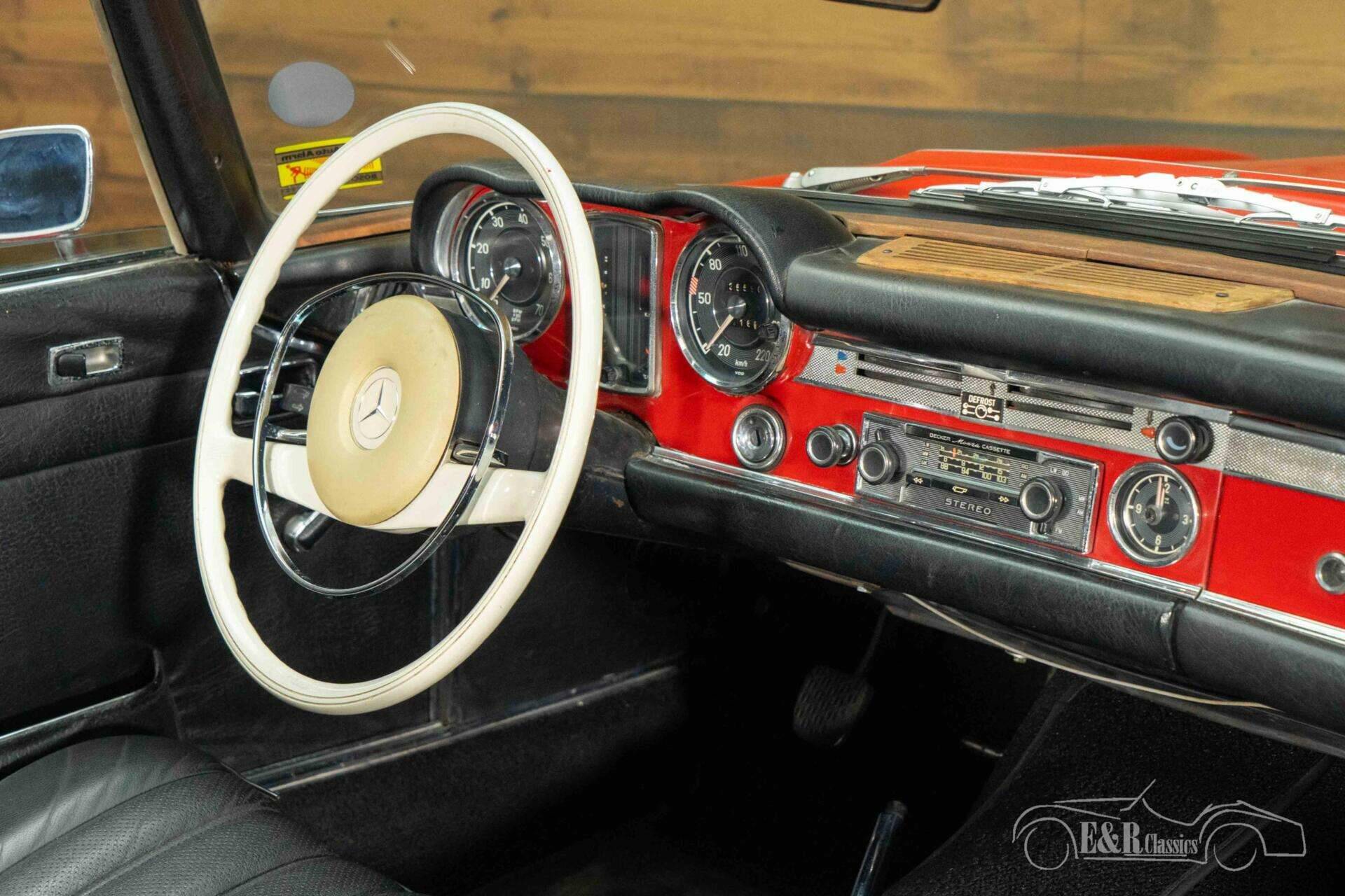 The exterior features beautiful Signal Rot paintwork, which perfectly complements the Pagoda's elegant lines. The car is fitted with the desirable crown-cork rims and spotlights at the front, subtly emphasizing its sporty character. Both the black soft top and matching hard top are included, making the car suitable for any season. The interior is stylish and inviting, with black leather contrasting beautifully with the red exterior. The classic Becker Monza radio enhances the original look and underscores the attention to detail. Together, the exterior and interior form a harmonious whole, making this 280 SL a particularly attractive classic.