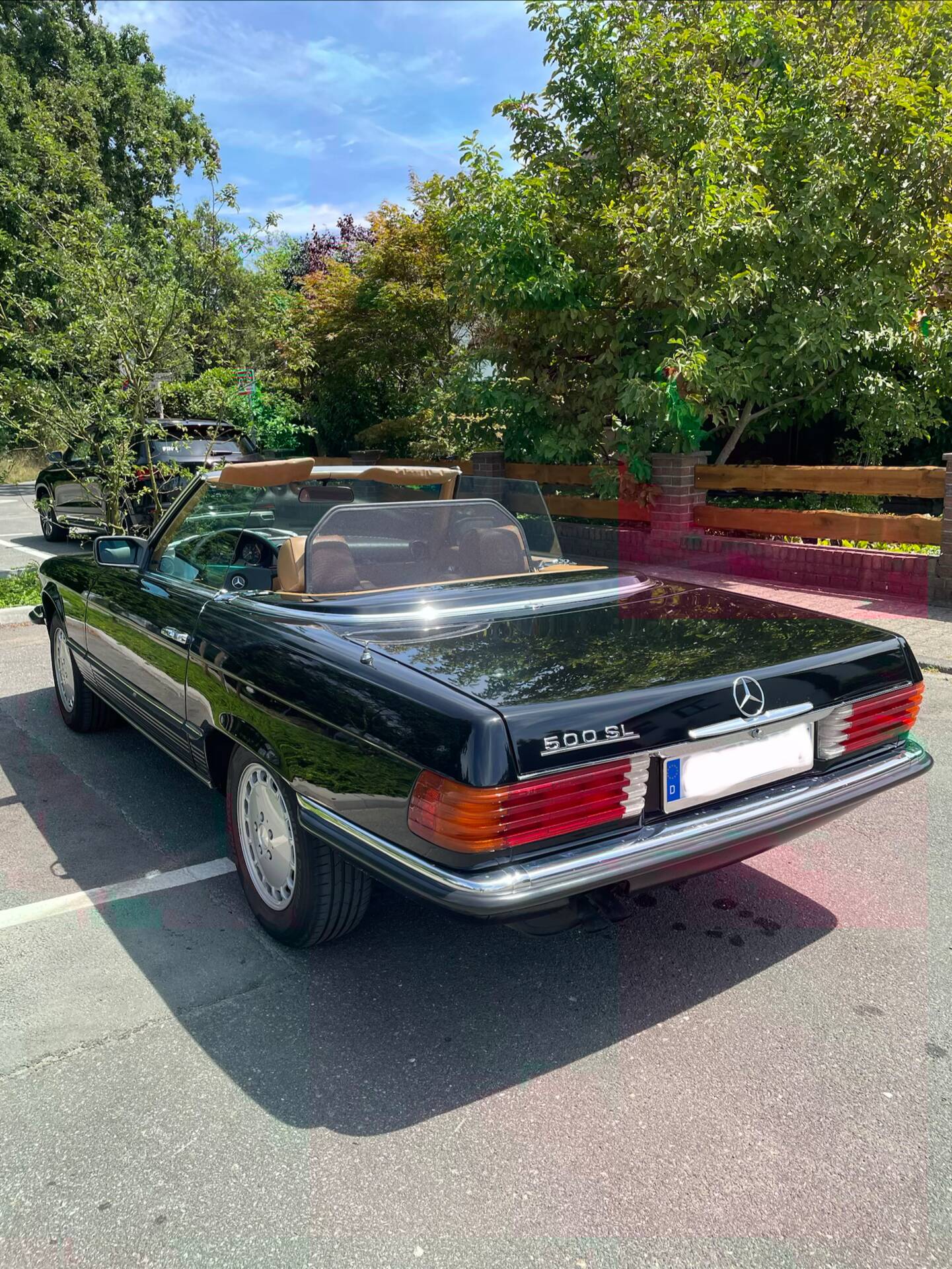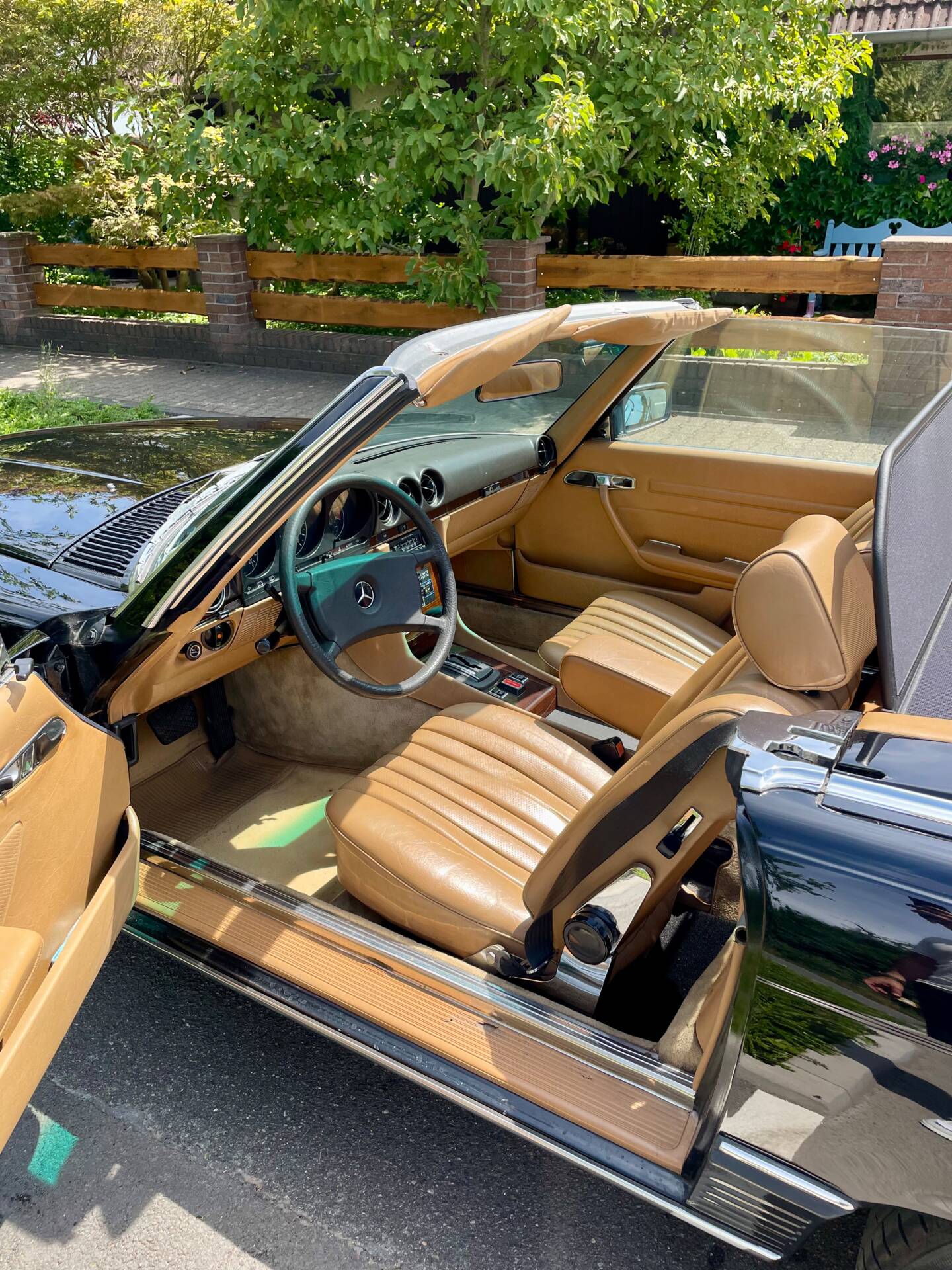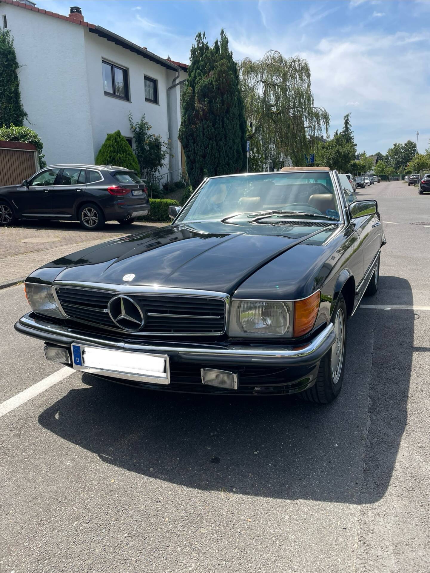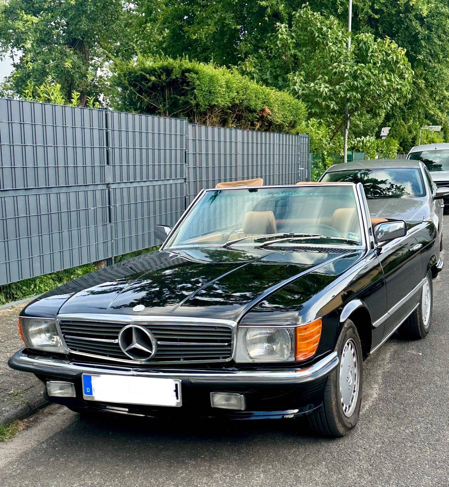 Zum Verkauf steht ein Mercedes-Benz SL 450 (R107) in schwarz mit beigem Lederinterieur, präsentiert sich in sehr gepflegtem Zustand.