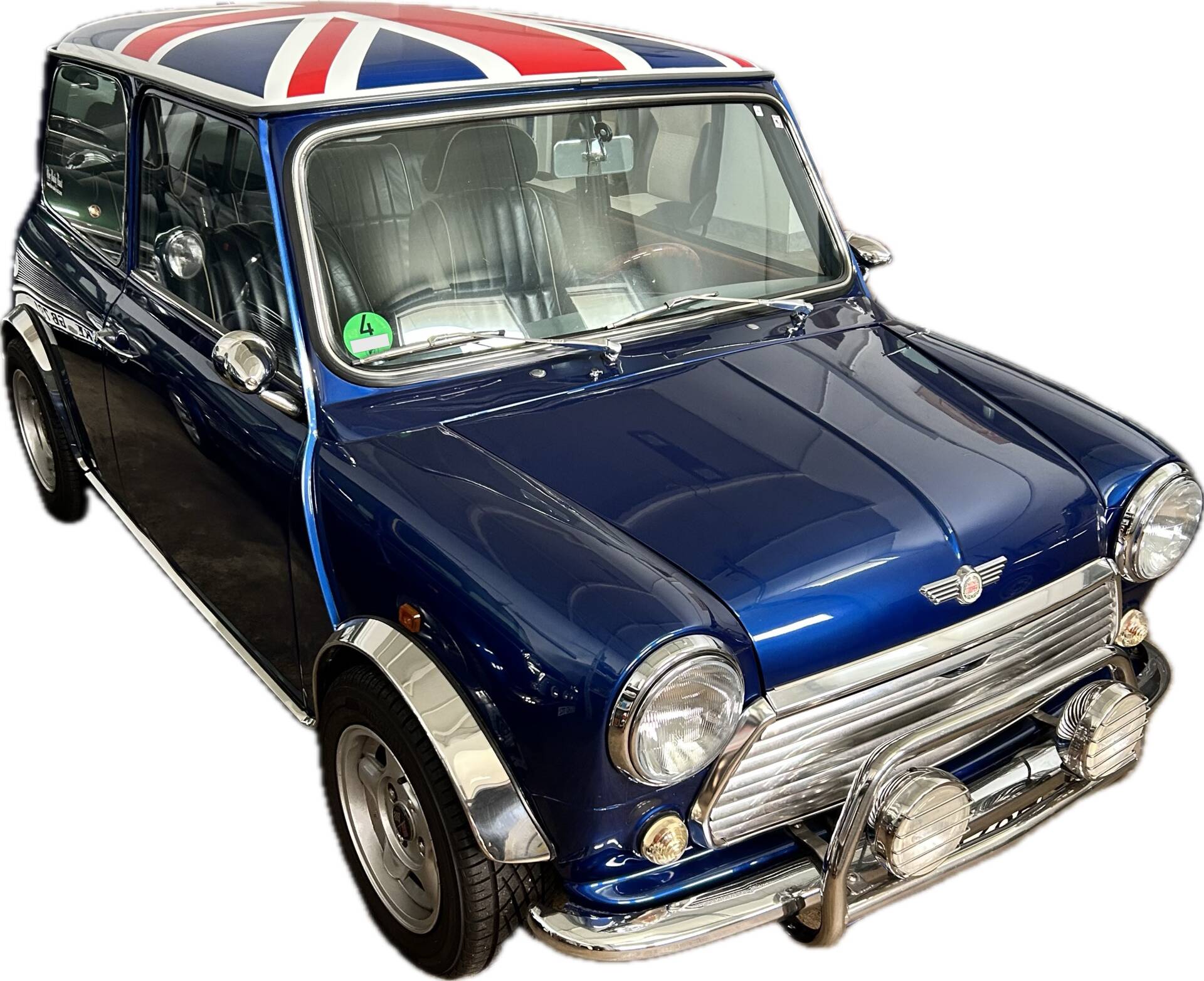Die seltene blaue Lederausstattung, sowie die blauen Türverkleidungen sind in einem hervorragenden Zustand aus einem späteren Mini MPI. Dazu passend sind blaue Sicherheitsgurte verbaut.