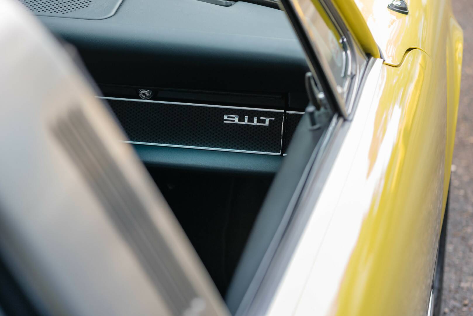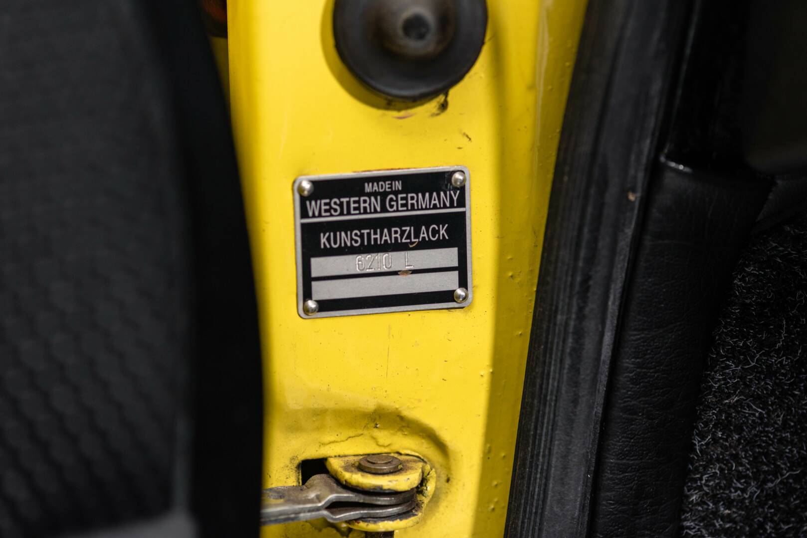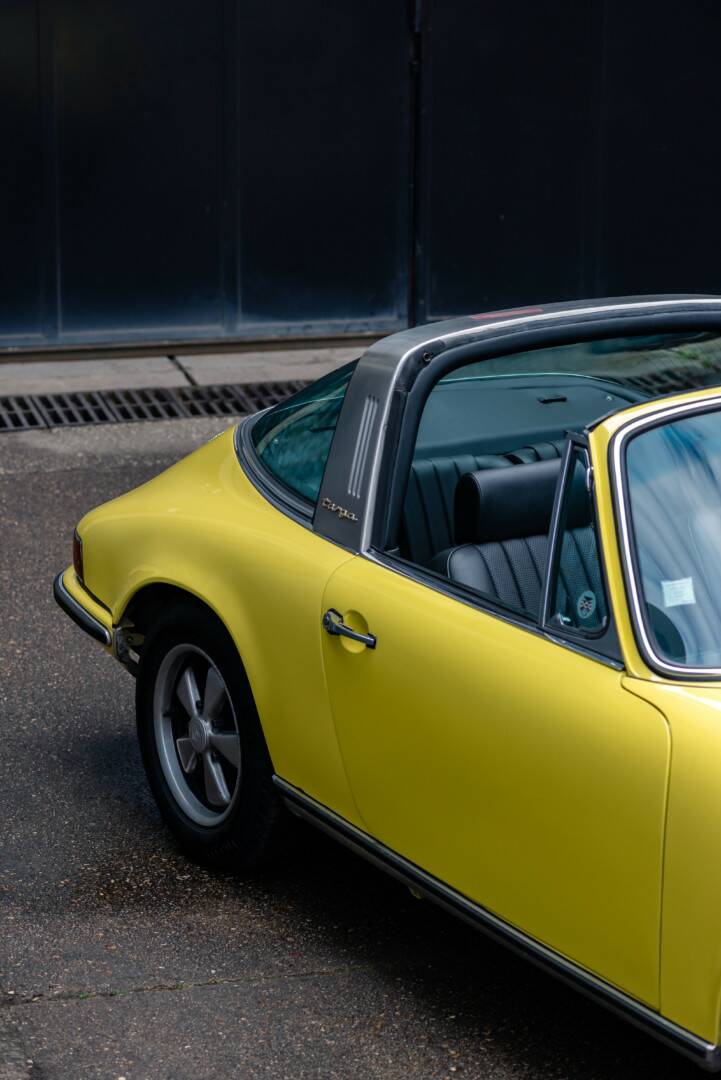 La Porsche 911 se présente dans un état remarquable, avec des ajustements de capots et de portes très soignés. La carrosserie est actuellement en Canary Yellow, lumineuse et homogène.