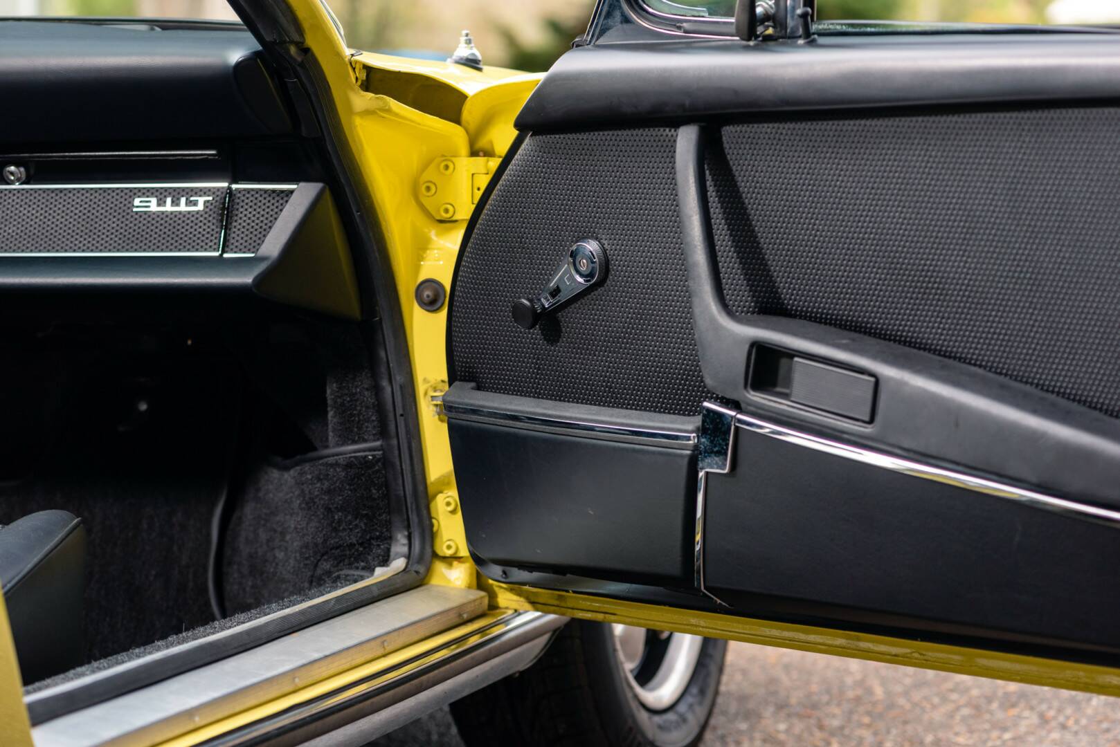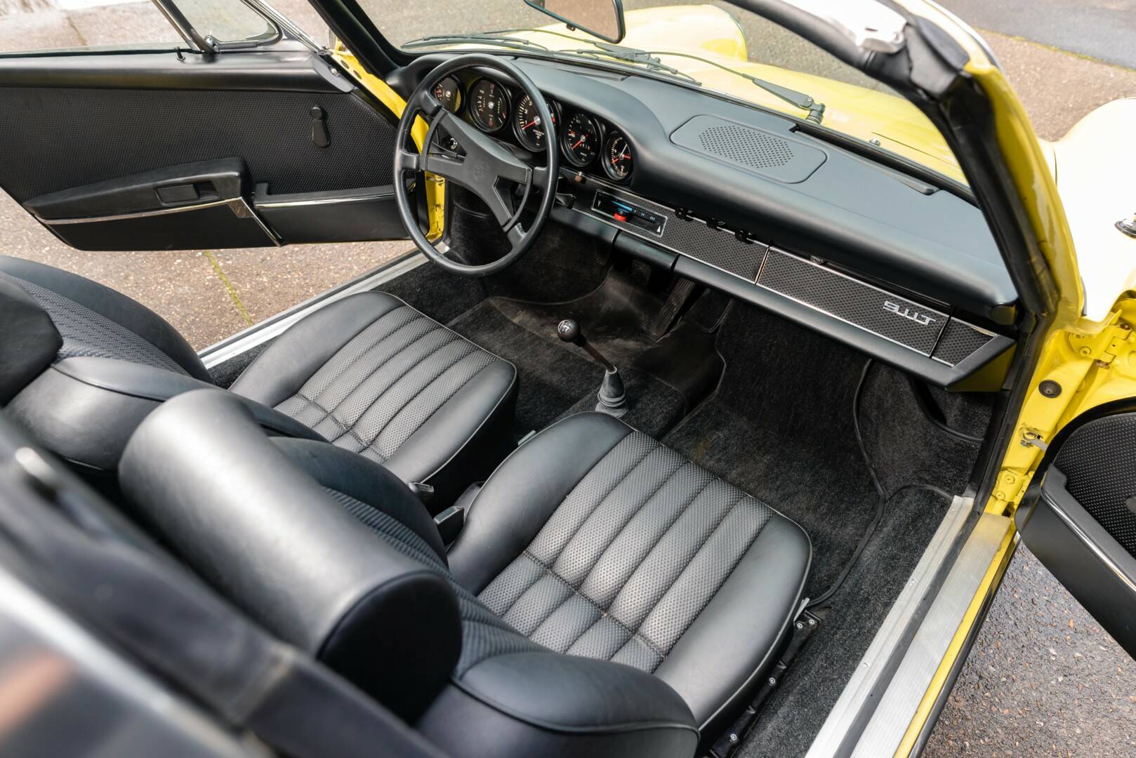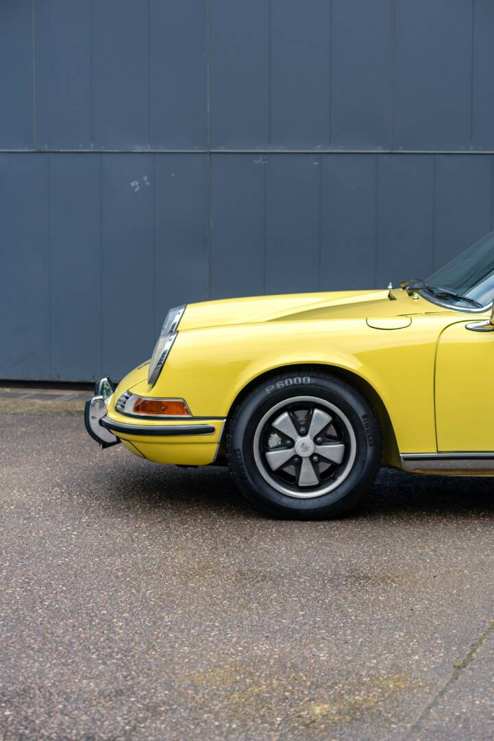 La Porsche 911 se présente dans un état remarquable, avec des ajustements de capots et de portes très soignés. La carrosserie est actuellement en Canary Yellow, lumineuse et homogène.
